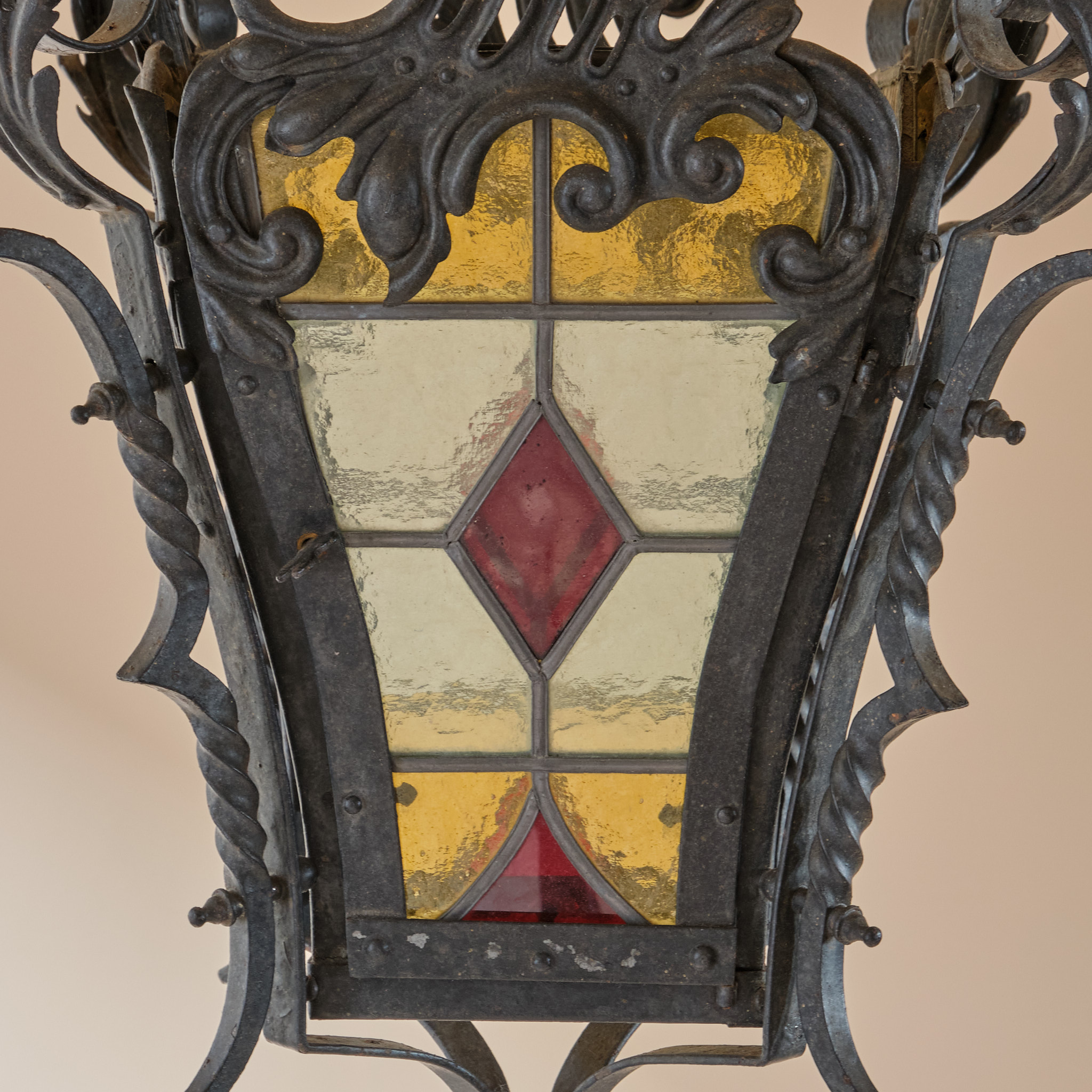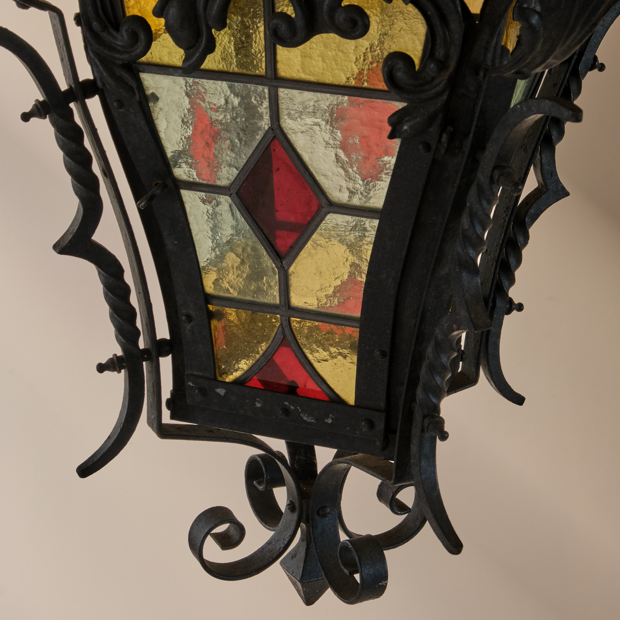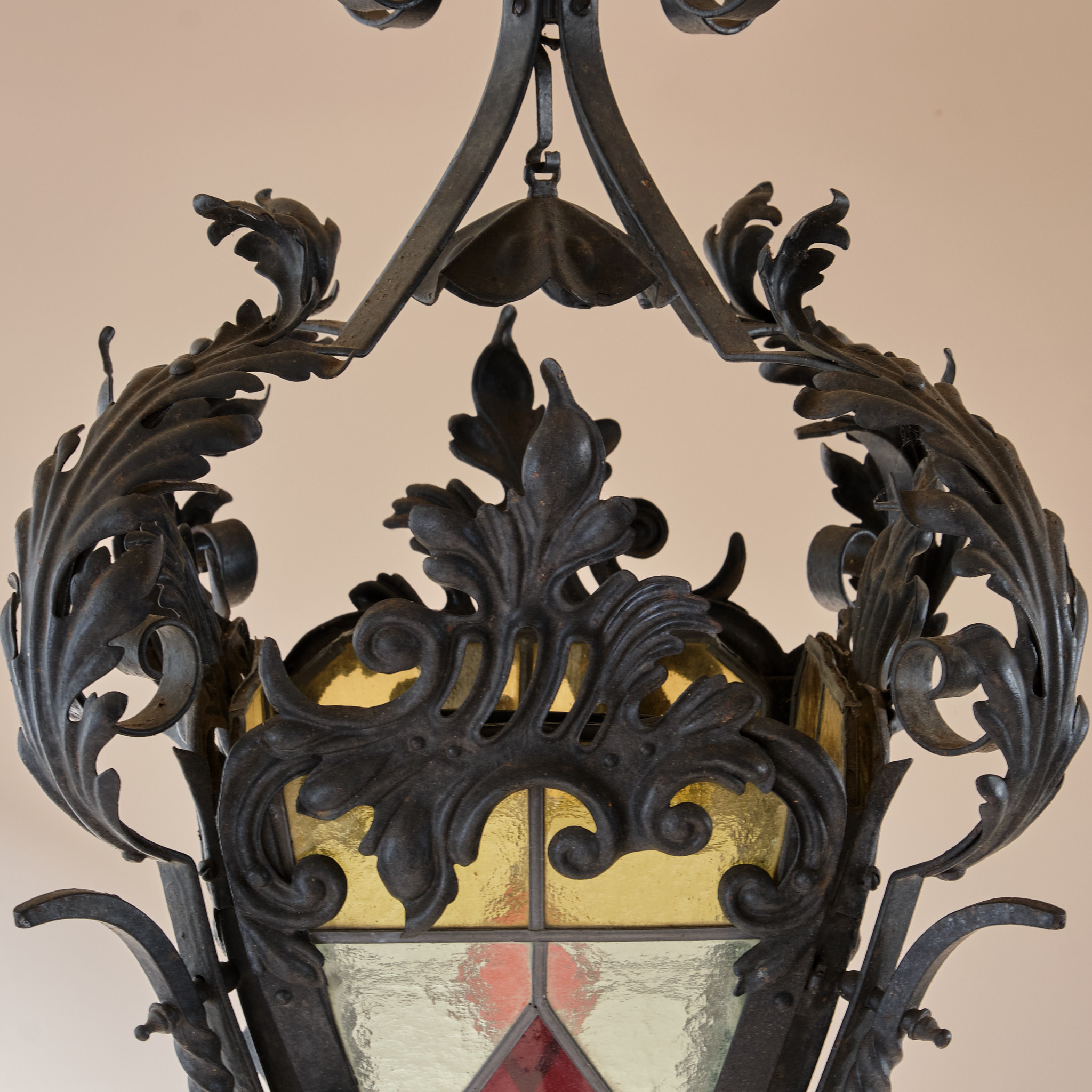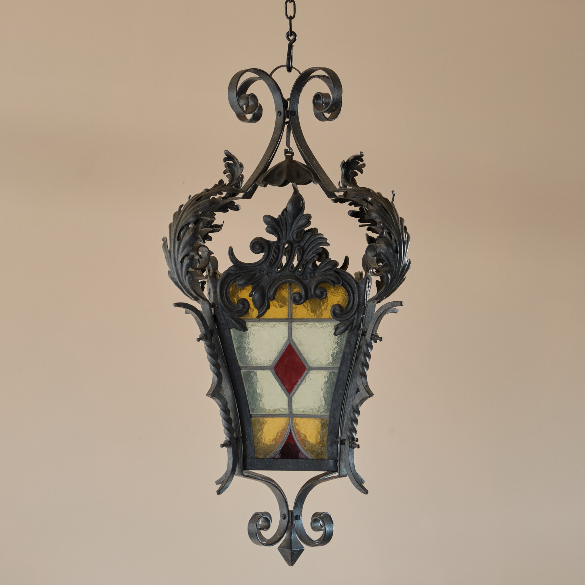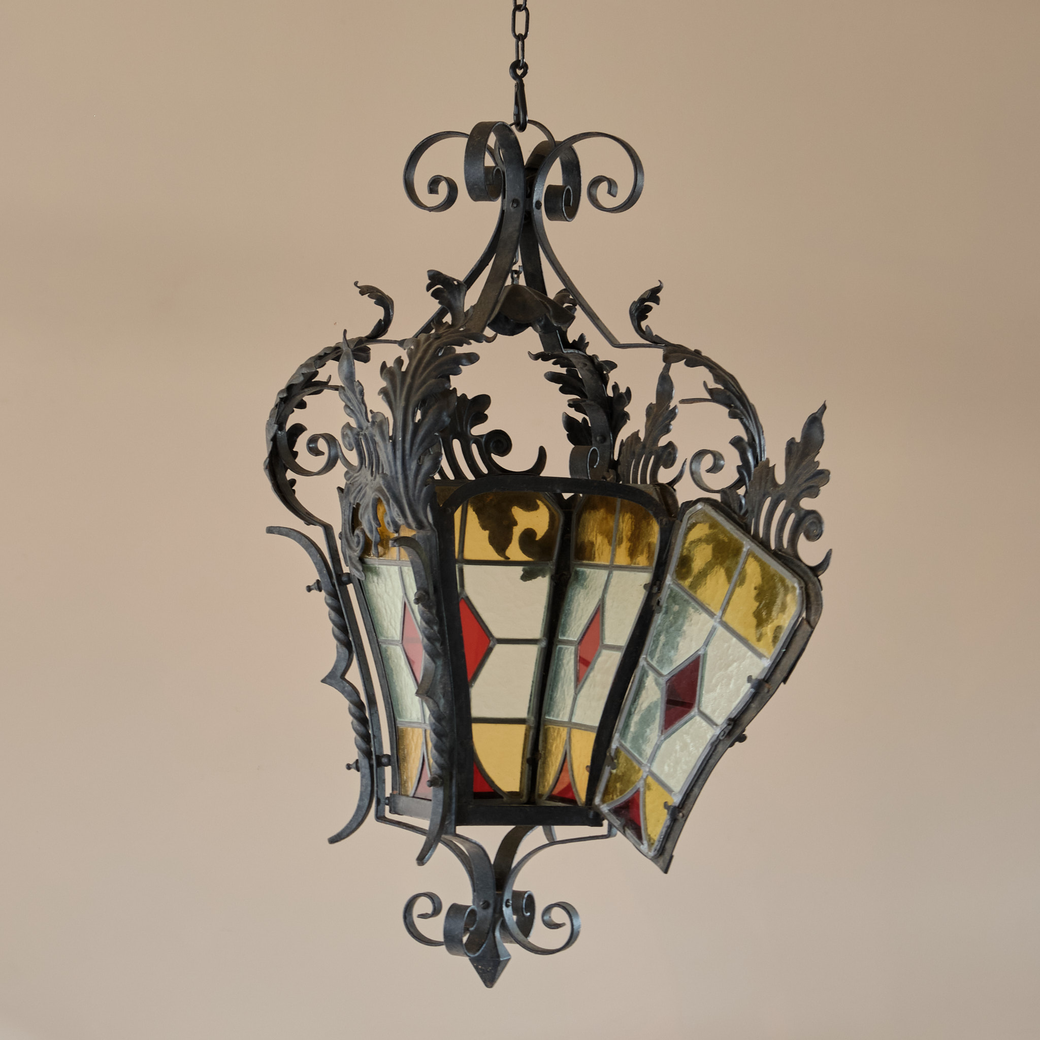 A late 19th century Stained glass and wrought iron lantern.
