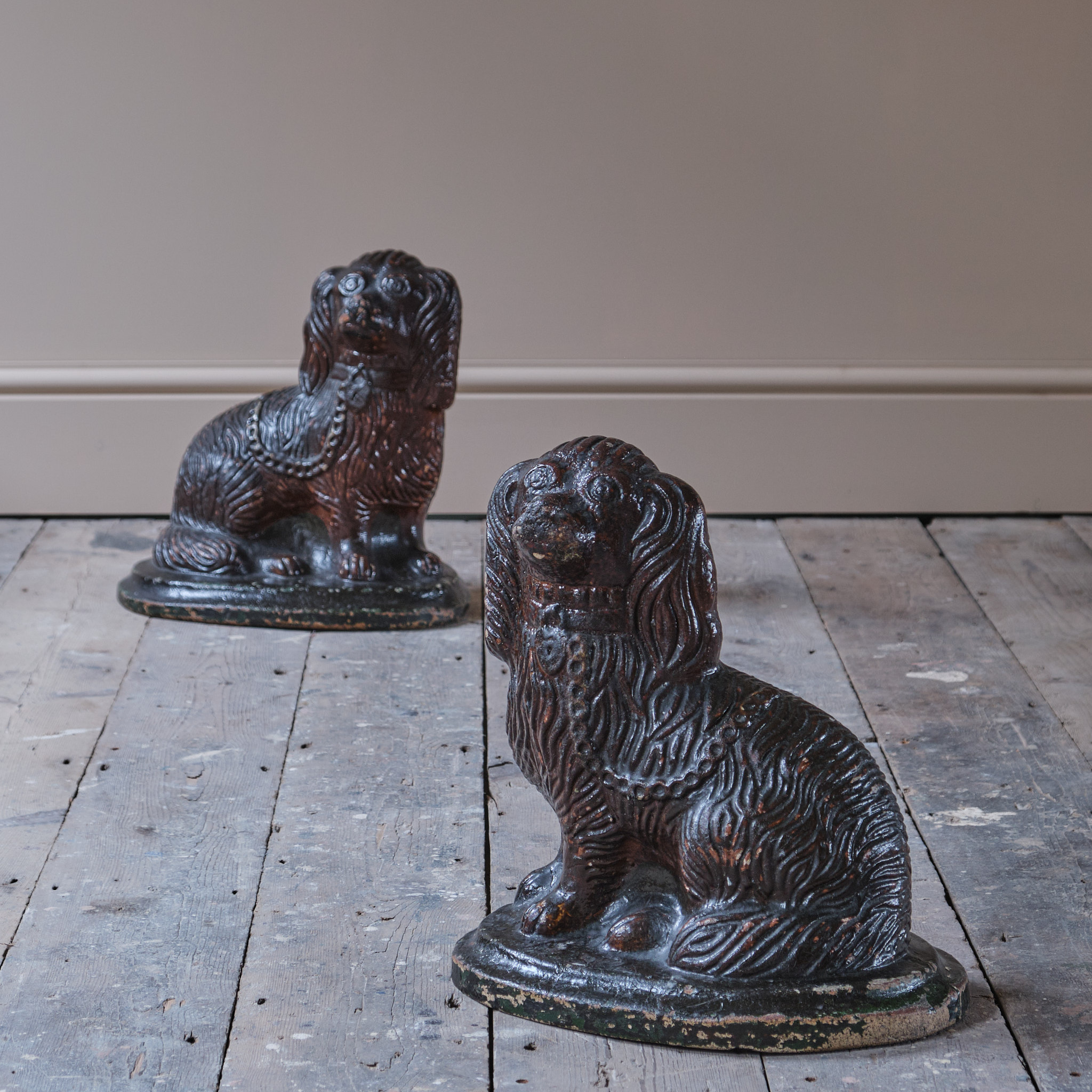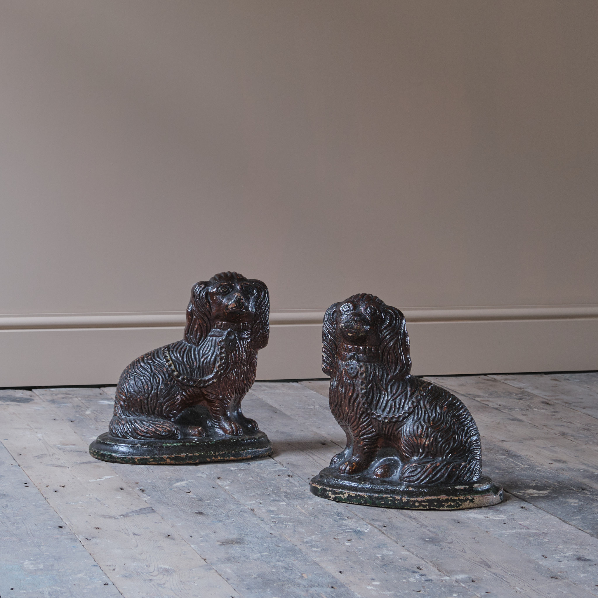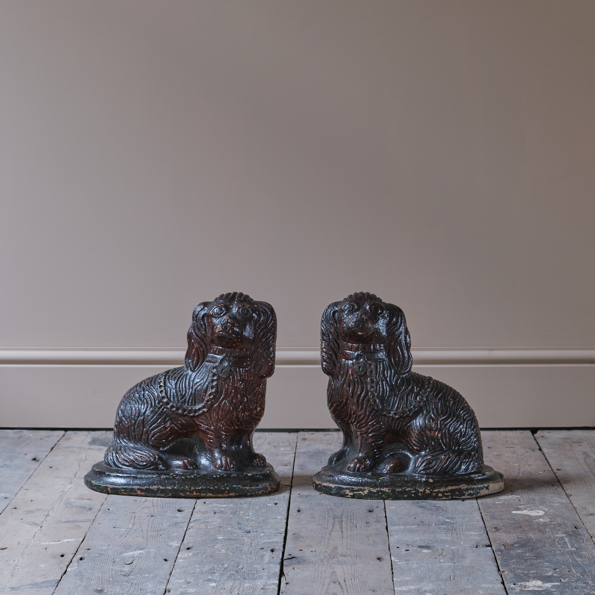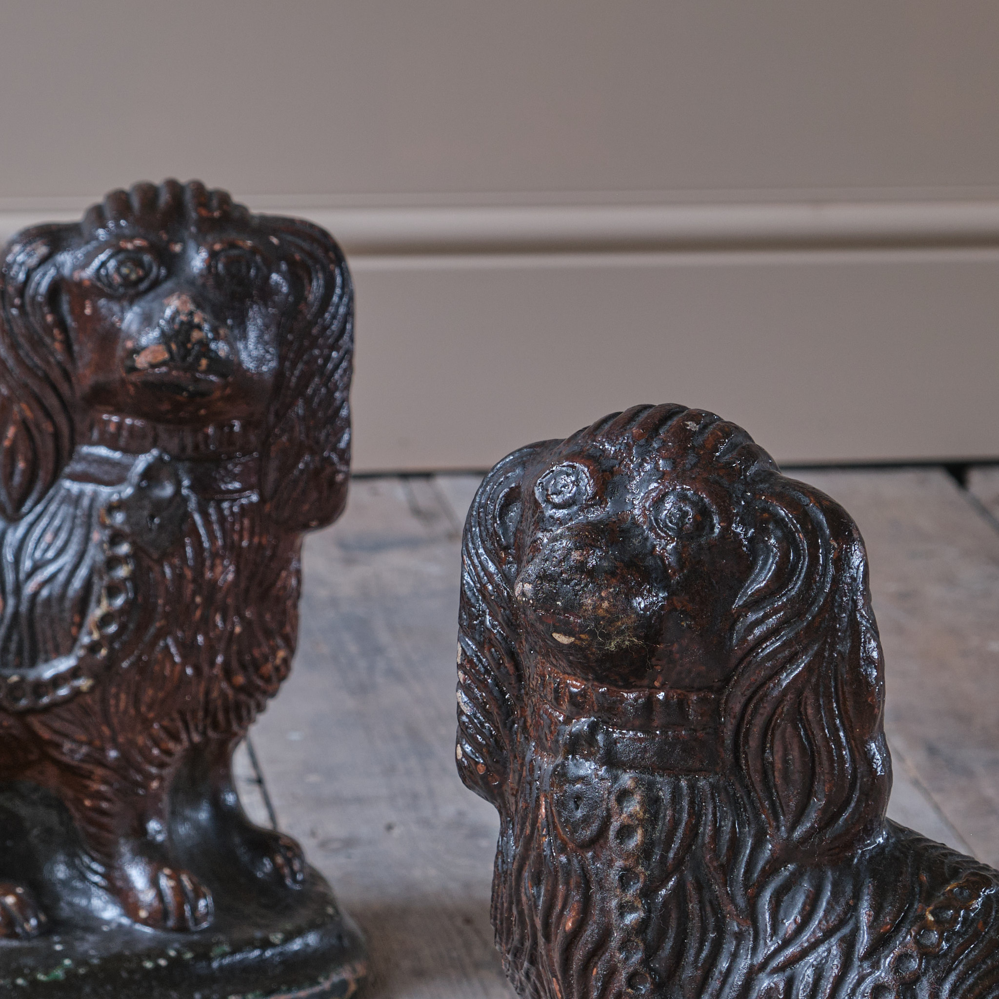 A pair of 19th century brown salt glazed seated spaniels on raised green bases. English C mid 19th century.