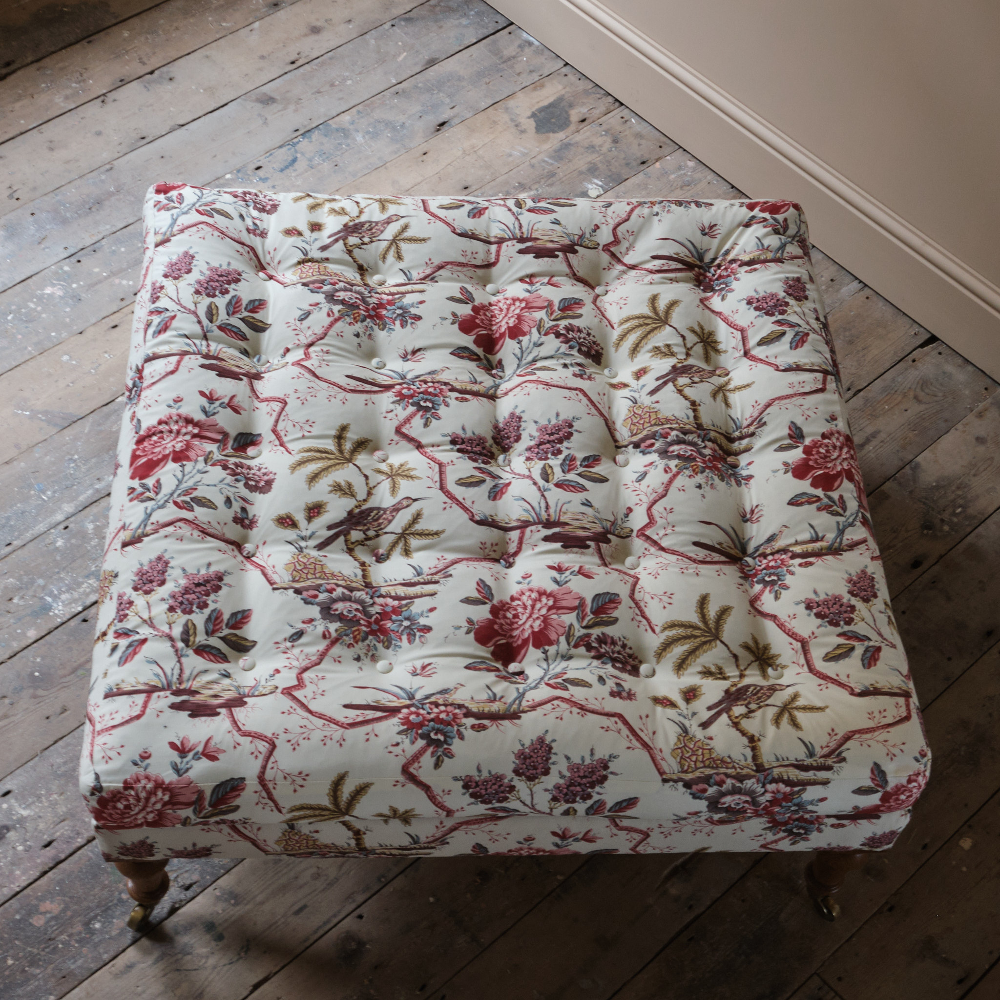 A large bespoke made country house footstool. Raised on 4 turned oak legs capped with Desired Effect reproduction brass casters, cast 19th century originals. The traditionally made frame and the tufted feather top are covered in Pierre Frey 'Comtesse De Mailly' printed cotton.