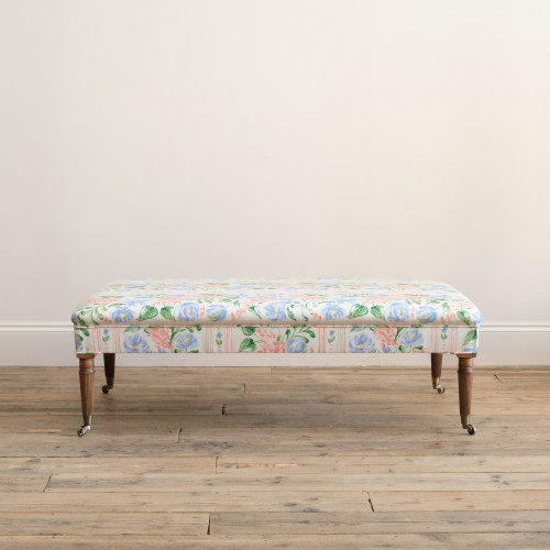 A large country house inspired footstool. Raised on 19th century turned beach legs with the original large spoked brass casters. The frame traditionally made and upholstered with a feather cushioned top ready for your choice of fabric.