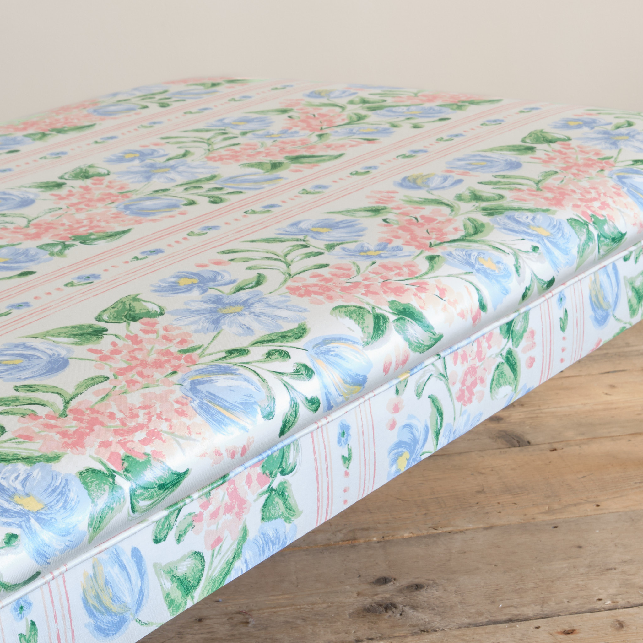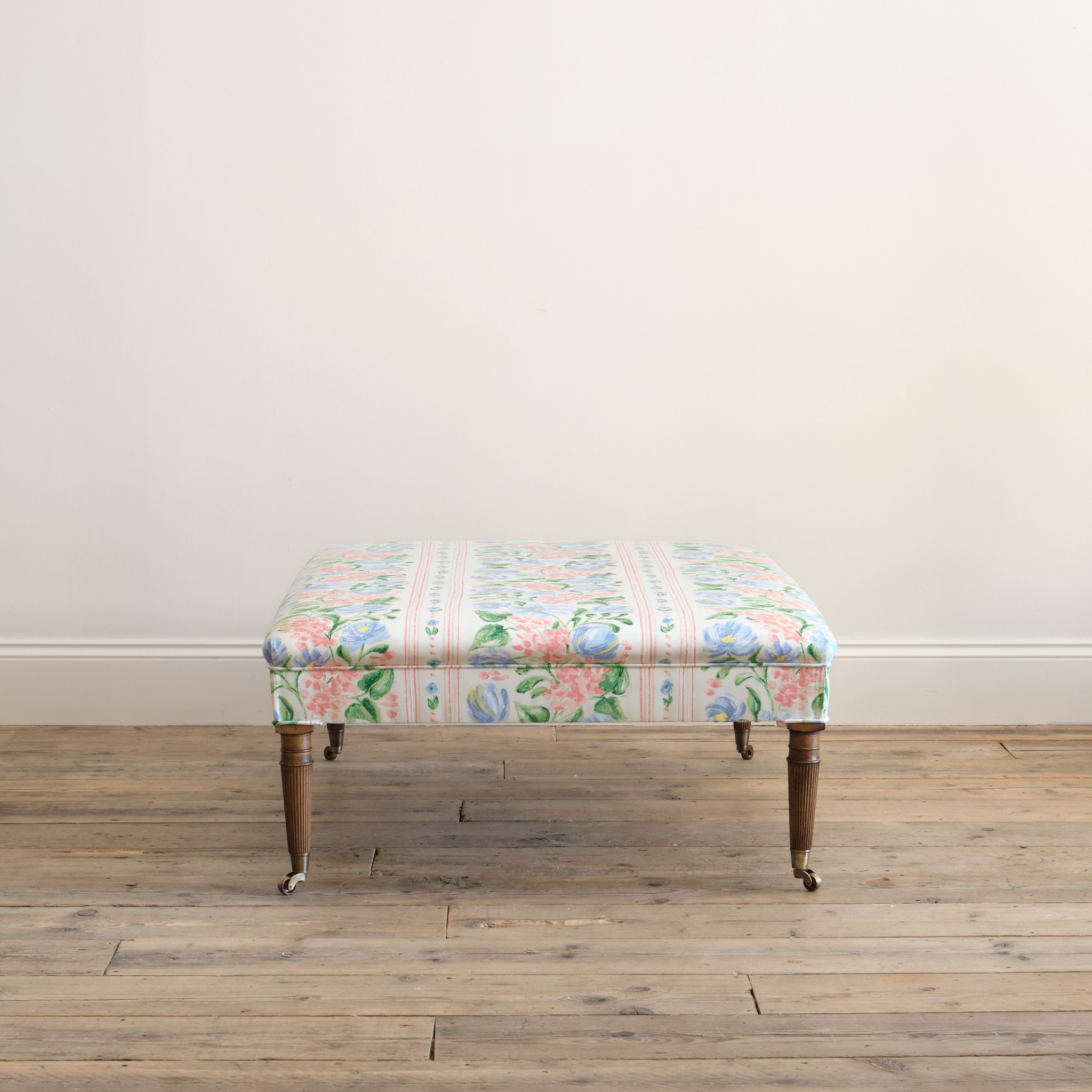 A large country house inspired footstool. Upholstered glazed floral chintz cotton. Raised on turned beech and reeded legs and casters.