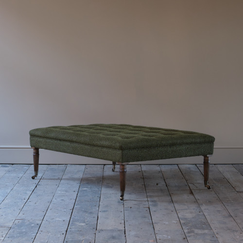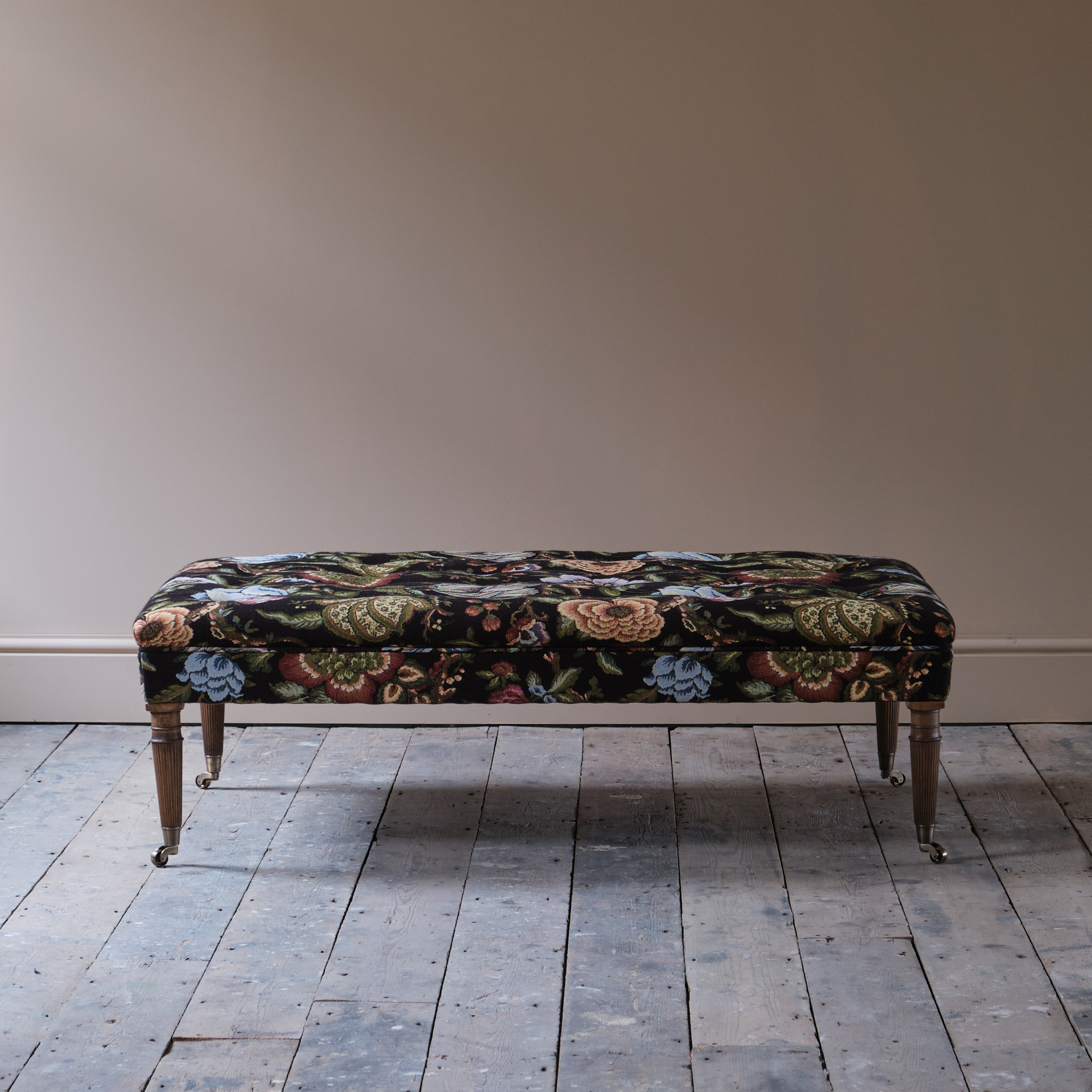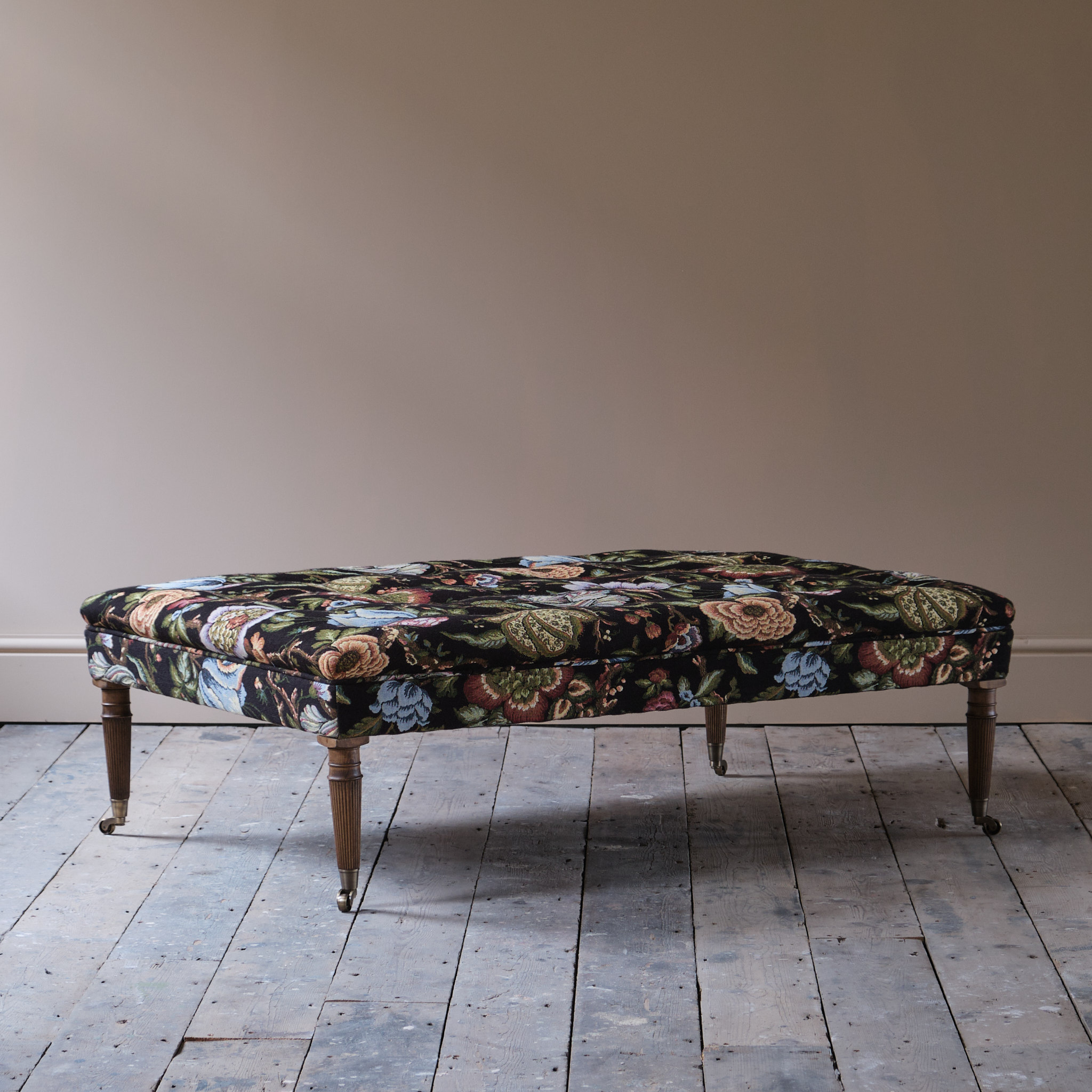 A large country house inspired footstool. Upholstered in floral Jacquard chintz. Raised on turned beech and reeded legs and casters.