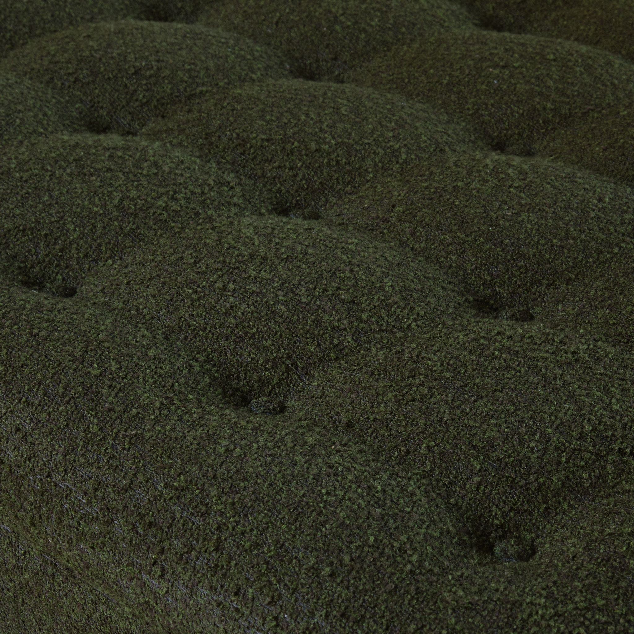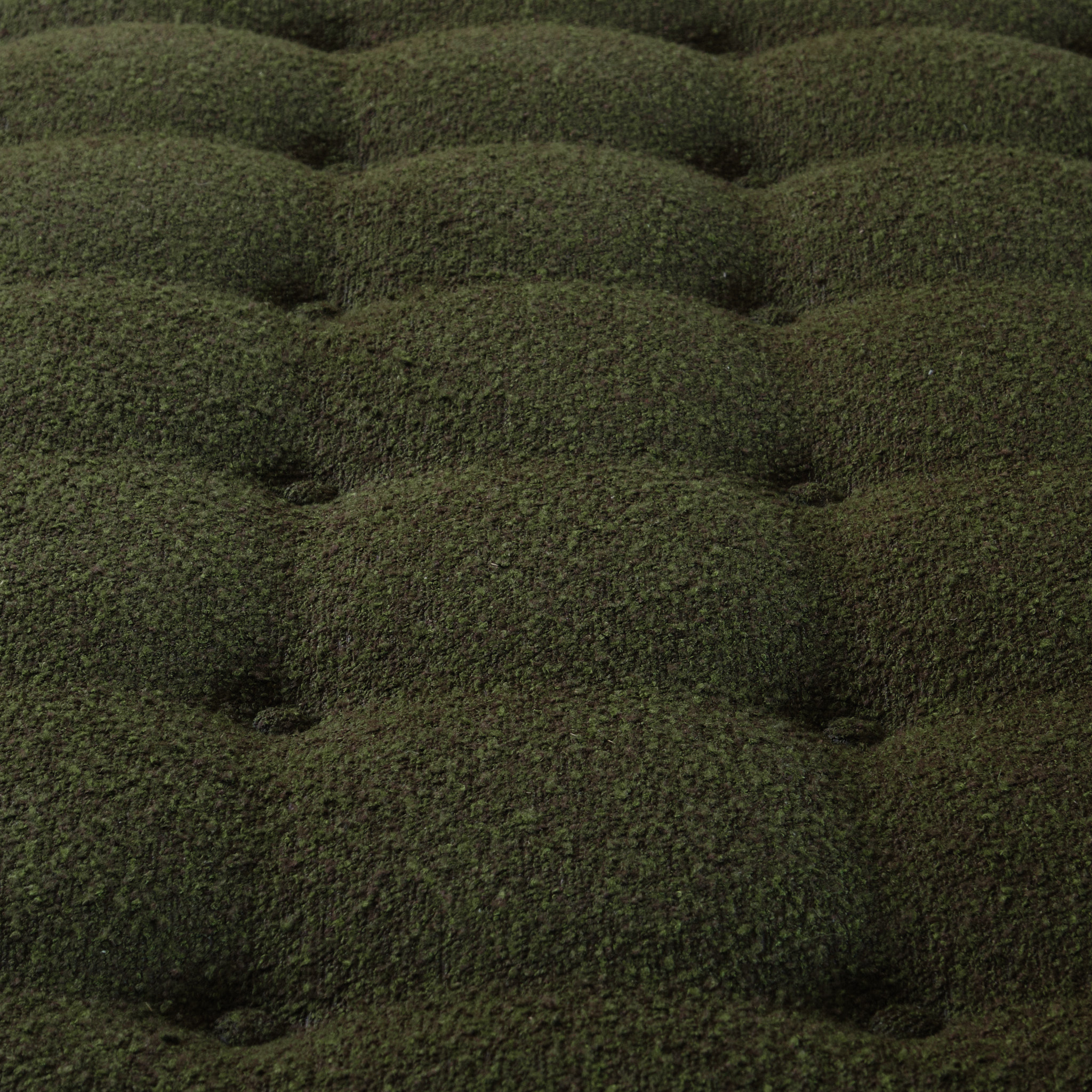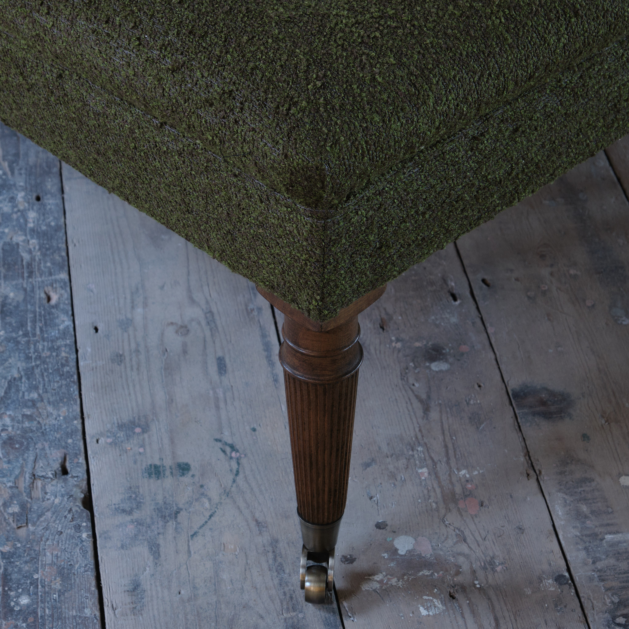 A large country house inspired footstool. Upholstered in green Boucle. Raised on turned beech and reeded legs and casters.