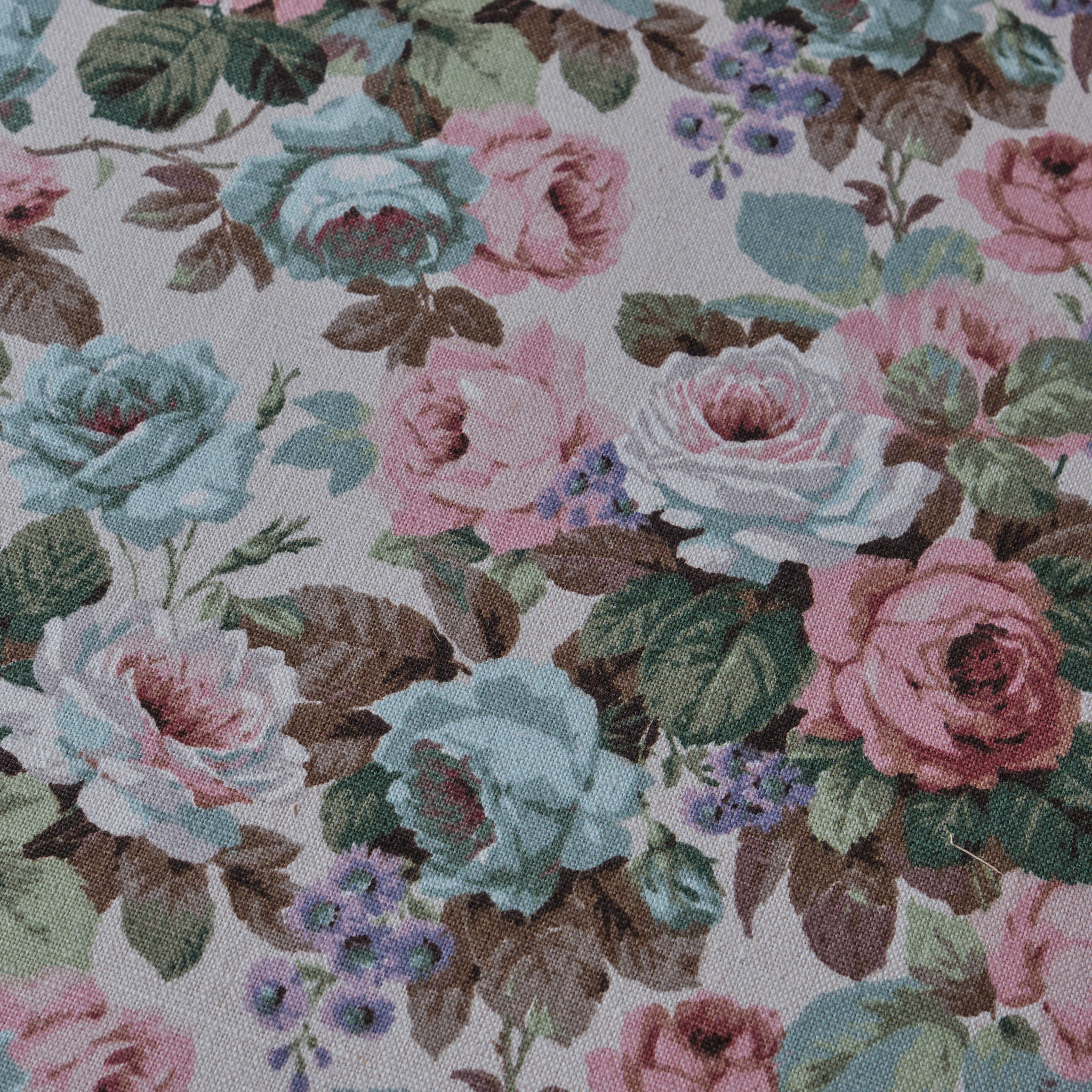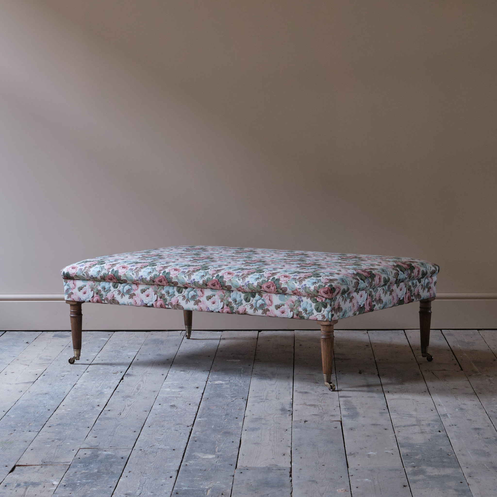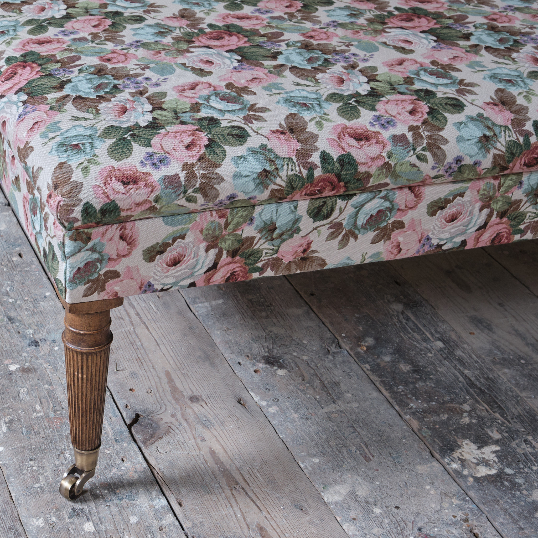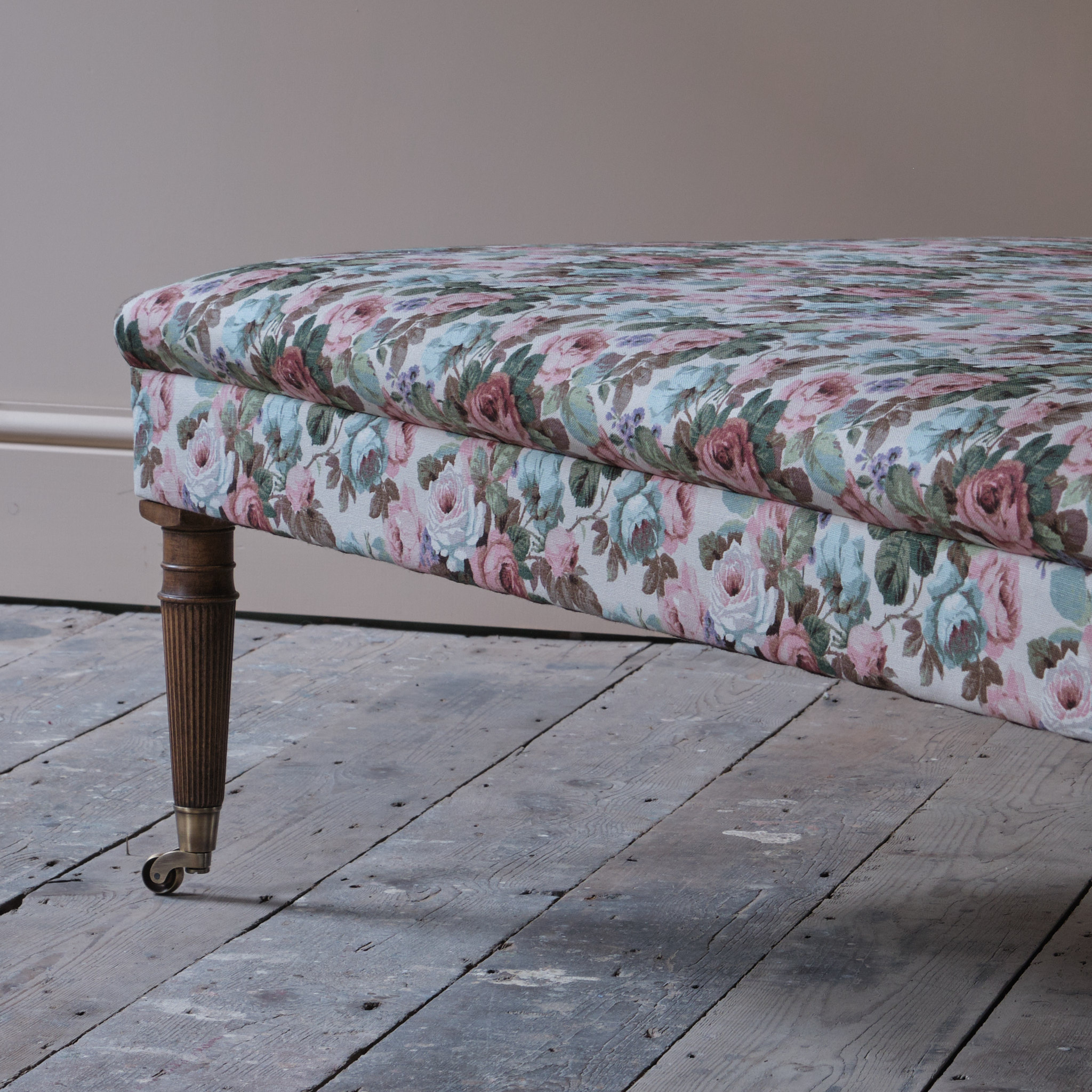 A large country house inspired footstool. Upholstered in vintage Sanderson 'Chelsea Ivory'. Raised on turned beech and reeded legs and casters.
