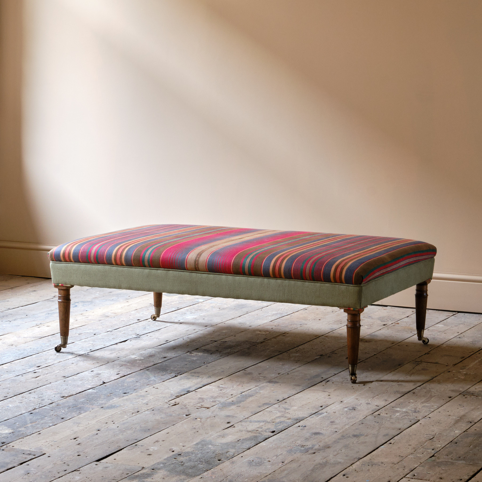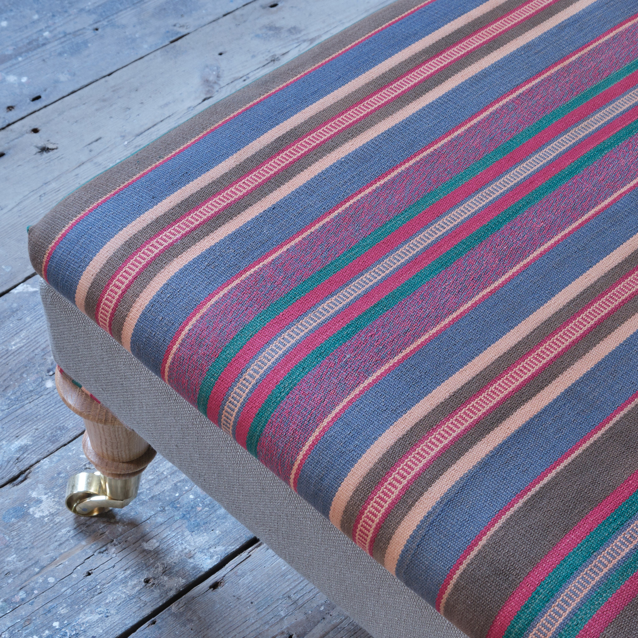 A large country house inspired footstool. Upholstered in a vintage flat weave rug top and linen boarder. Raised on low turned oak and legs and casters. The vintage rug does have the odd mark to it but doesn't have any holes.