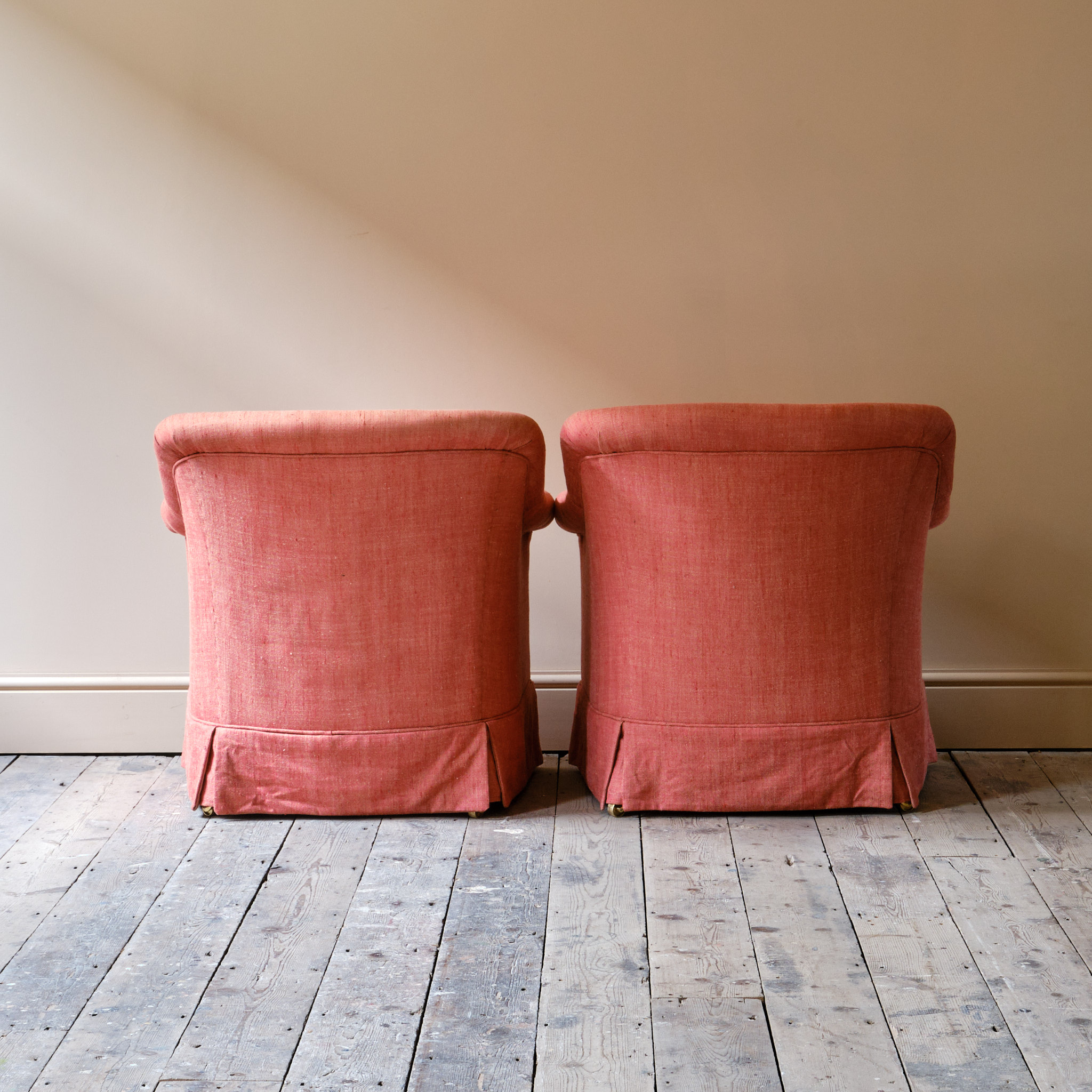 A Pair Howard and sons style 'Pickwell' model armchairs. Raised on square tapered beech legs and brass casters. Of recent manufacture and of the quality and materials of George smith and Howard chairs.