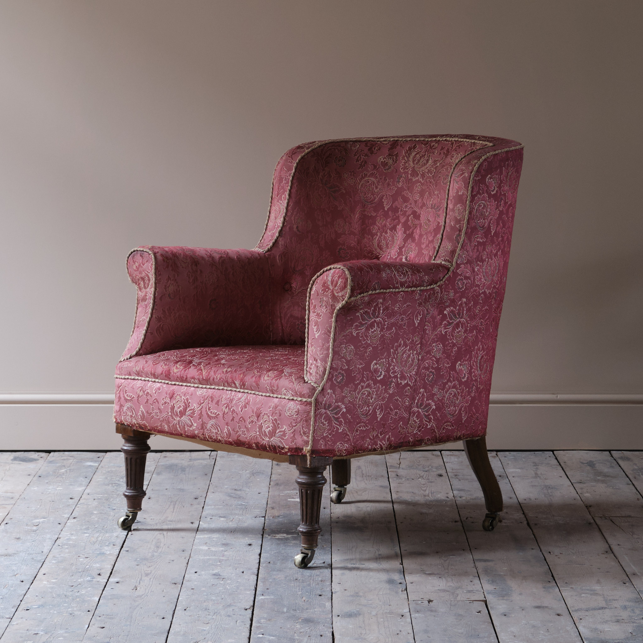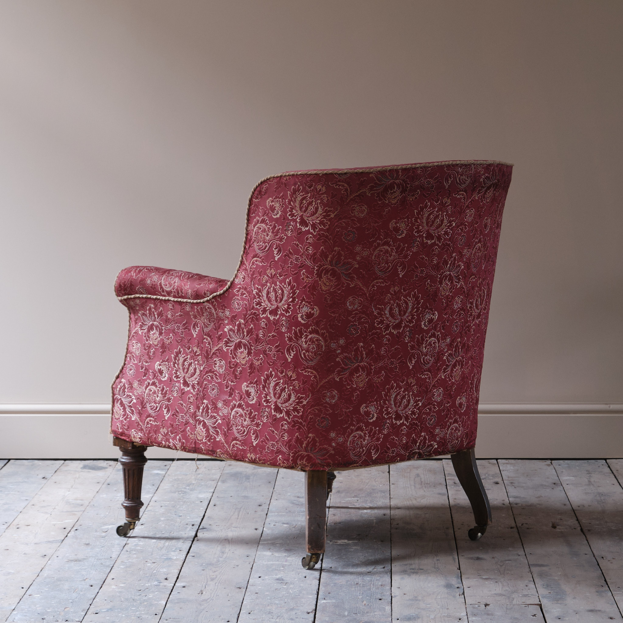 A shapely late 19th century country house barrel back armchair. Raised on turned and fluted front legs and splayed rear legs all retaining the original casters. An unusual model with a low back. English c1880