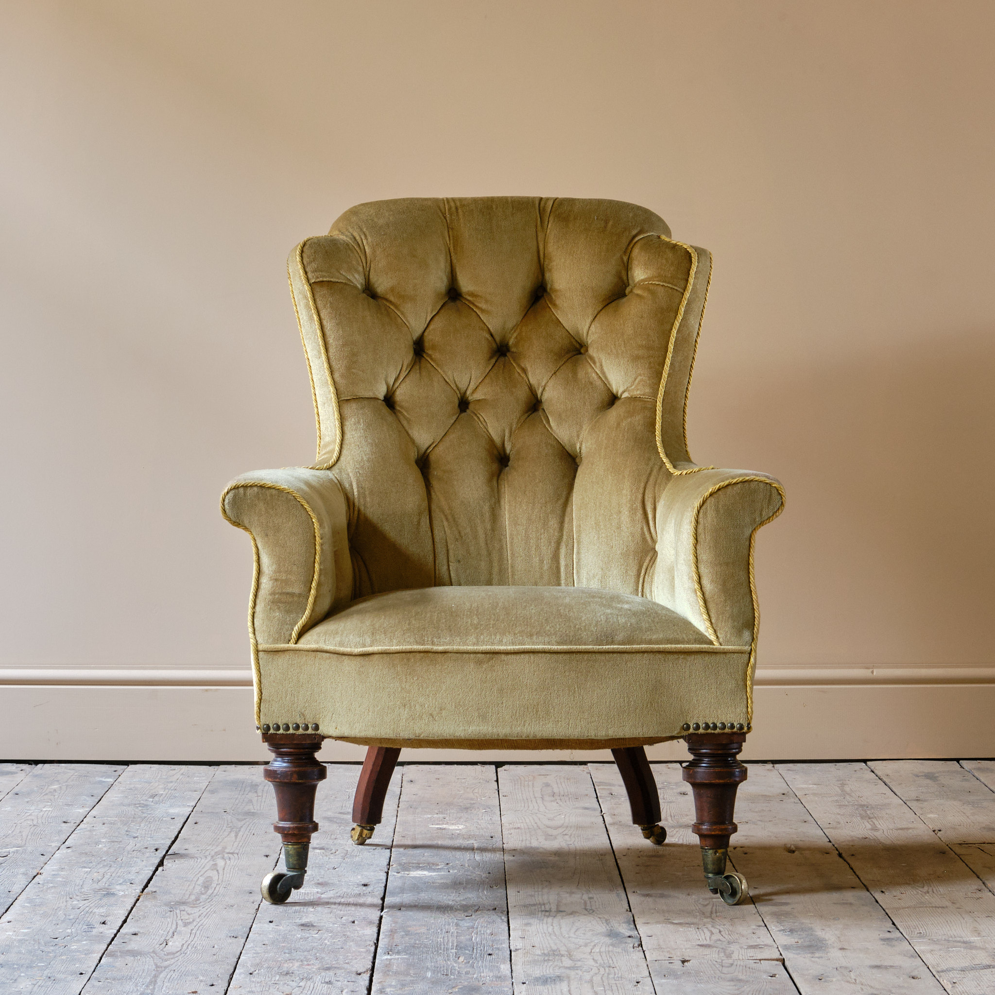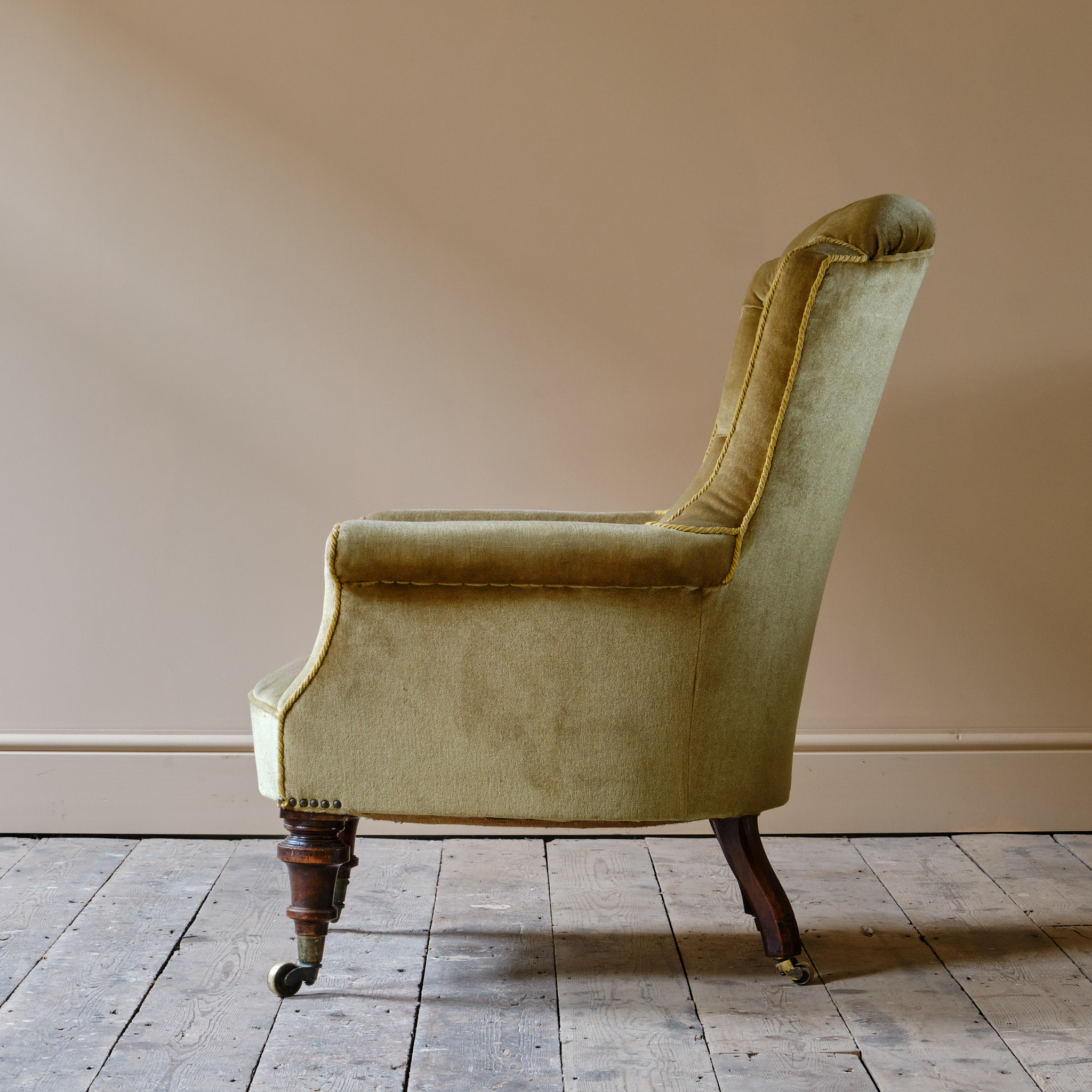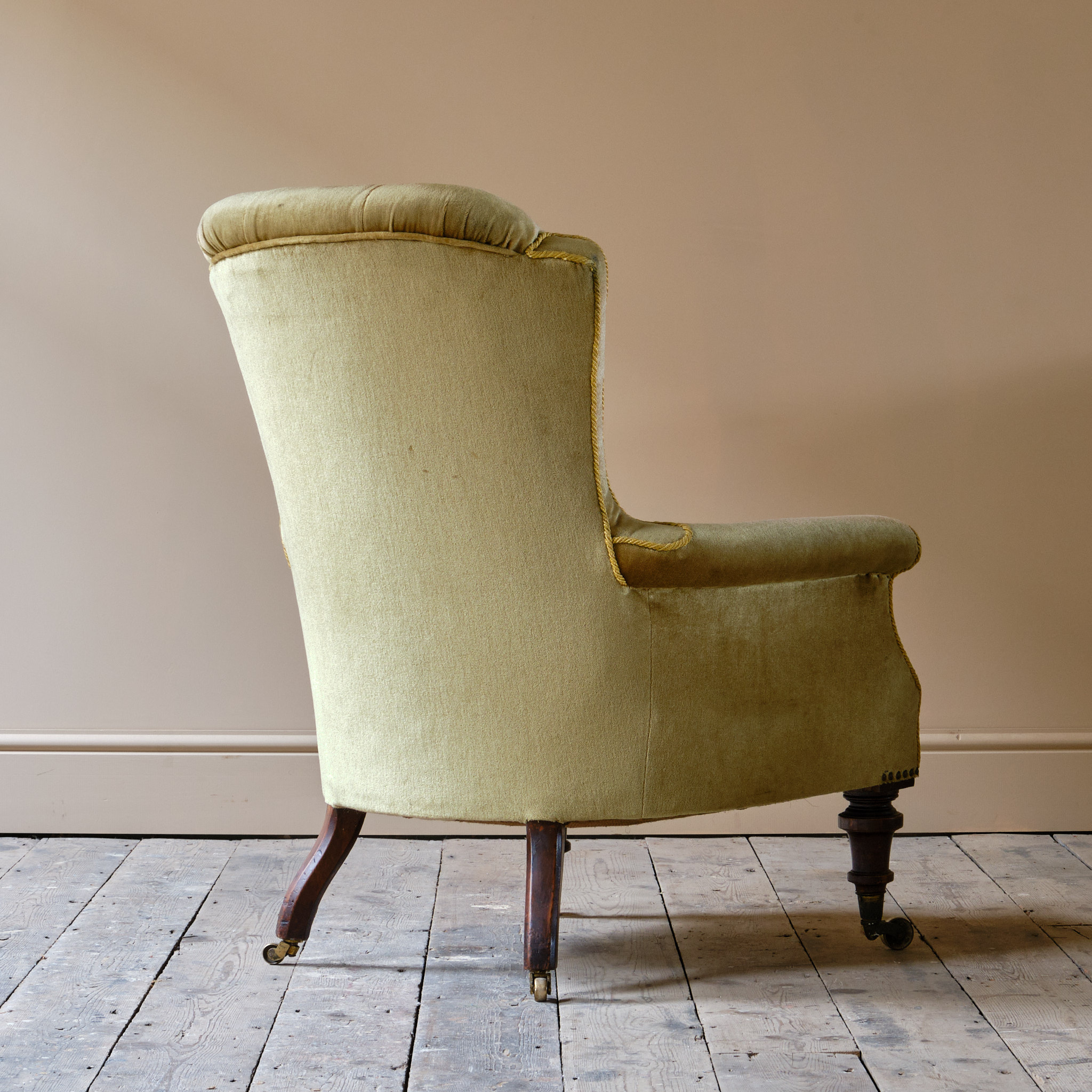 A 19th century country house armchair. Raised on turned front legs with the original casters. The traditional horsehair innards are firm and intact and covered in sage green draylon velvet.