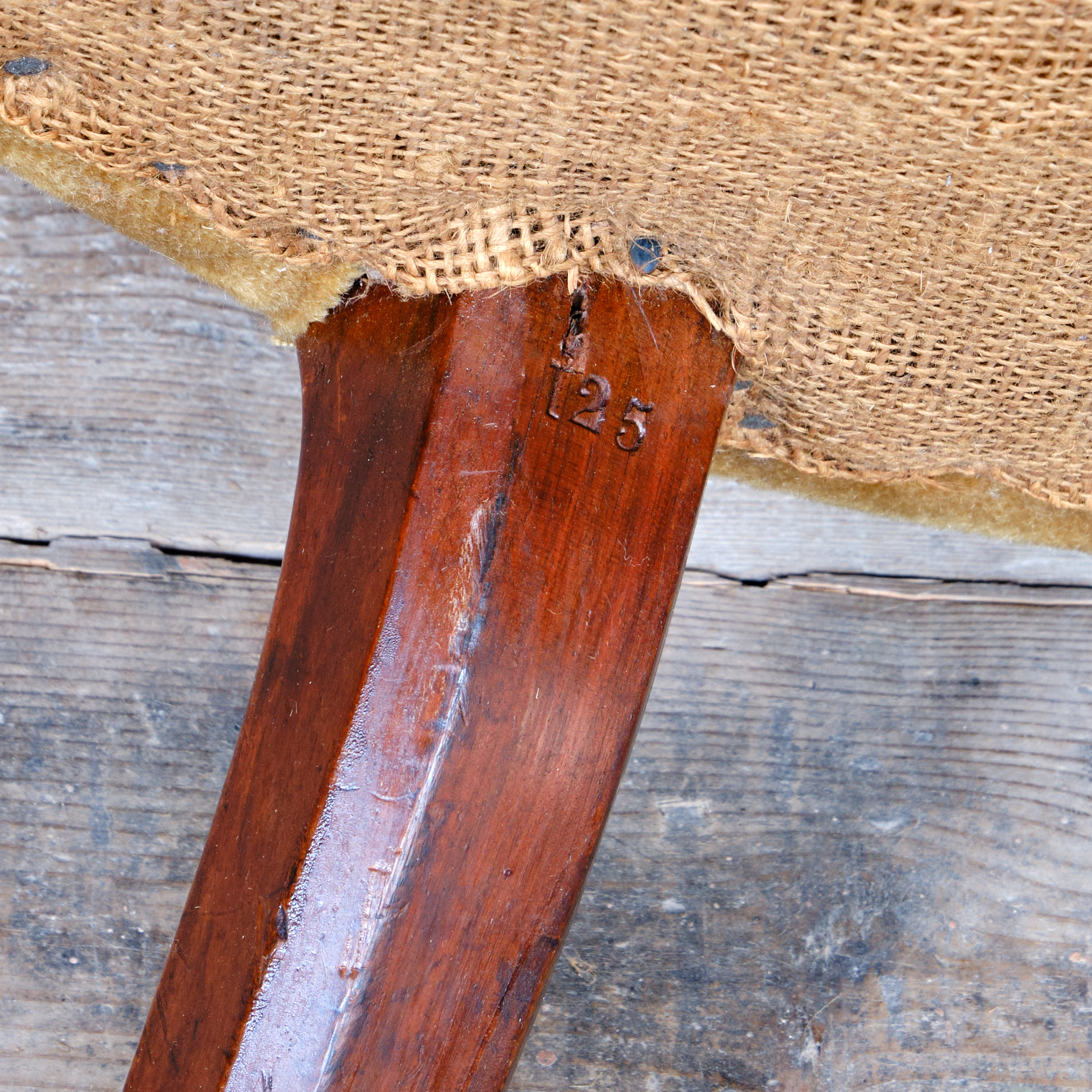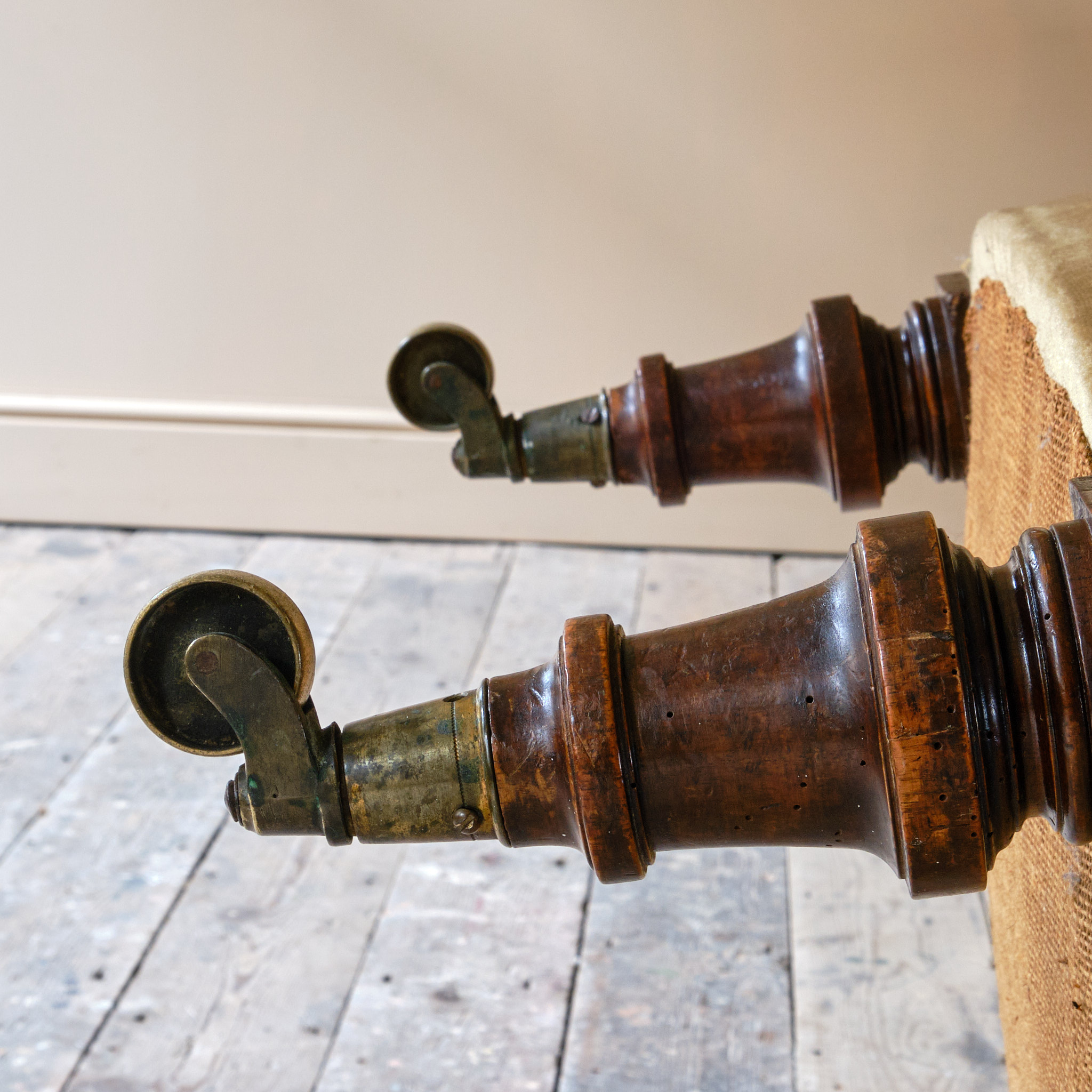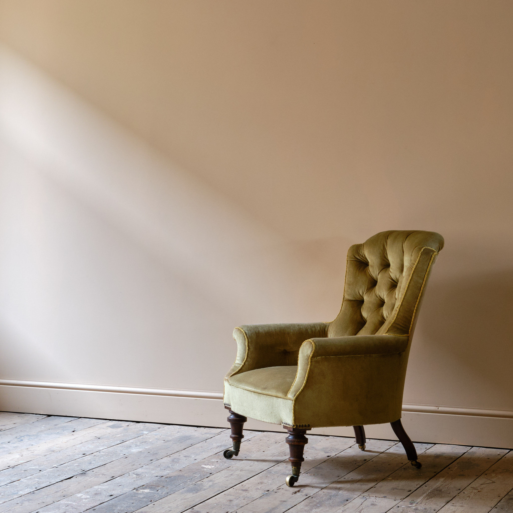 A 19th century country house armchair. Raised on turned front legs with the original casters. The traditional horsehair innards are firm and intact and covered in sage green draylon velvet.