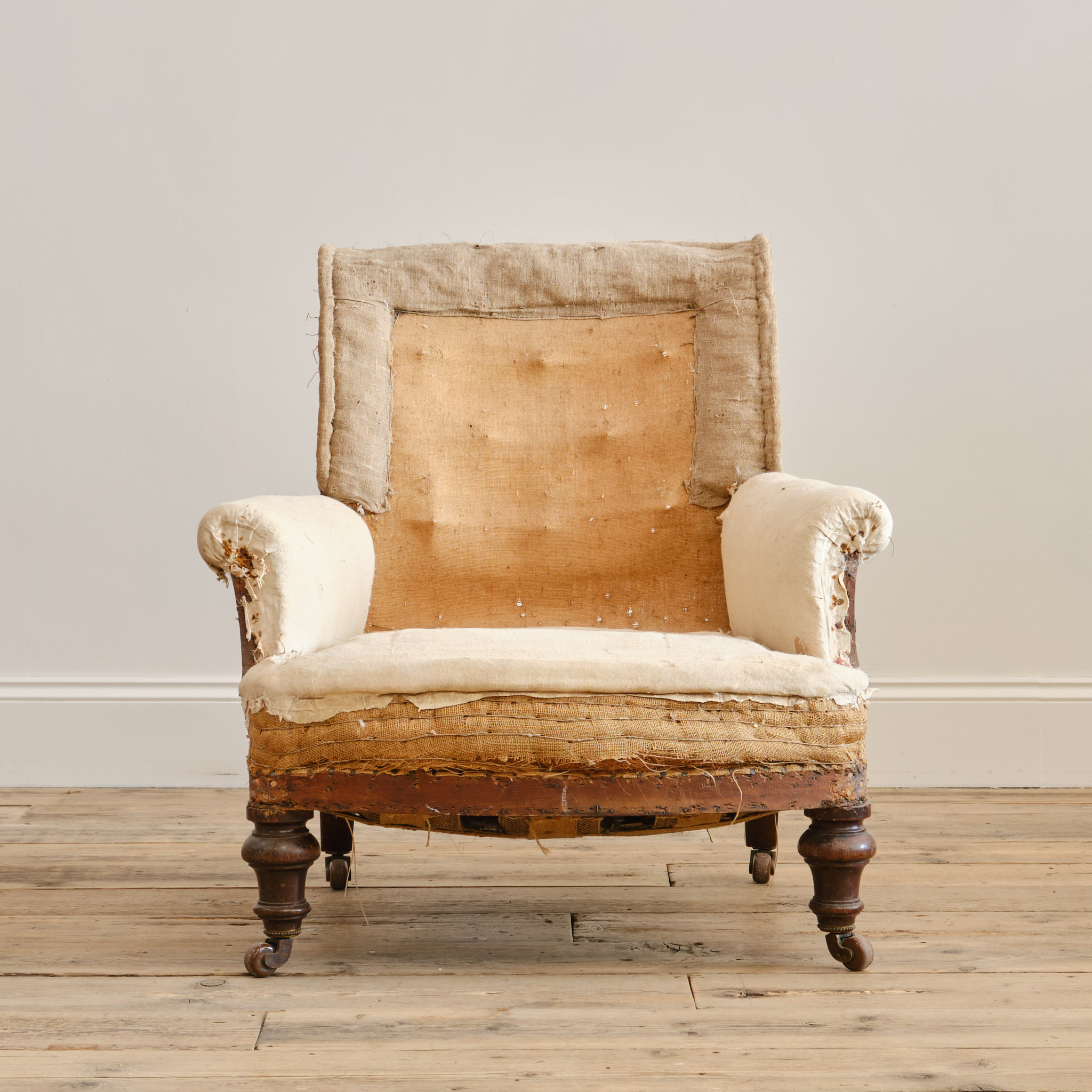 A shapely 19th century armchair raised on turned front legs and splayed legs to the rear, all with the original casters.