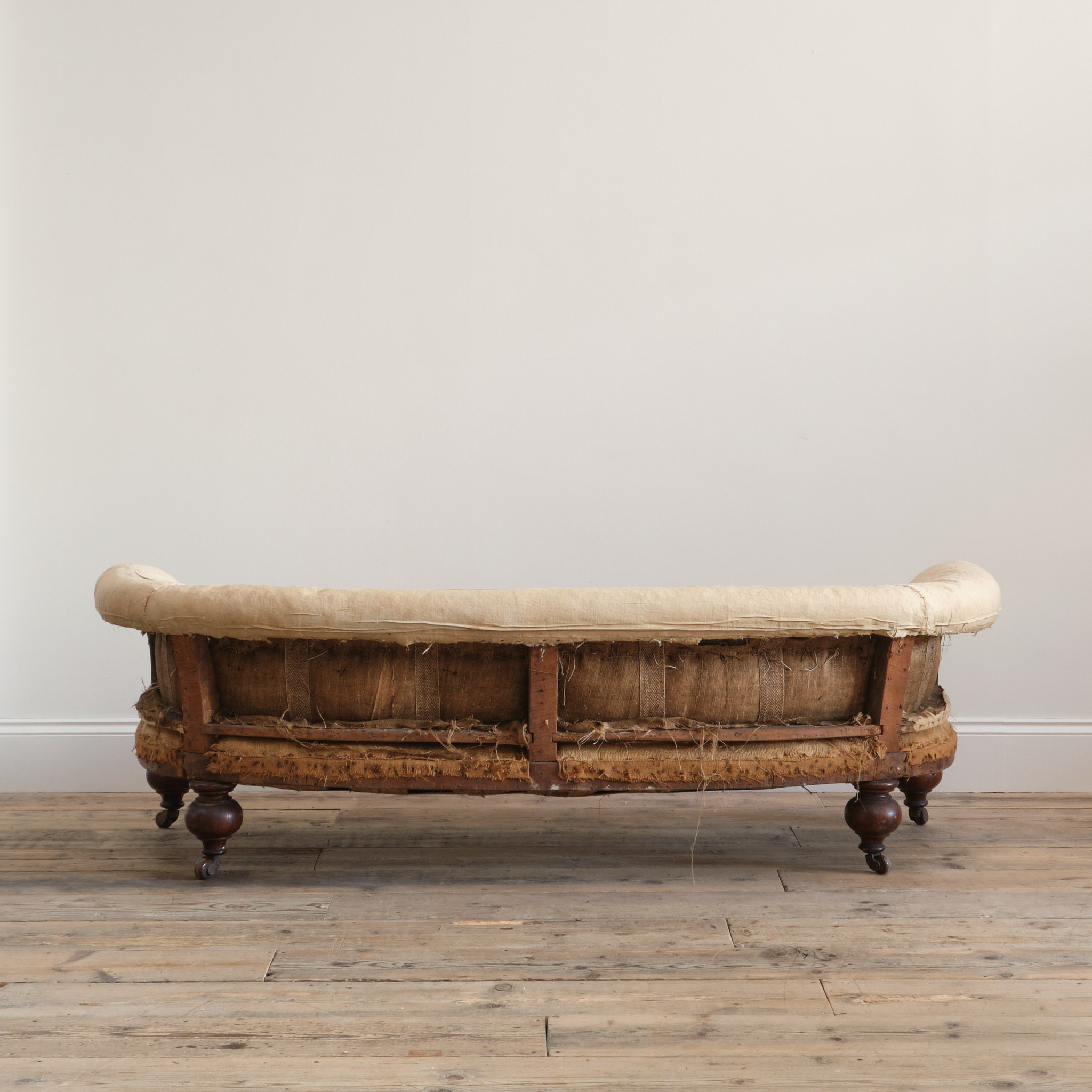 A low and sleek curved 19th century country house sofa. Raised on thick turned walnut legs with the original casters. English c1860