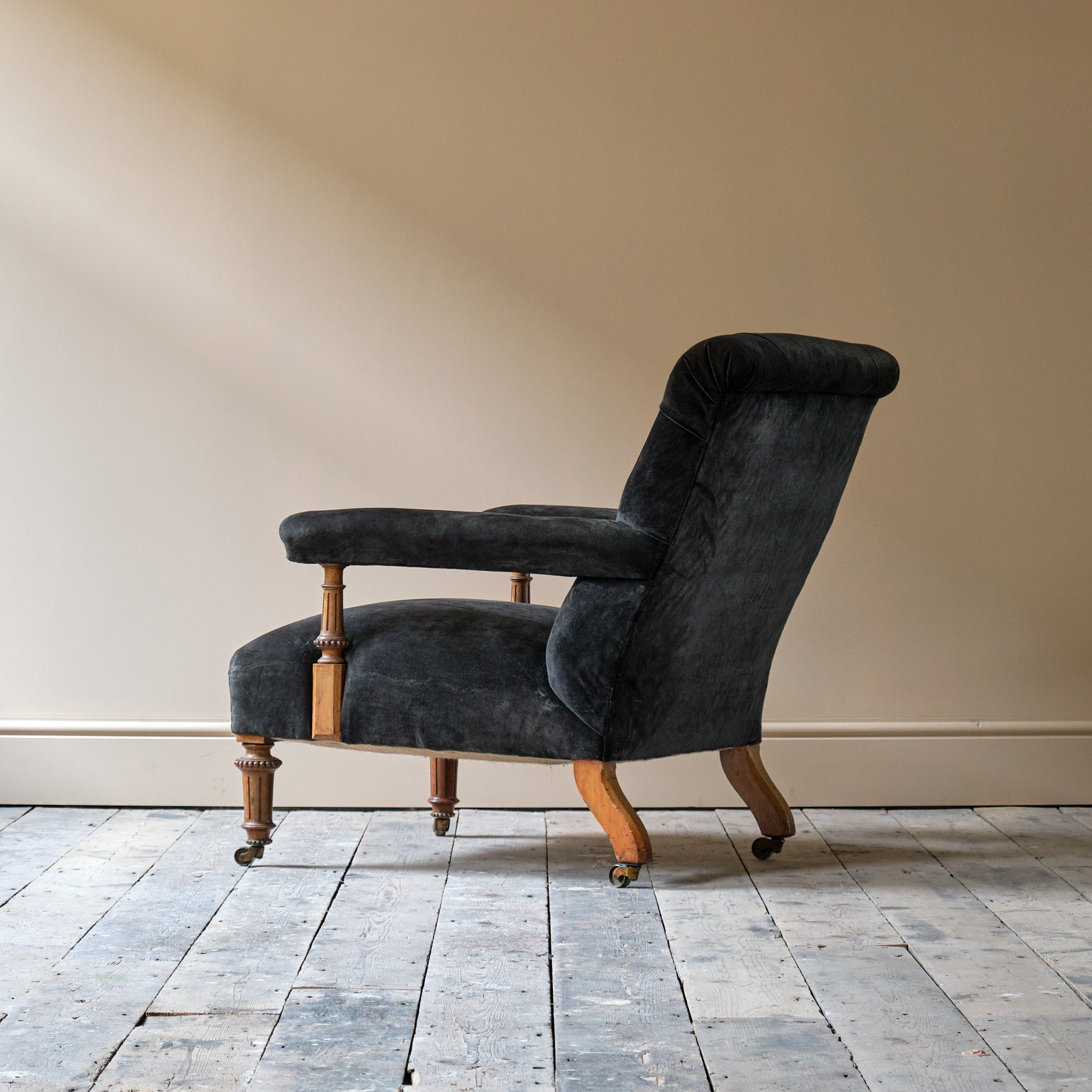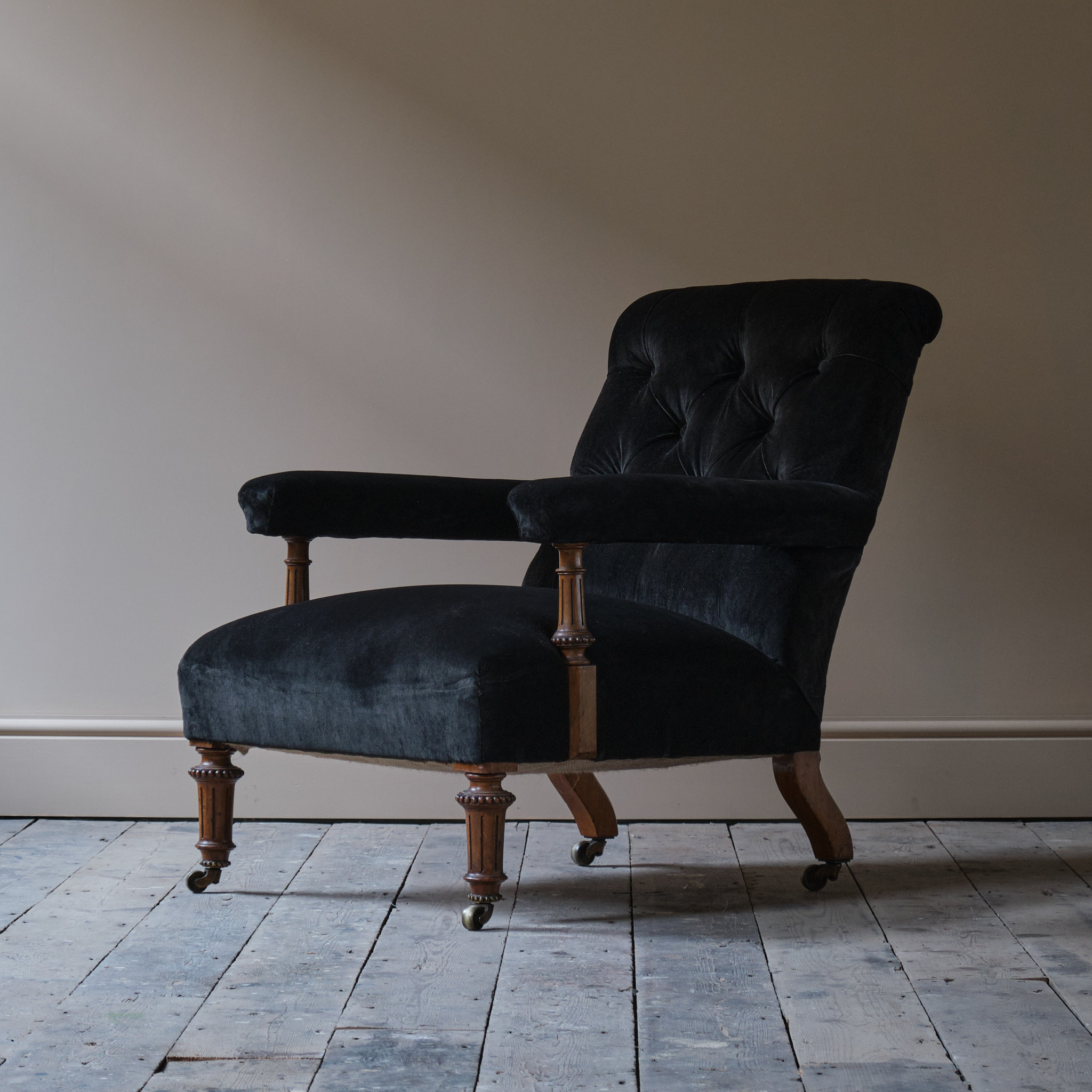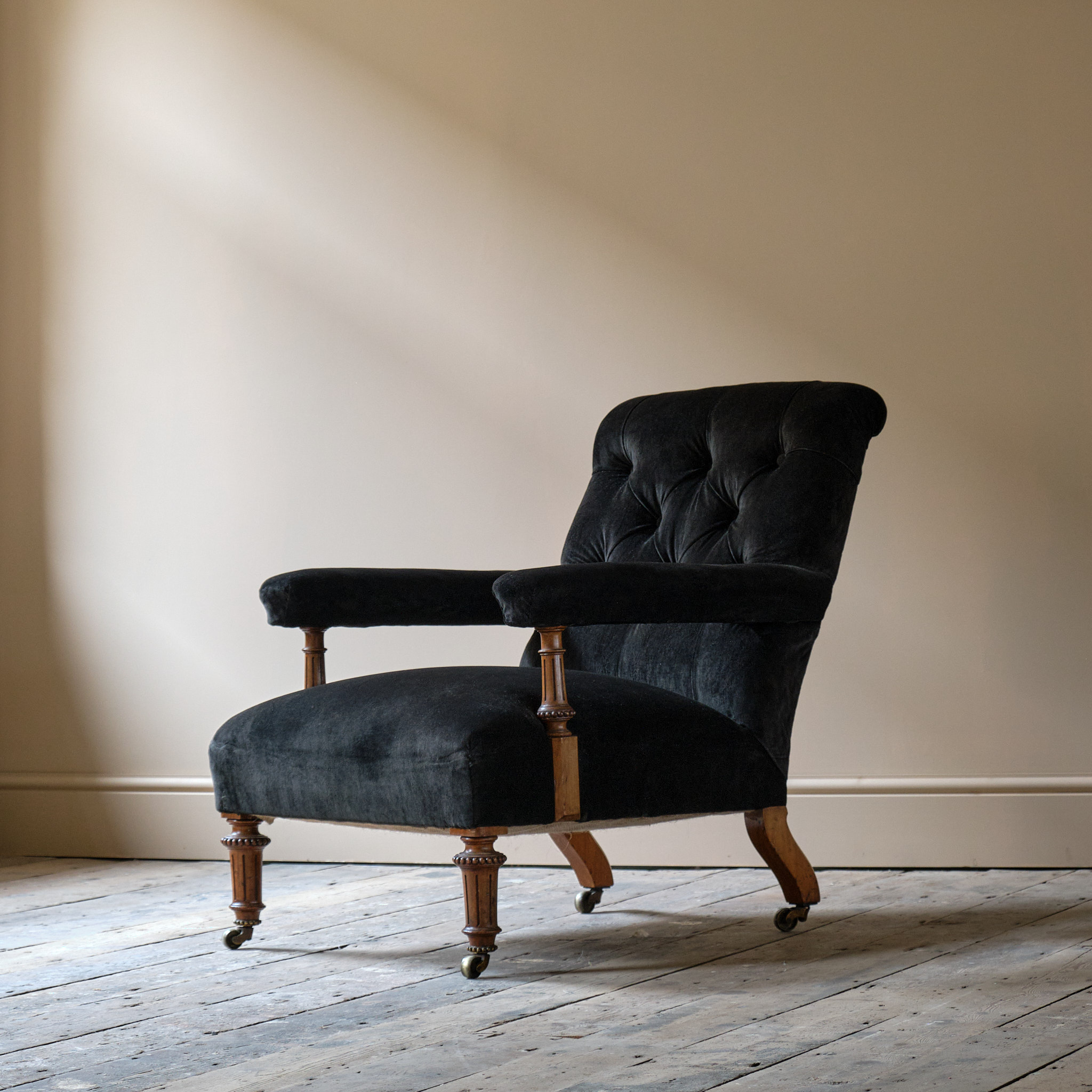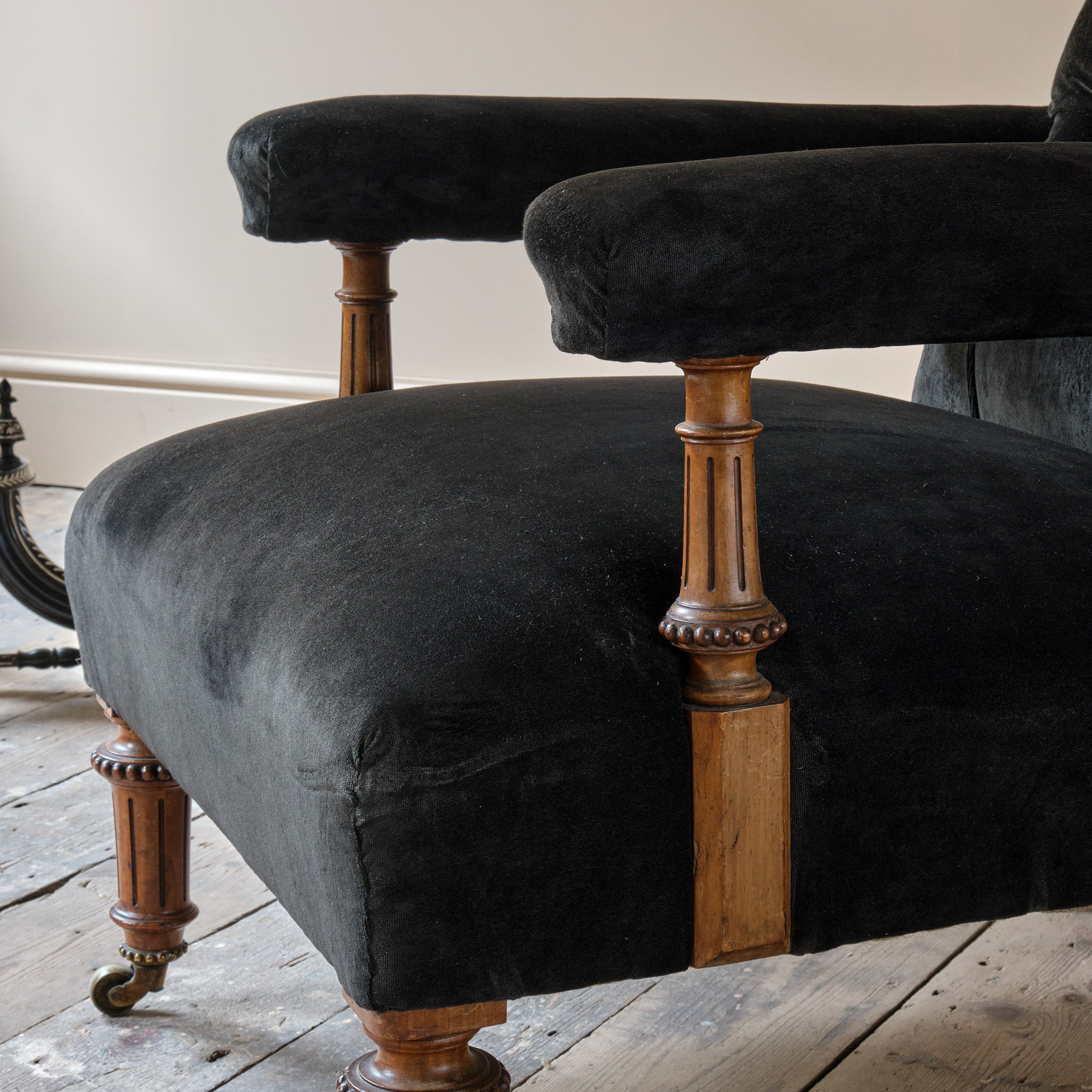 A superb quality mid 19th century armchair by Gillows of Lancaster. Raised on finely worked walnut turned front legs and arm supports with out splayed chamfered legs to the rear, all on the original Cope & Collinson brass casters.