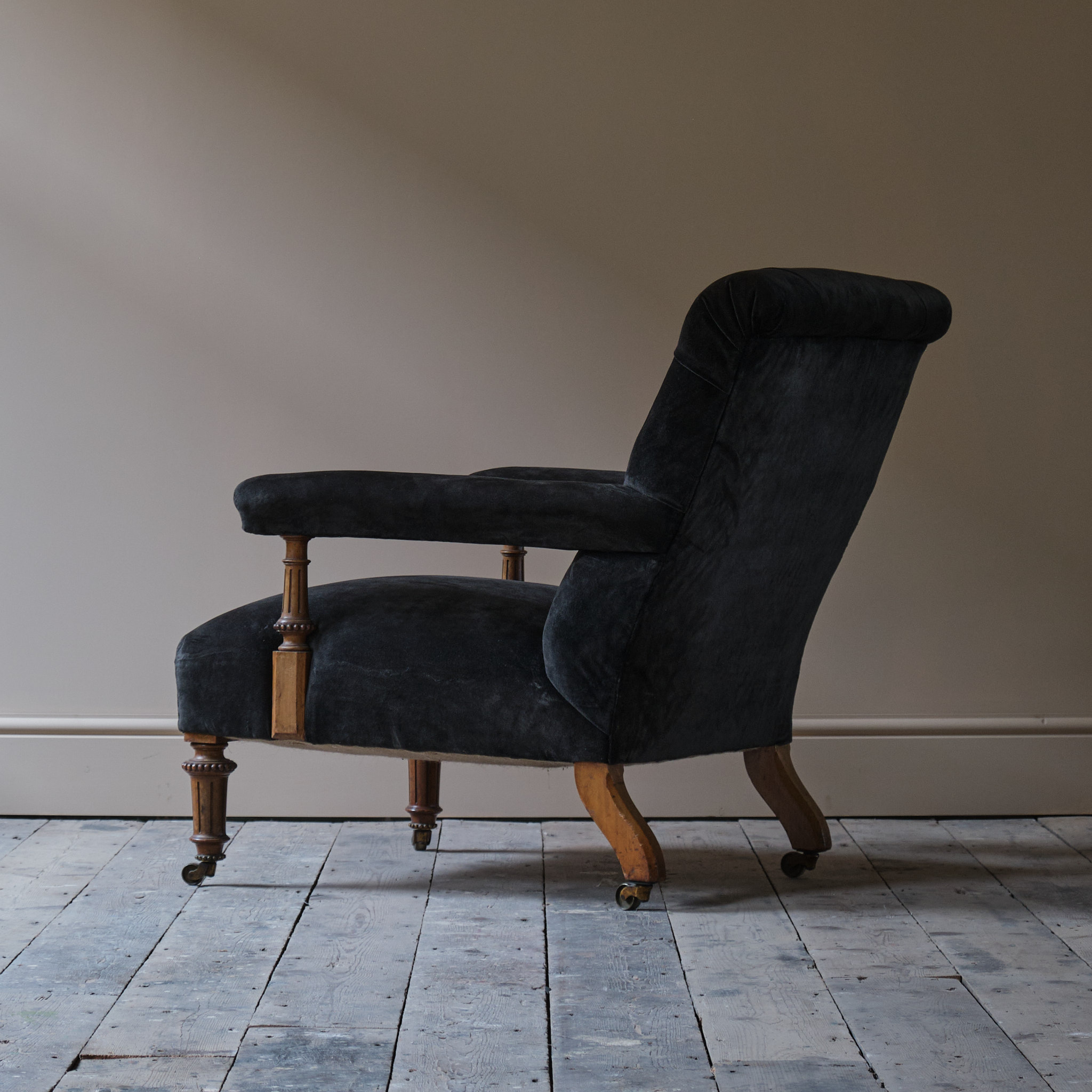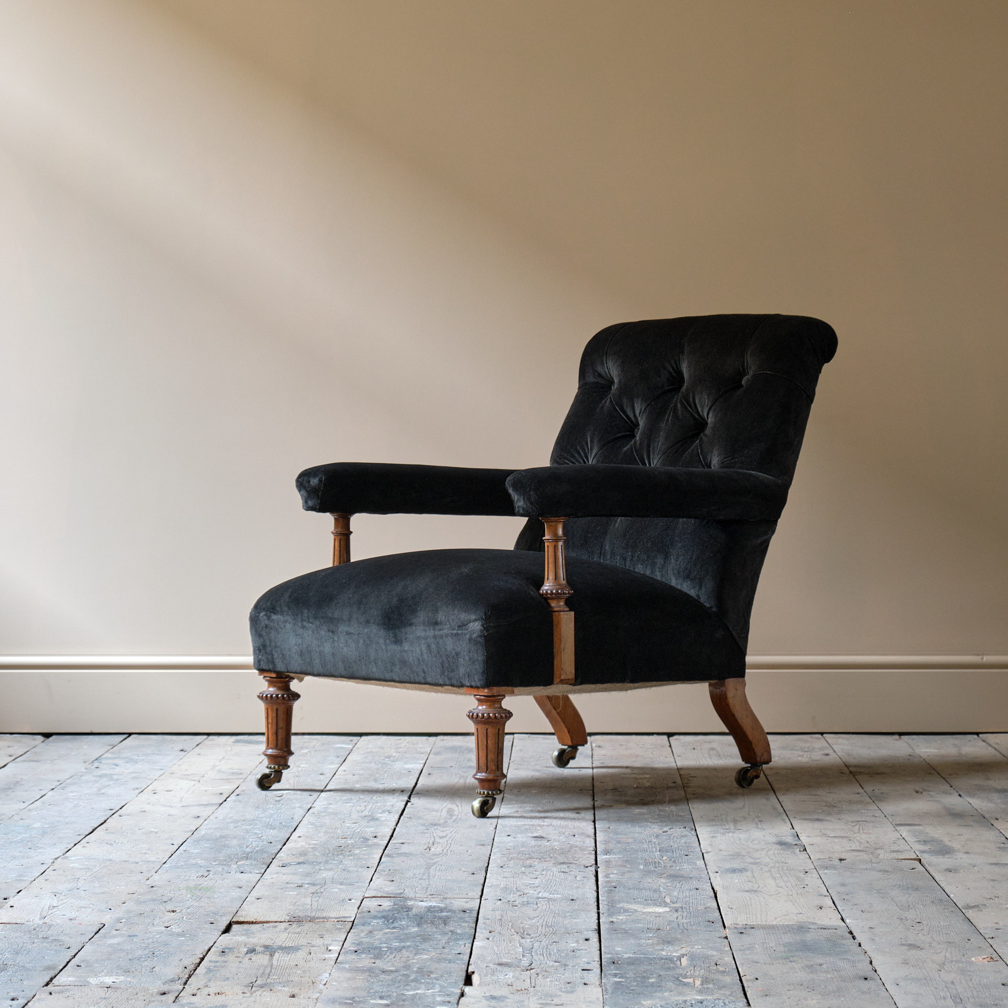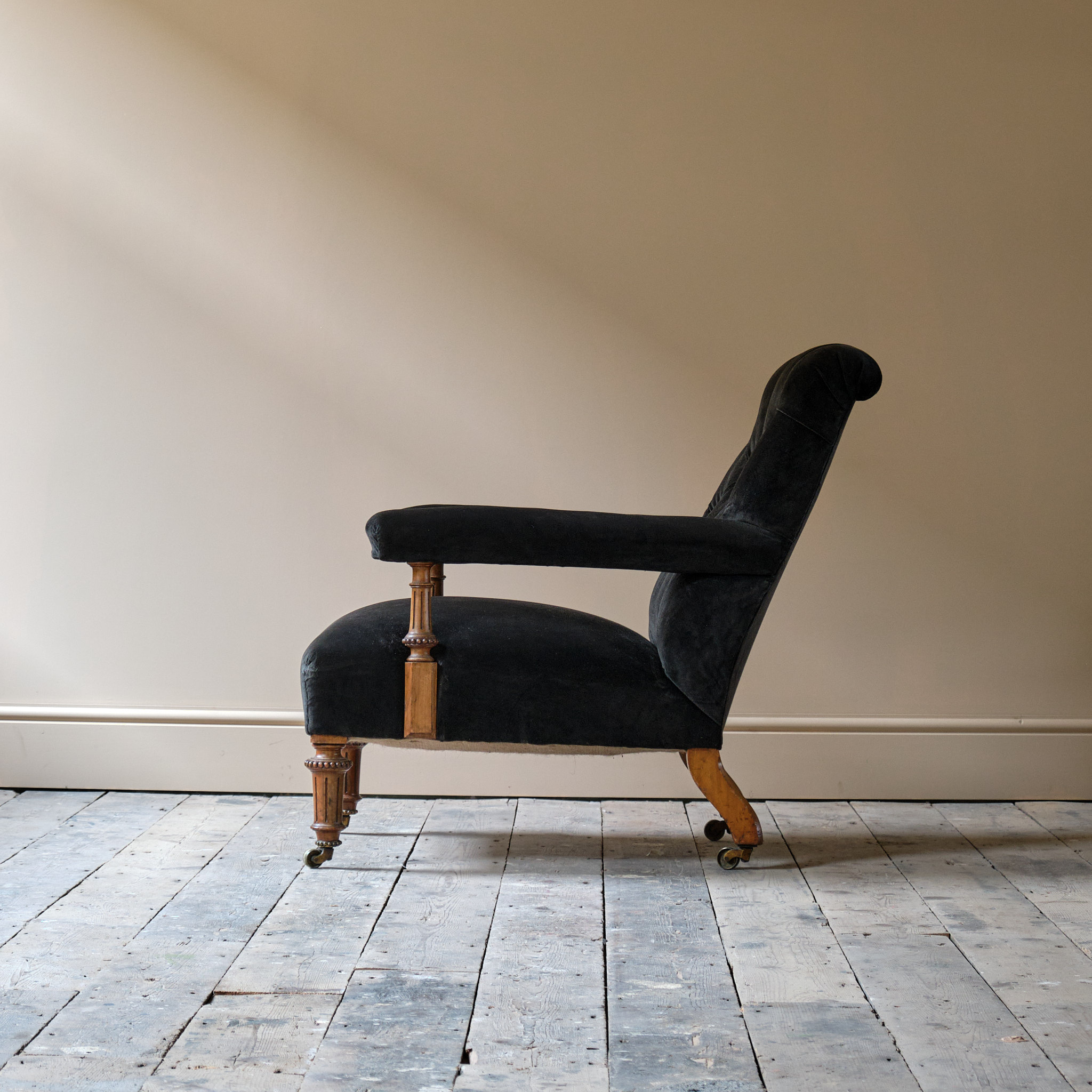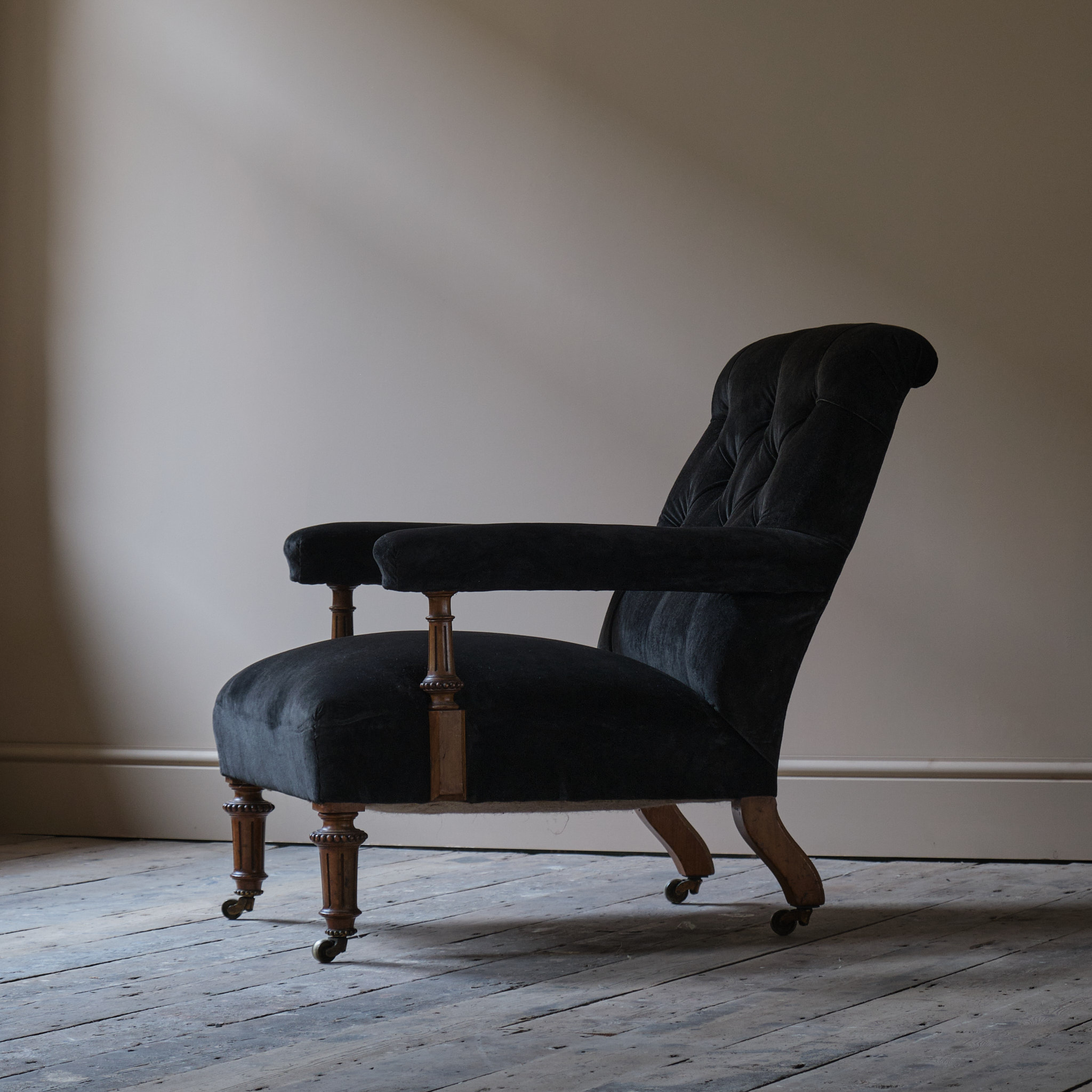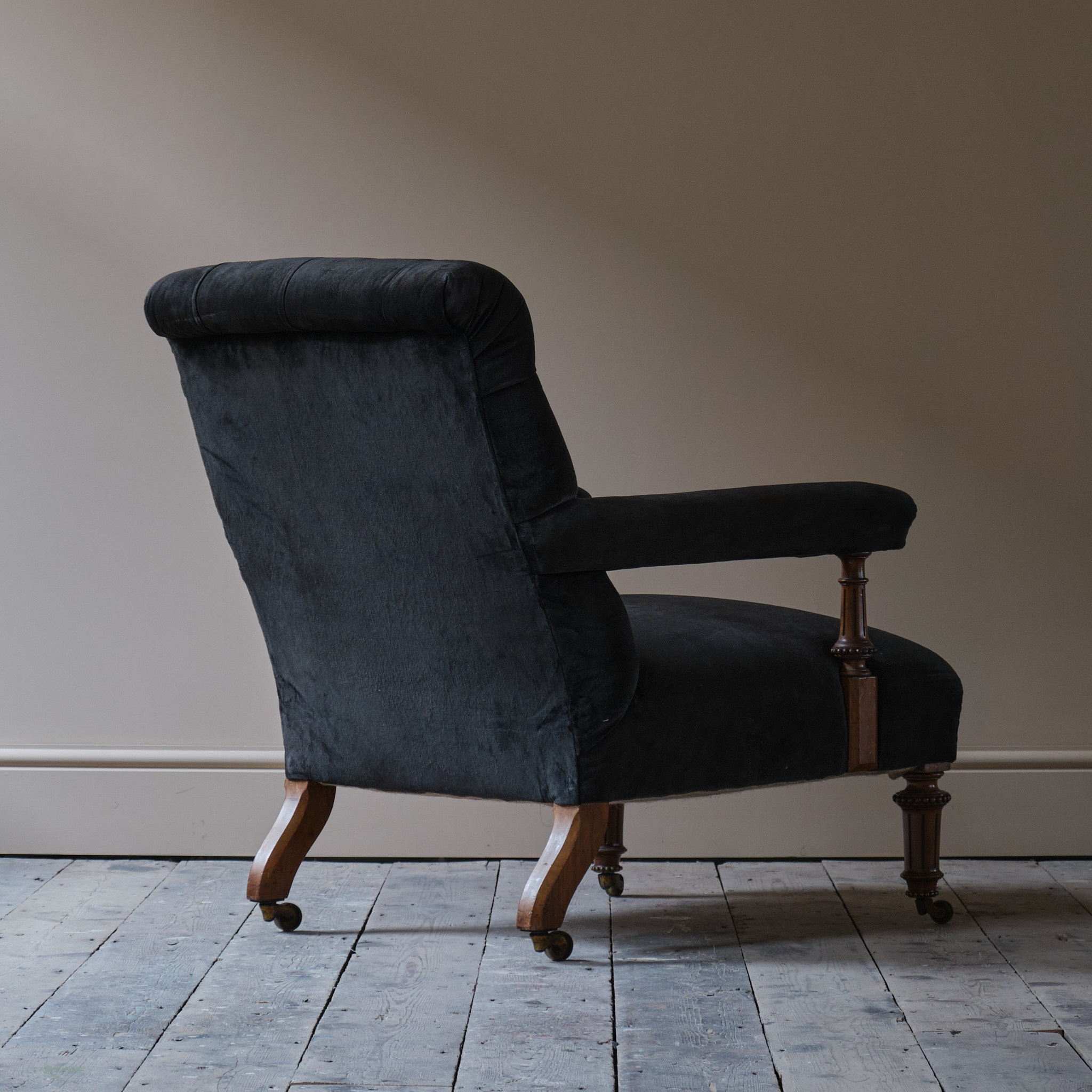 A superb quality mid 19th century armchair by Gillows of Lancaster. Raised on finely worked walnut turned front legs and arm supports with out splayed chamfered legs to the rear, all on the original Cope & Collinson brass casters.