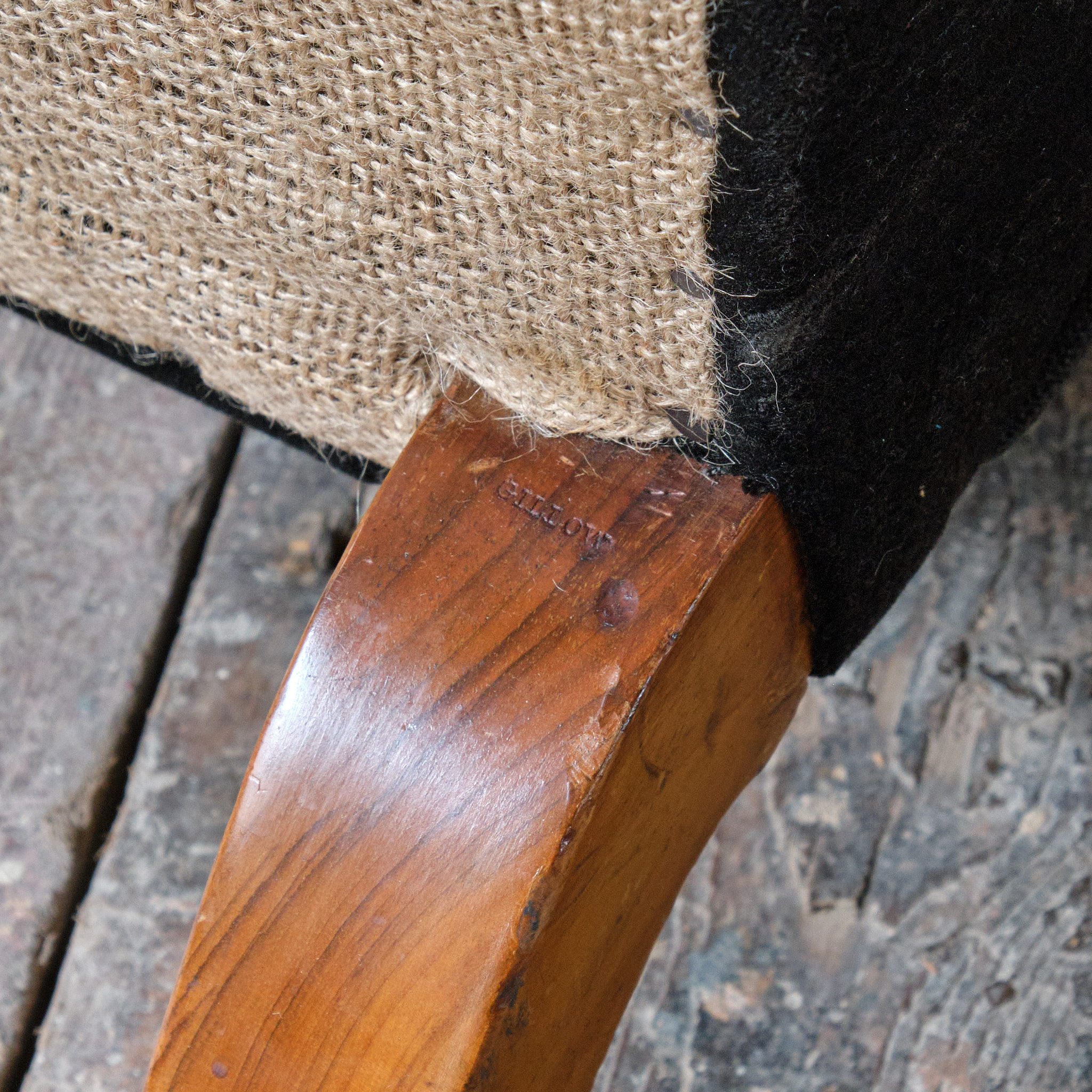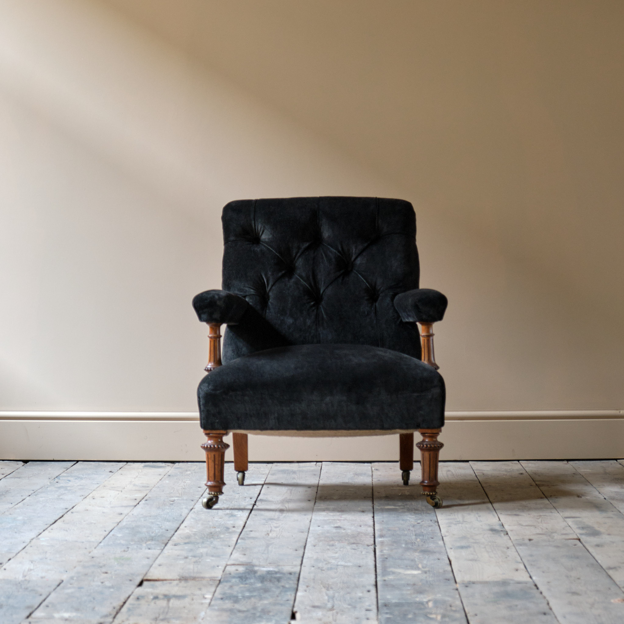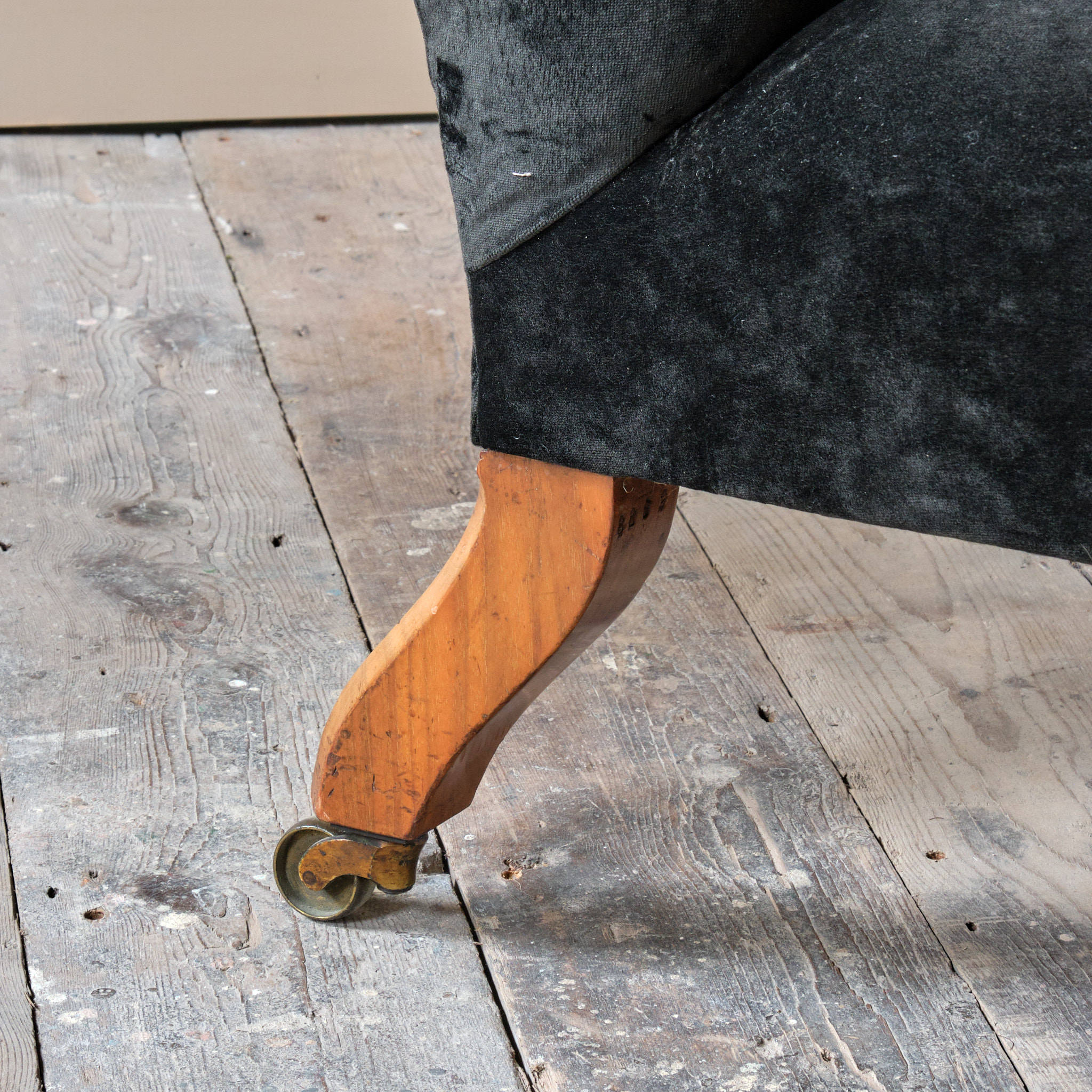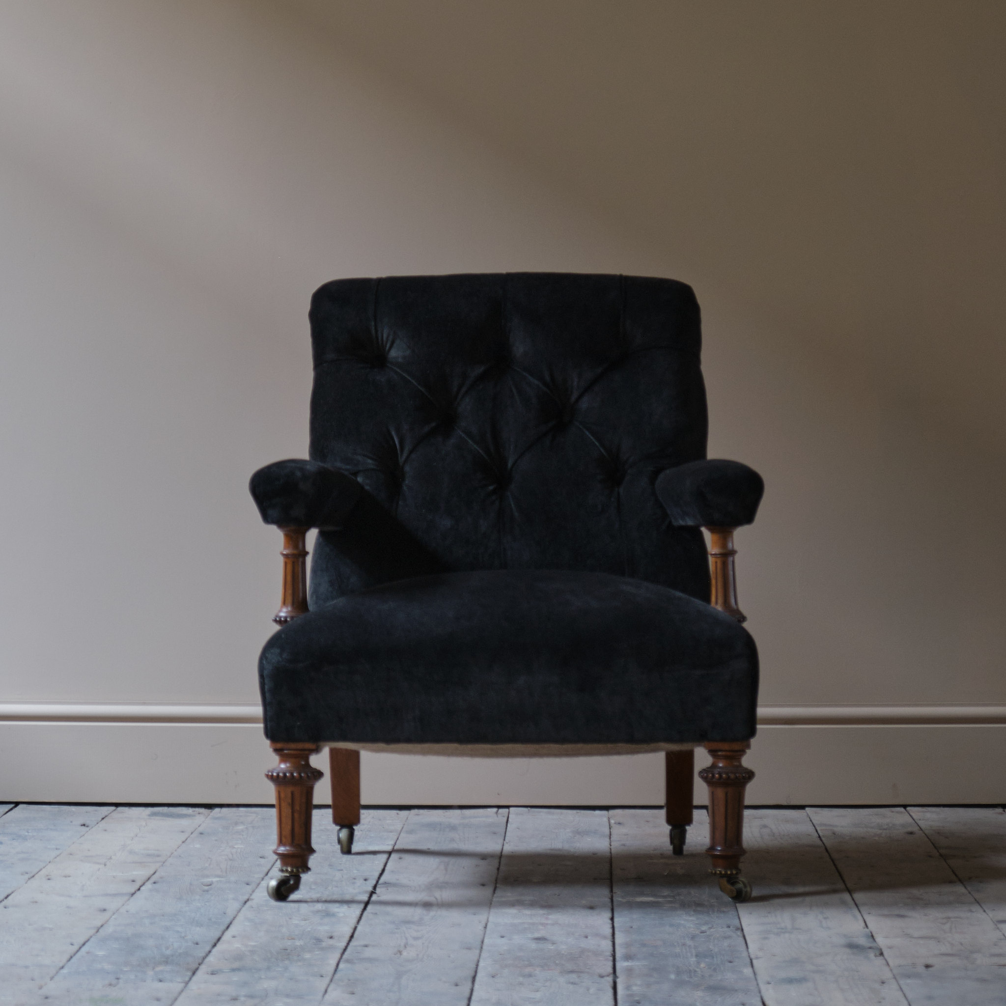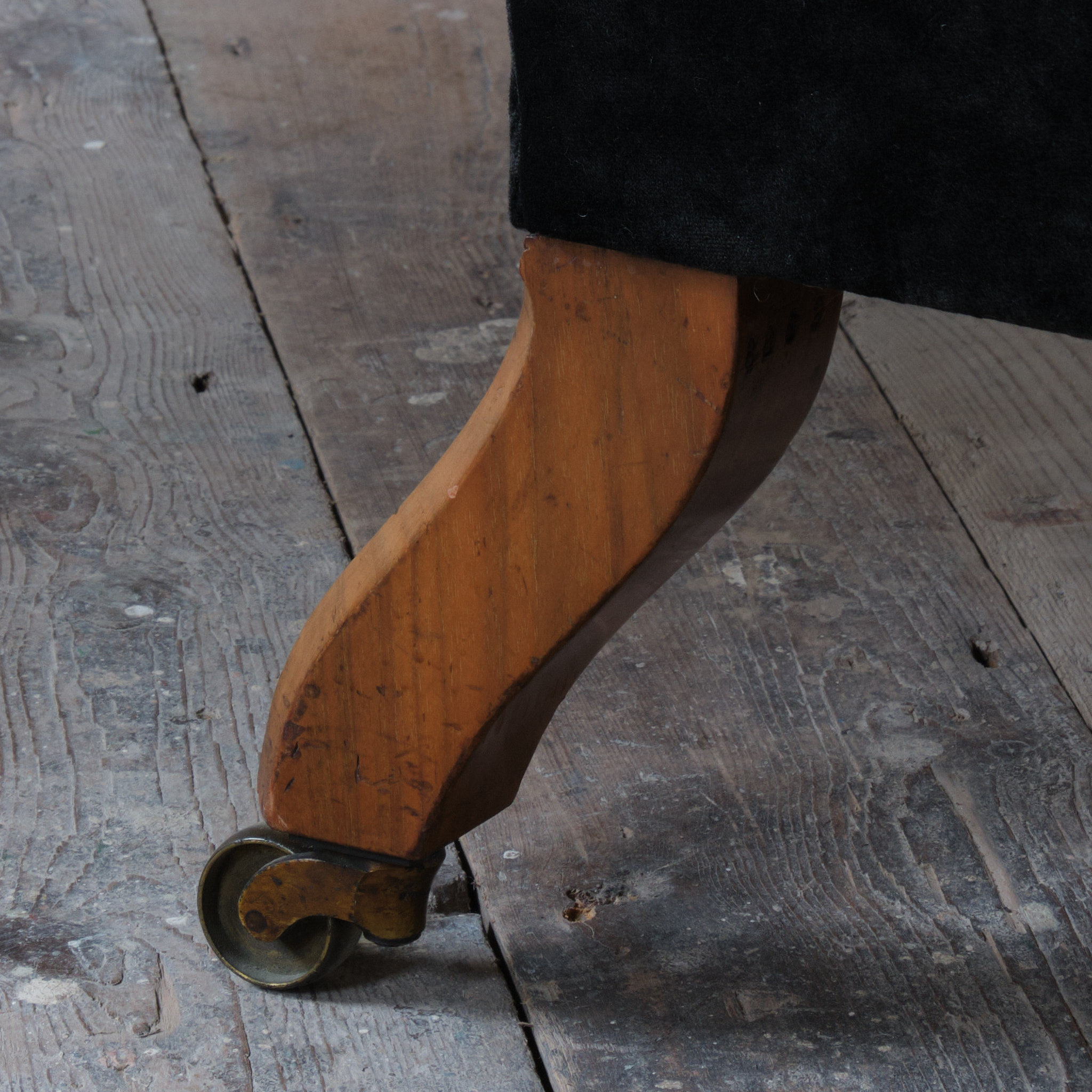 Upholstered with a buttoned back in black velvet base layer and a slip cover in Colefax and fowler Cassandra navy