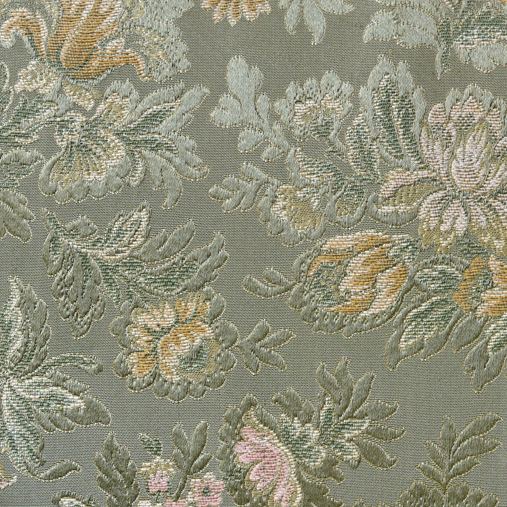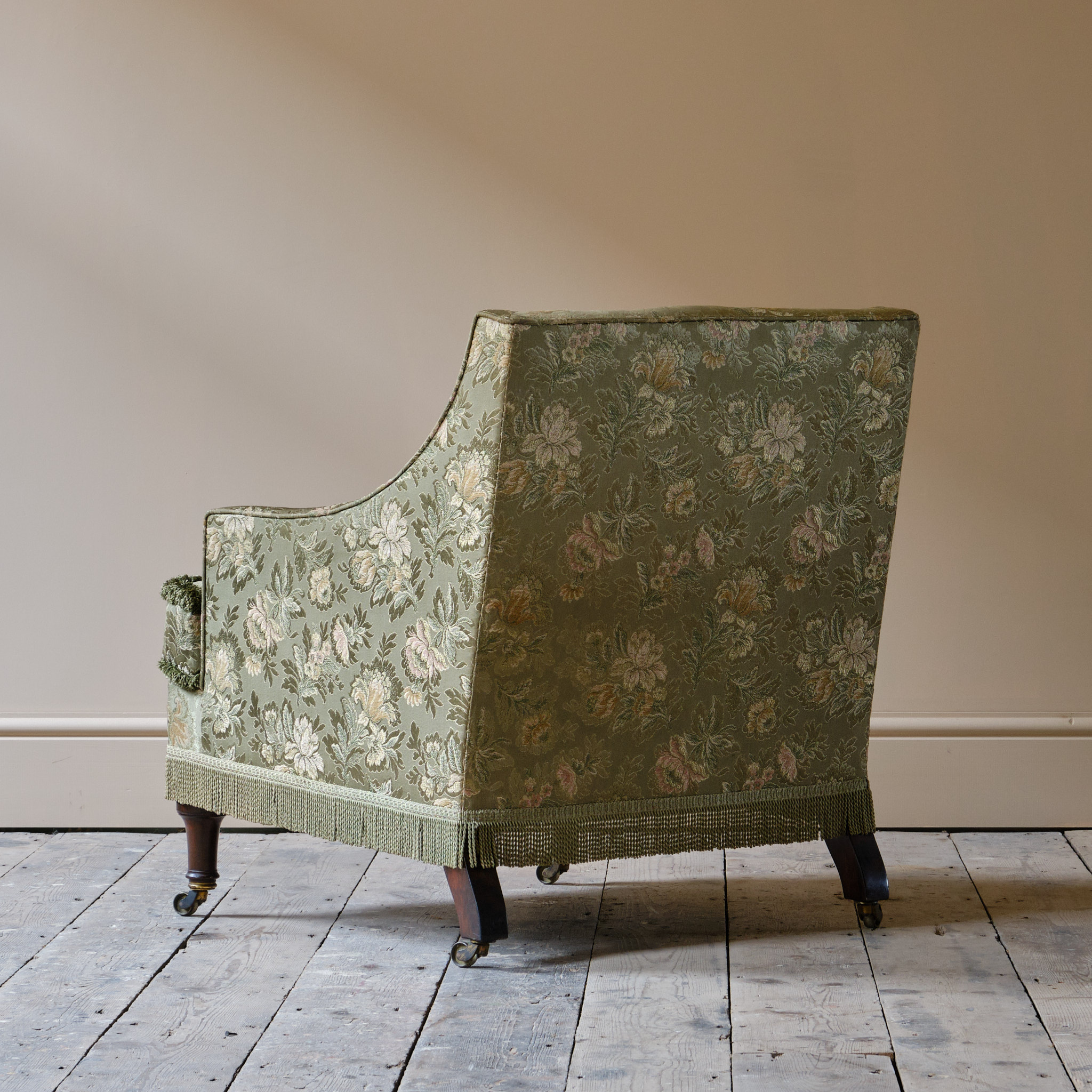 The chair is shown here in a good quality green floral silk fabric with tasselled trim around the bottom edge and Positano fringe around the fixed in feather and down seat cushion.