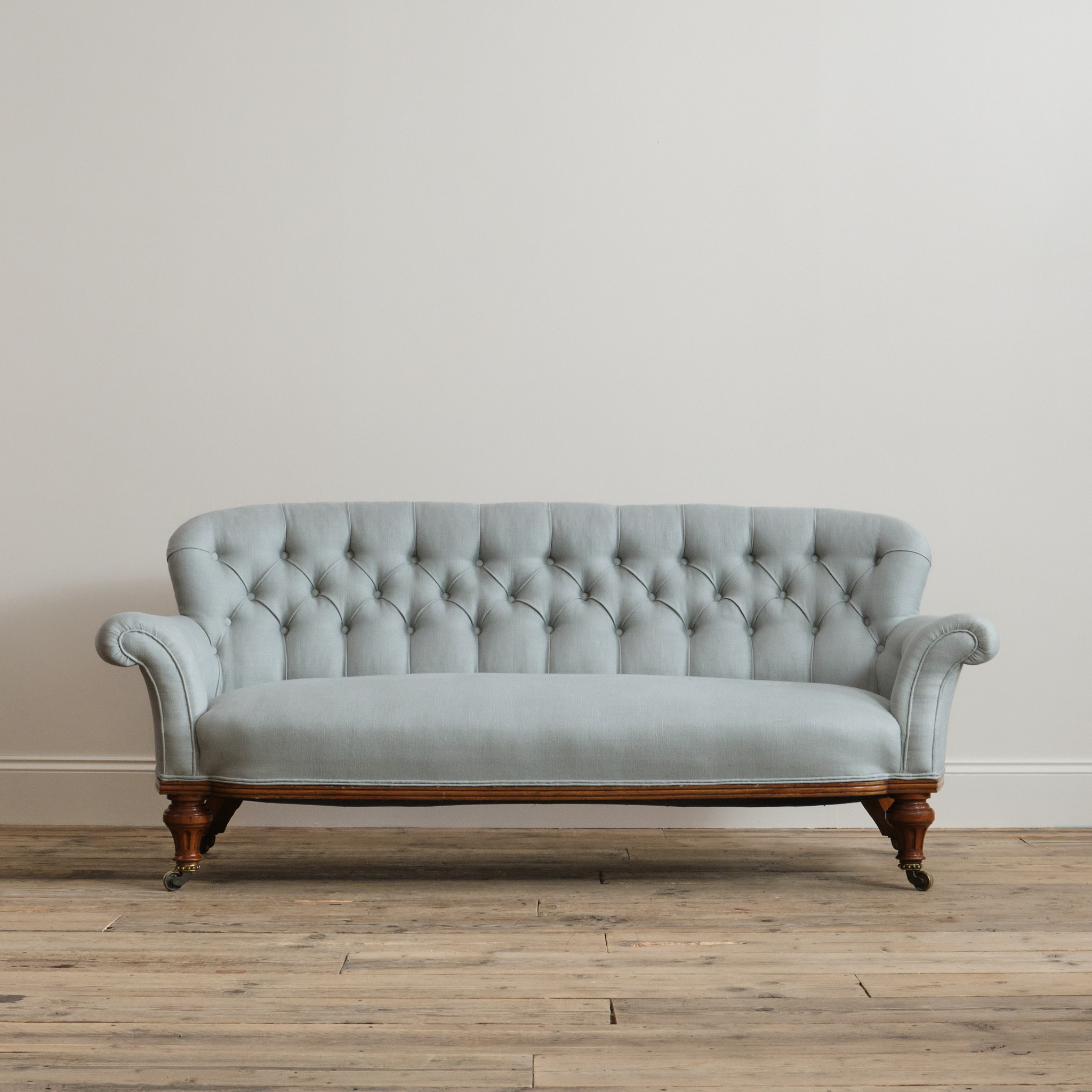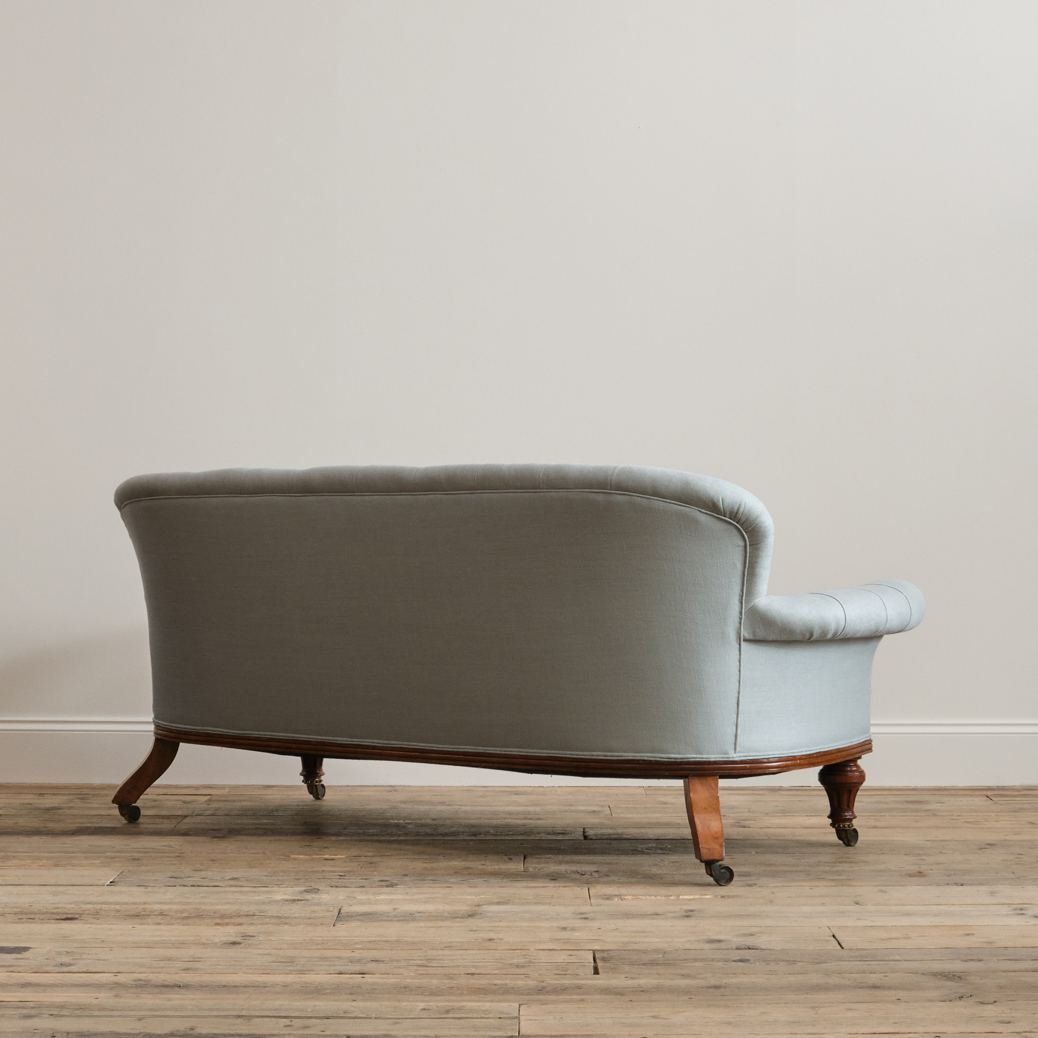 A superb mid 19th century sofa by Holland and Sons - London c1850. The Shapely walnut frame raised on thick and turned reeded walnut front with outward splayed rear legs. Both back legs stamped with the makers mark and one leg with the journeyman's name 'C CULVER'. All legs retain the original brass casters.