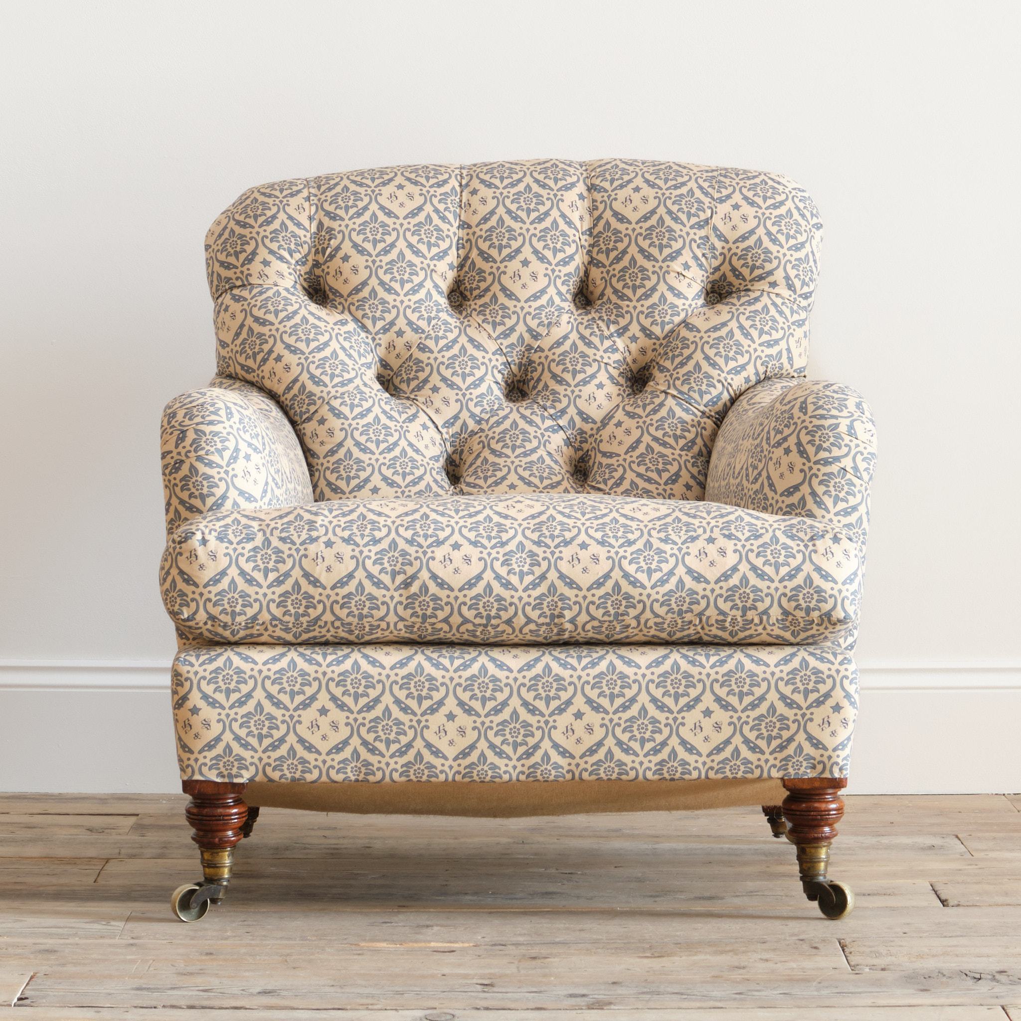 We have restored this chair from the frame up with a new sprung seat and feather, down seat cushion and retained the original fillings to the arms and buttoned back. All covered in a reproduction of the H&S cotton lining ready for use as is or for your choice of top covering.