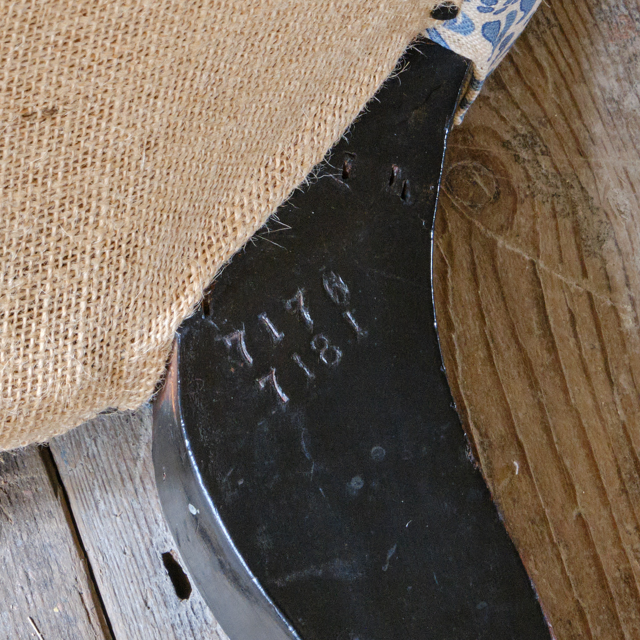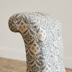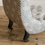 Newly upholstered in blue and white H&S monogram linen fabric.