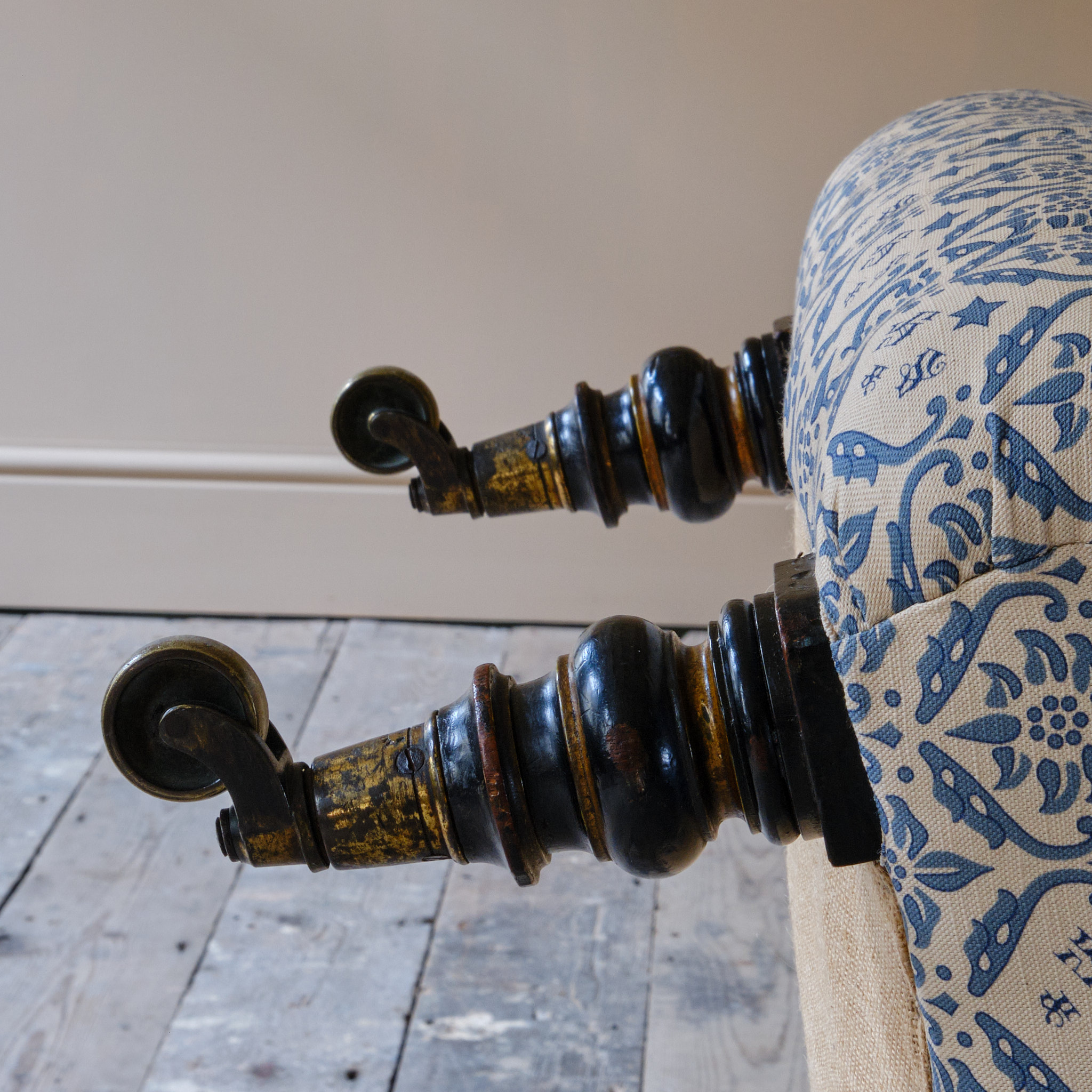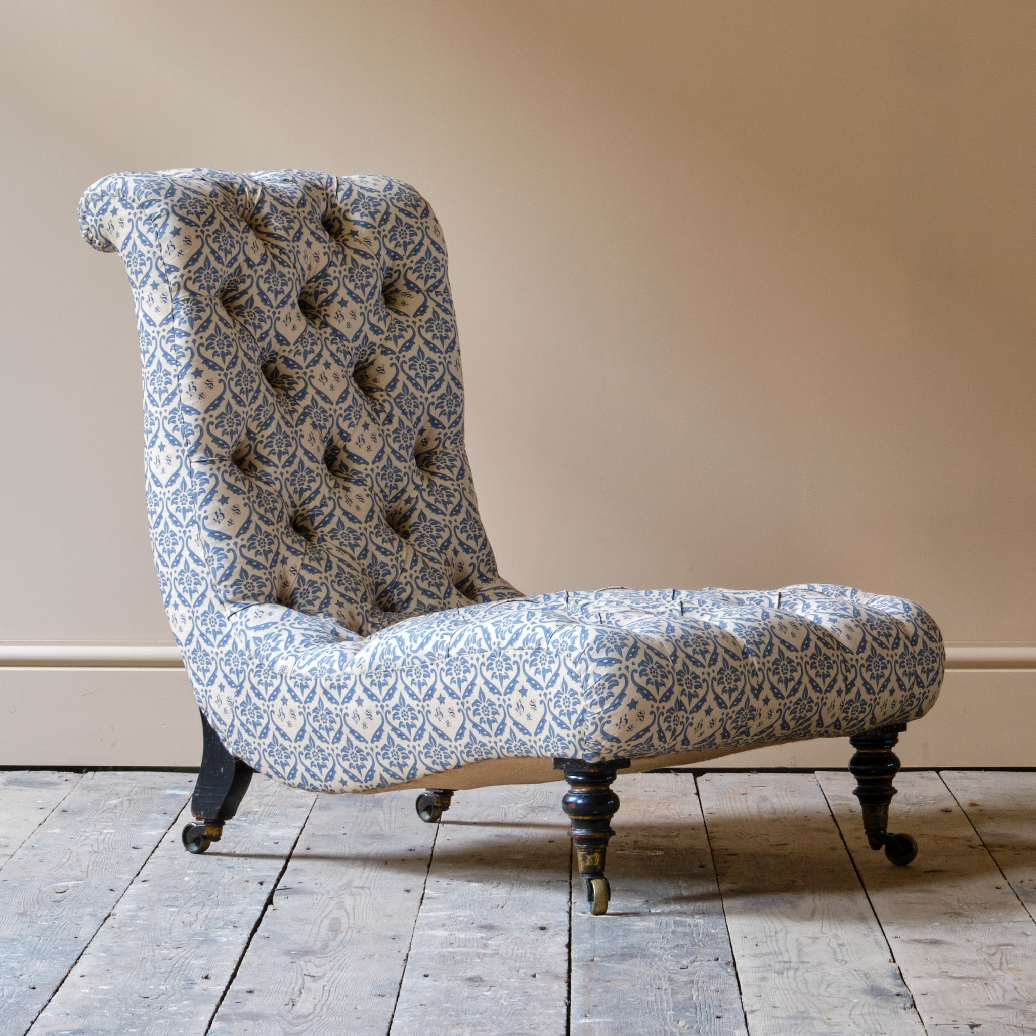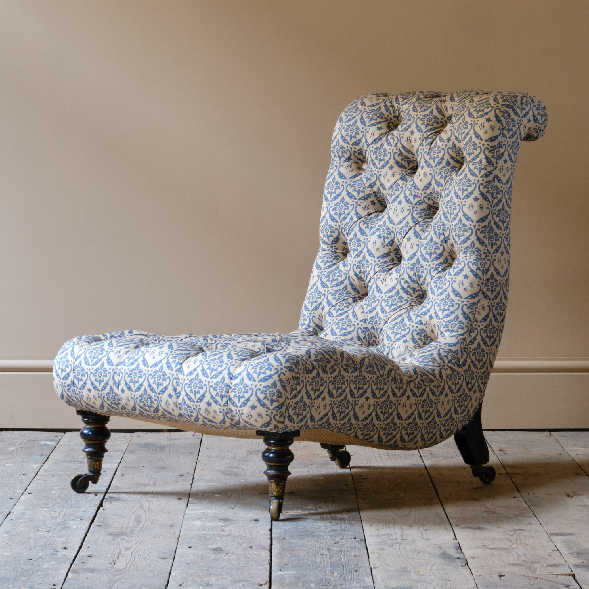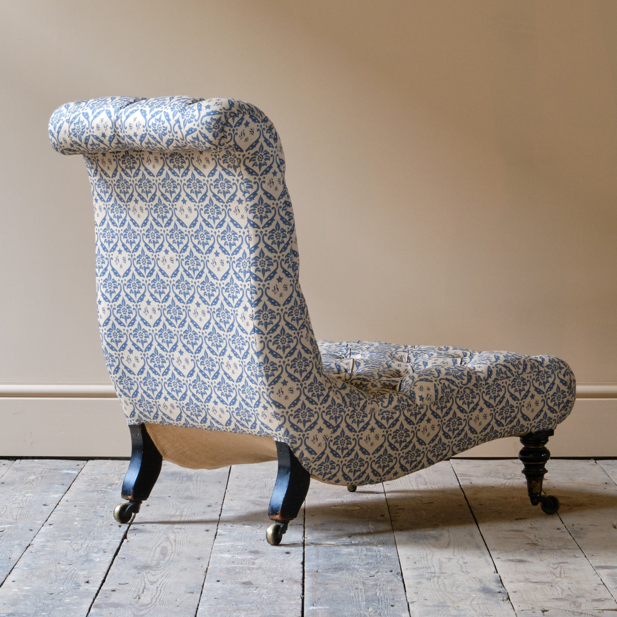 A very handsome mid 19th century deep seated Howard & sons slipper chair c1850. Raised on ebonized and gilt turned front legs with out splayed to the rear, all with the original Cope & Collinson brass casters.