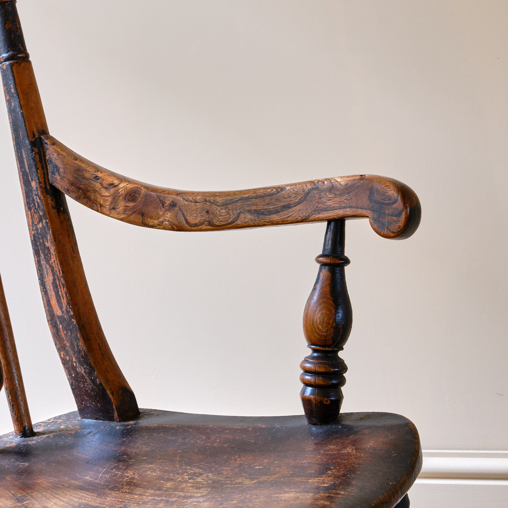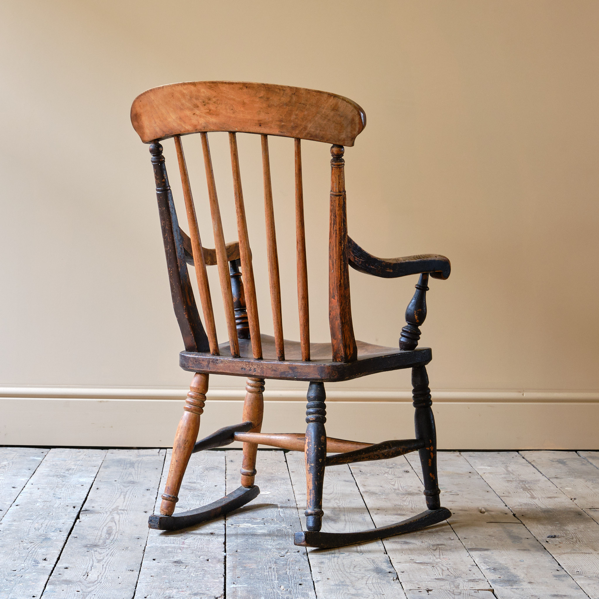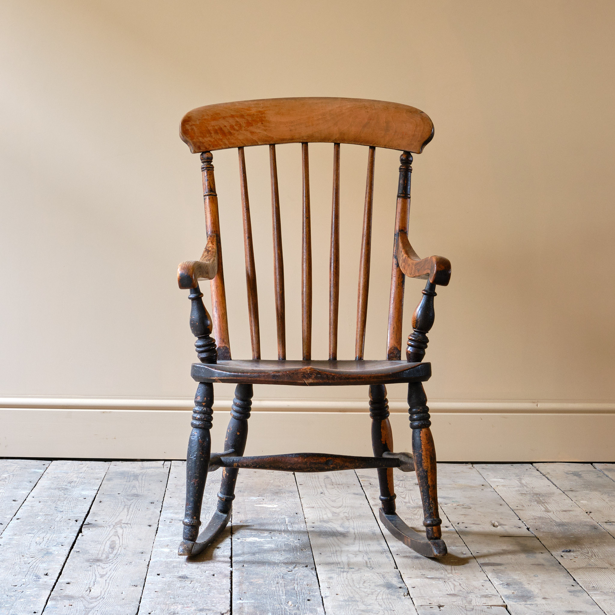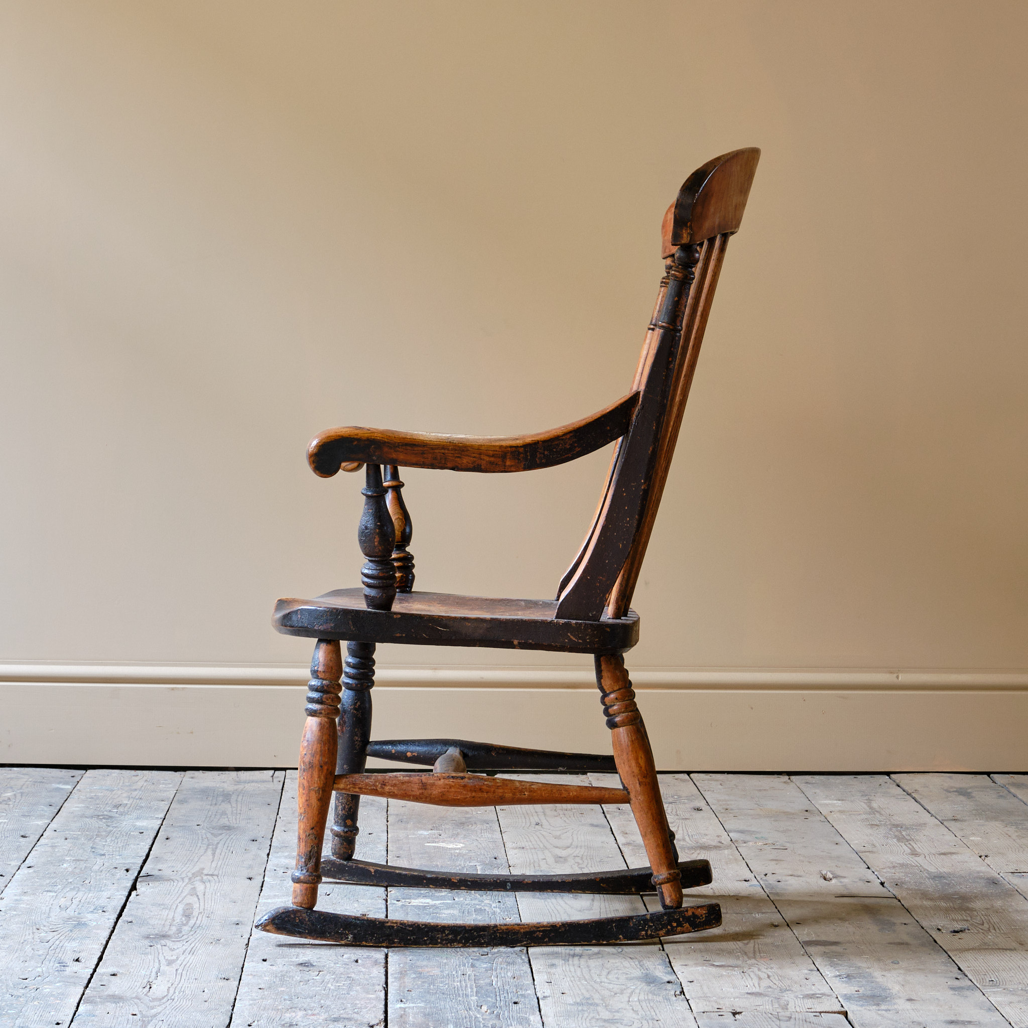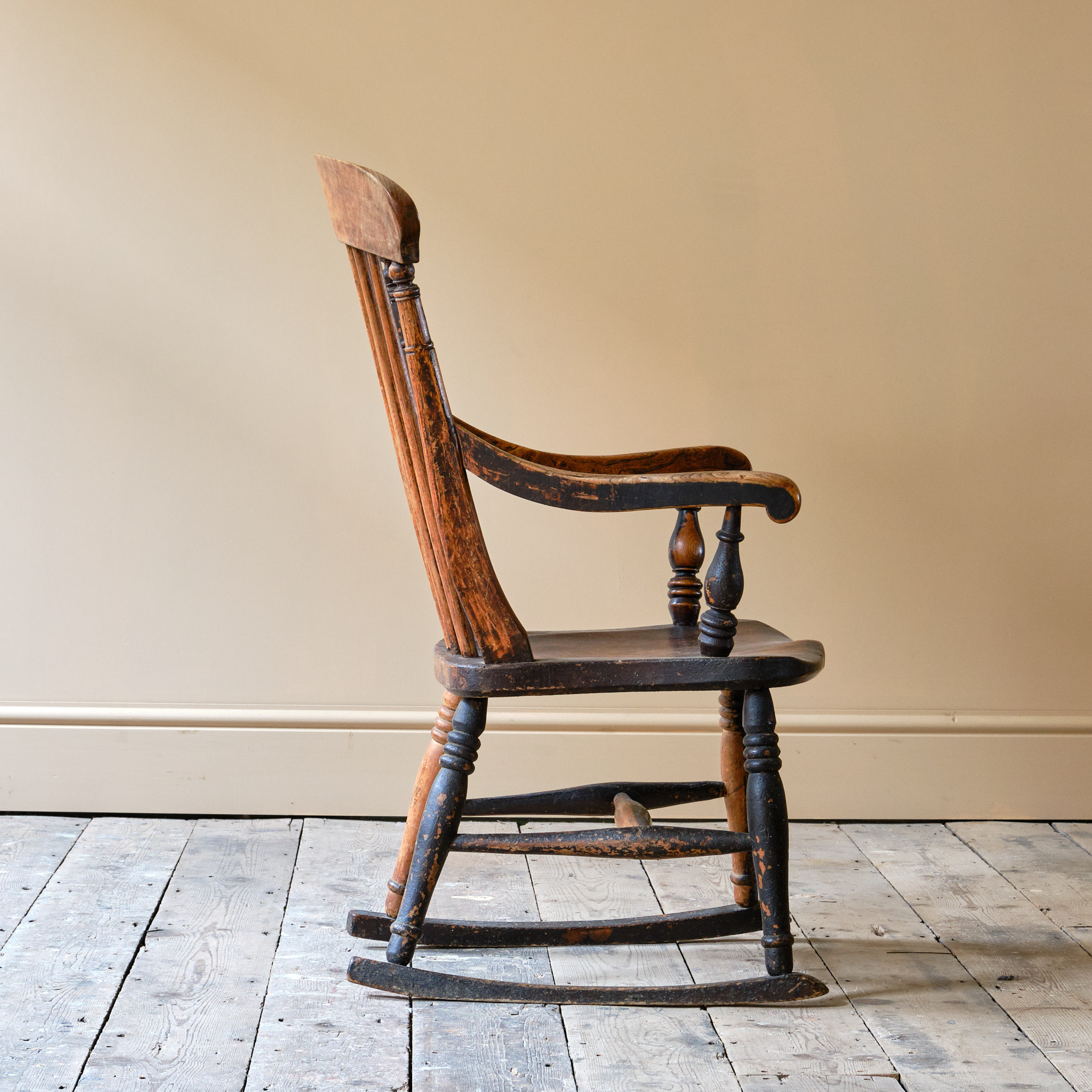 A characterful 19th century Ash and Elm Windsor rocking chair. The rockers with flat spots due to use and the timber has taken on quite a nice dry surface patina with remnants of its original crusty paint.