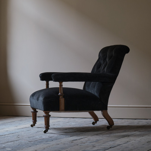 A 19th century swivel chair by Druce & Co, raised on rosewood turned legs and arm supports with the original casters. Upholstered in a good quality leather with buttoned c1850 detailed back.