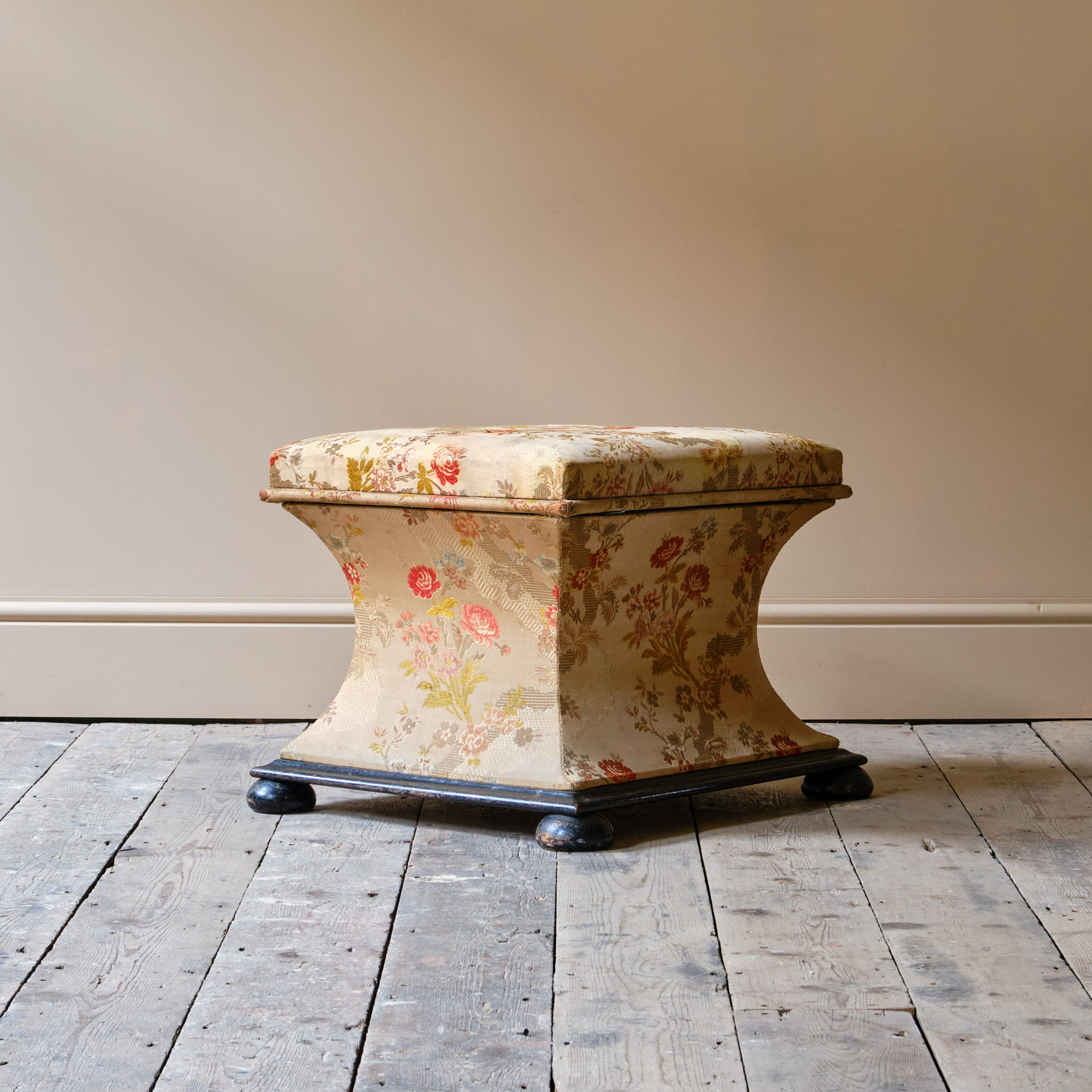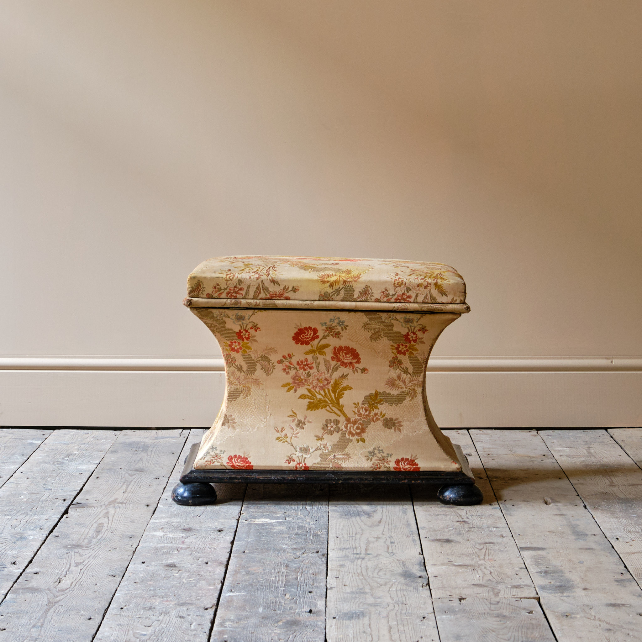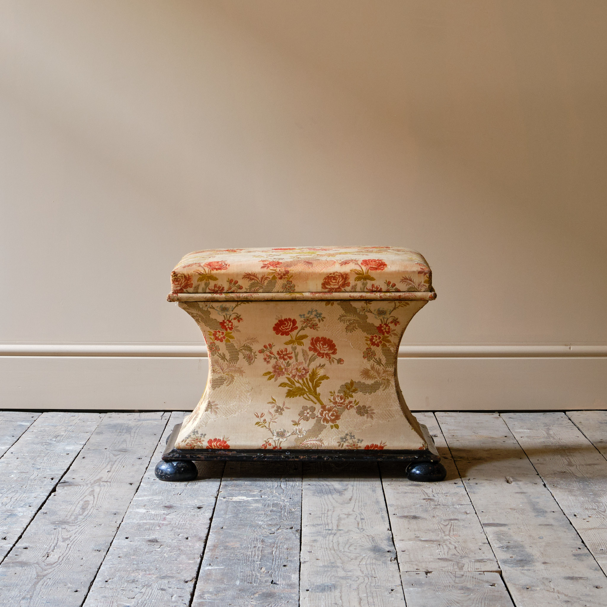A 19th century country house sarcophagus box ottoman. The pine frame raise on an ebonized base and feet. The lift up lid opens to reveal a white linen interior and the outside in possibly the original floral fabric.