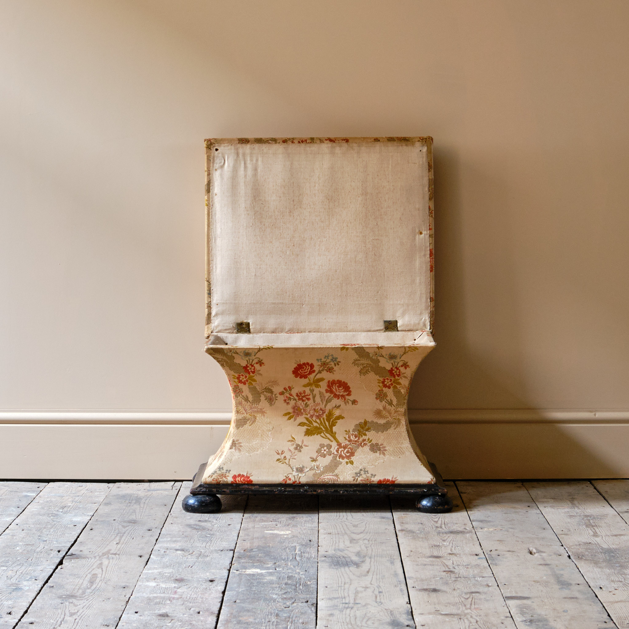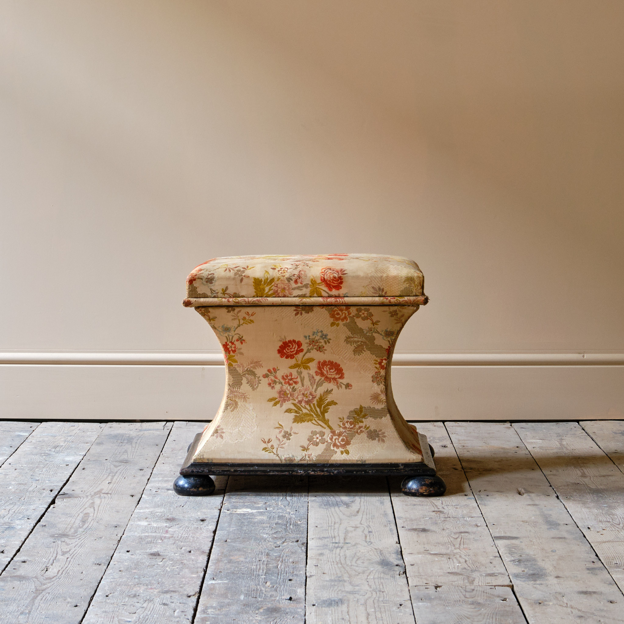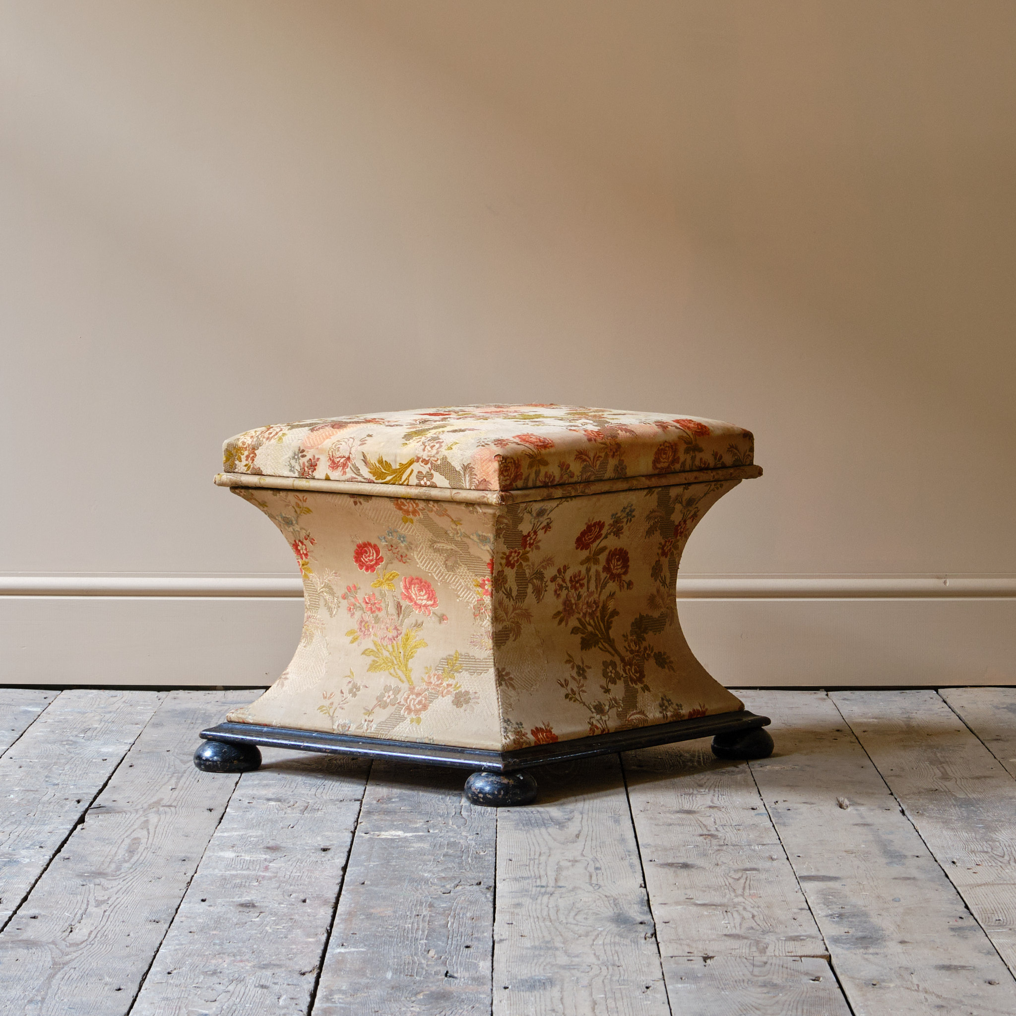 A 19th century country house sarcophagus box ottoman. The pine frame raise on an ebonized base and feet. The lift up lid opens to reveal a white linen interior and the outside in possibly the original floral fabric.