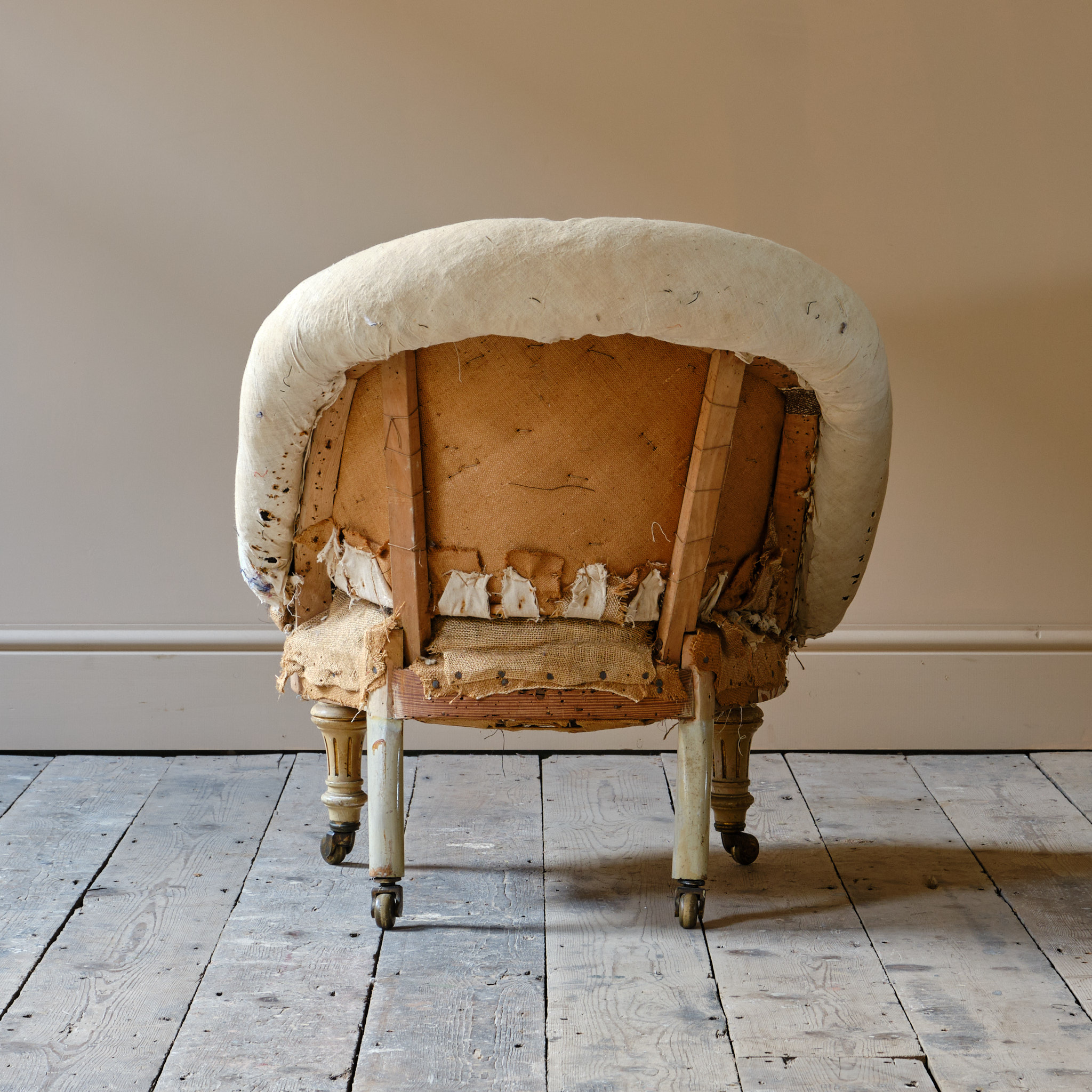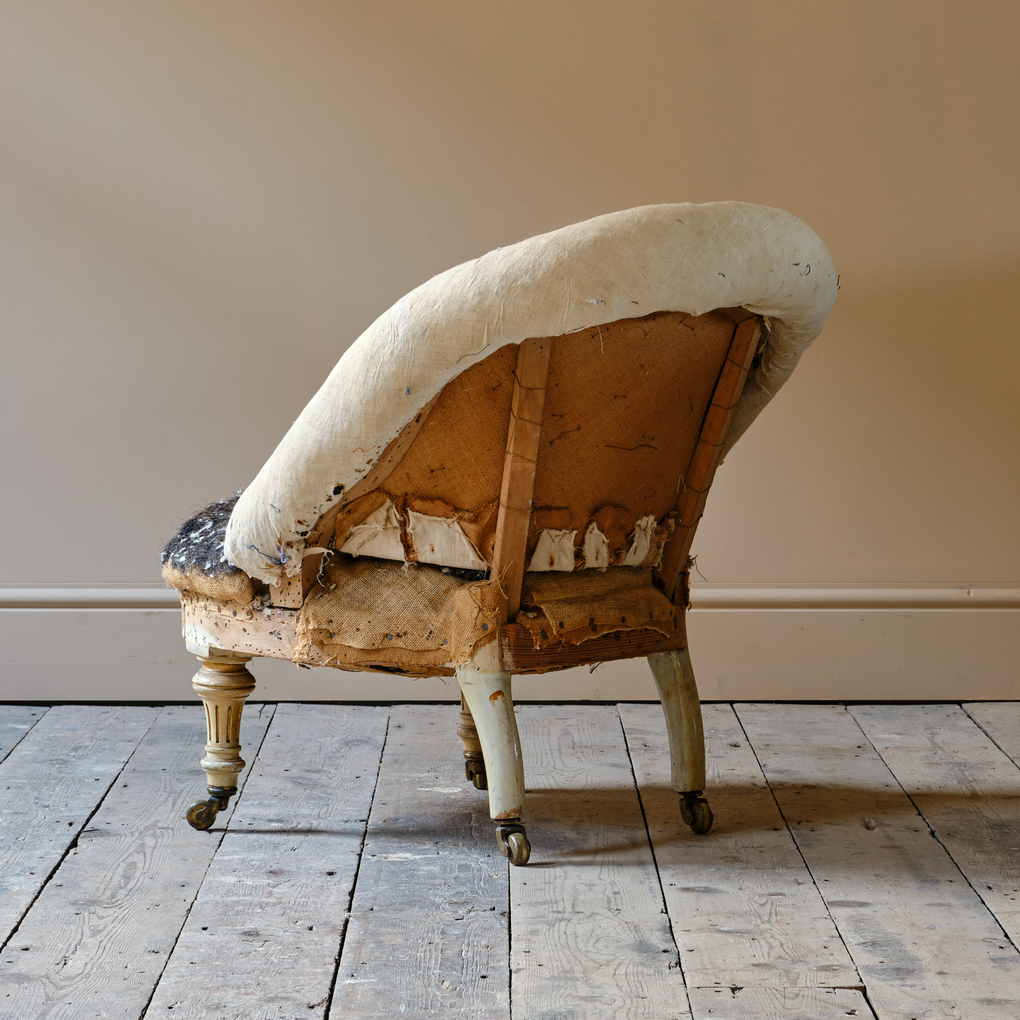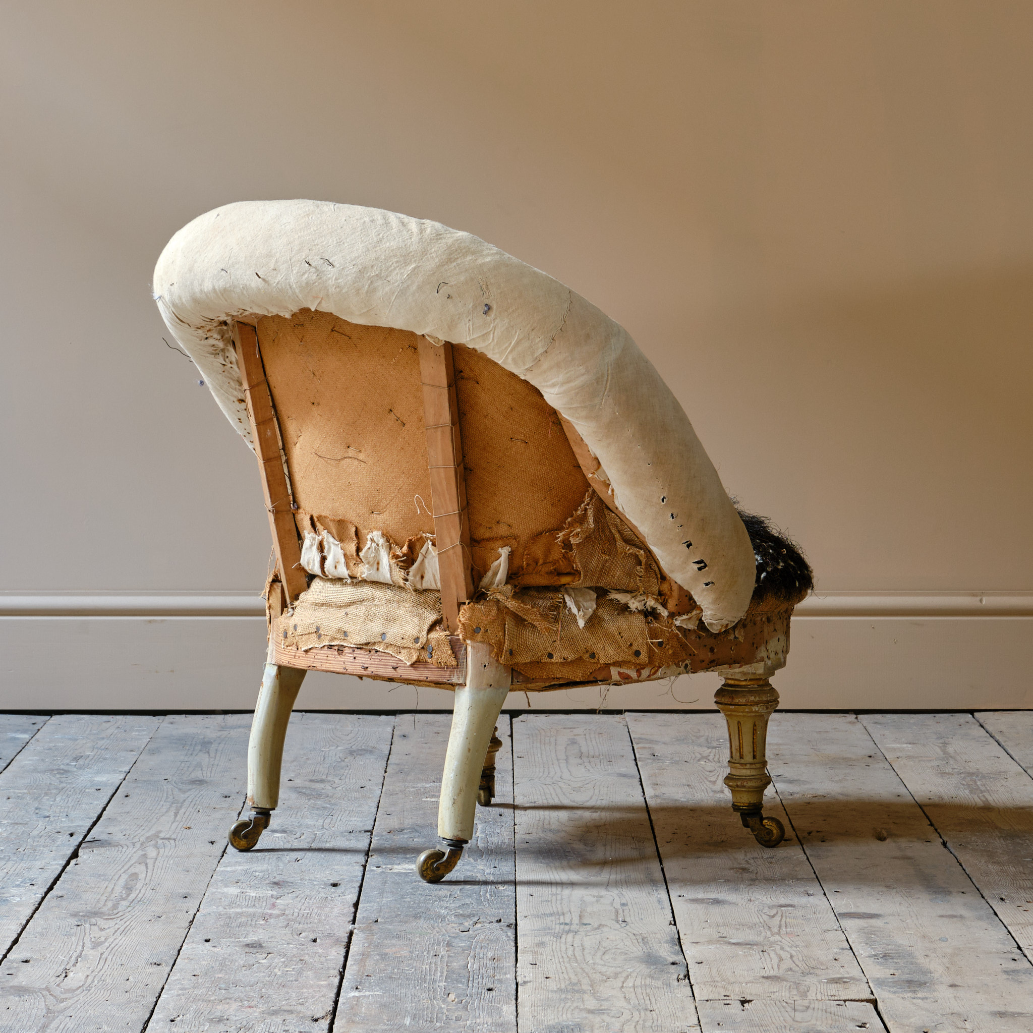 A good quality small 19th century slipper chair. Raised on white painted and gilt legs and the original casters.