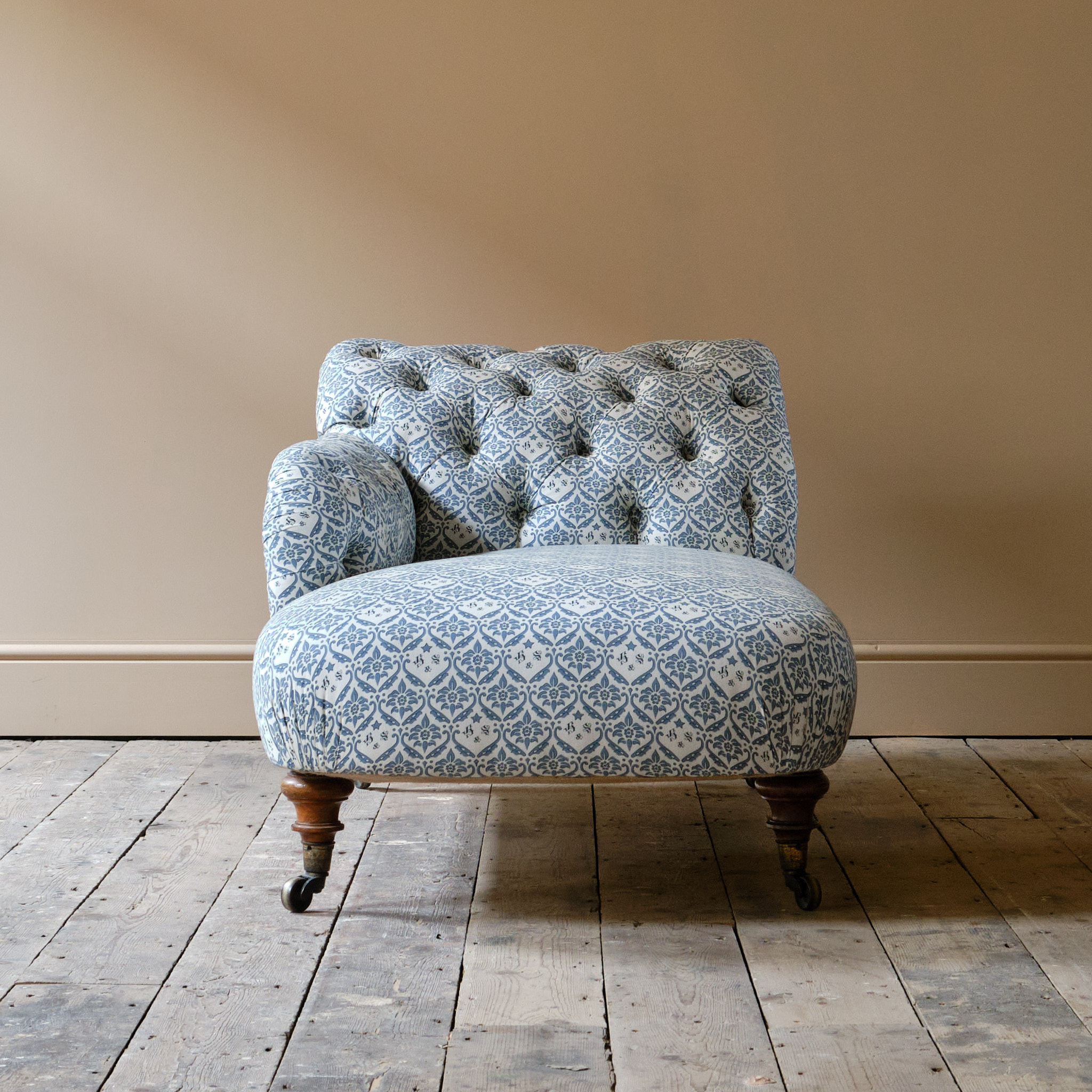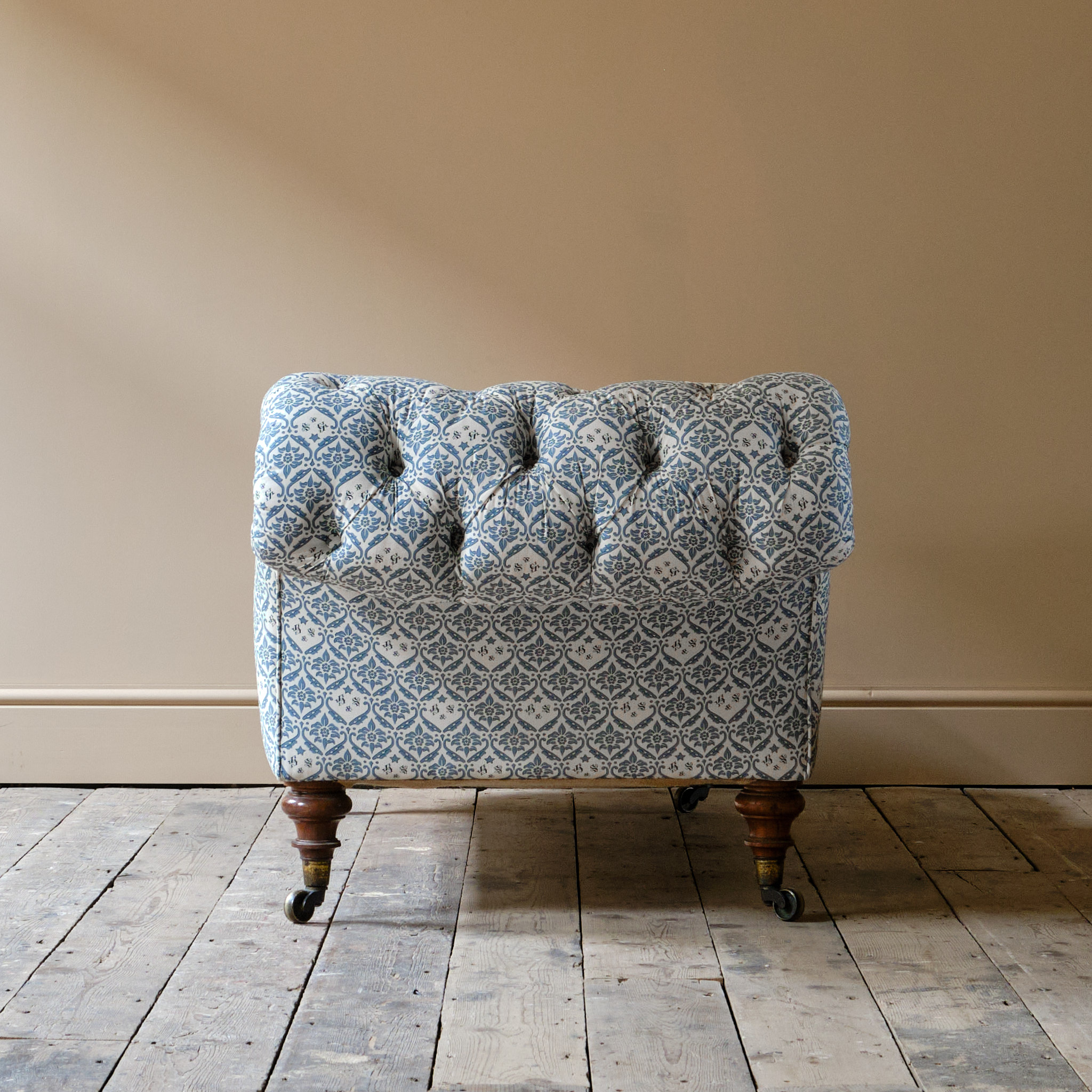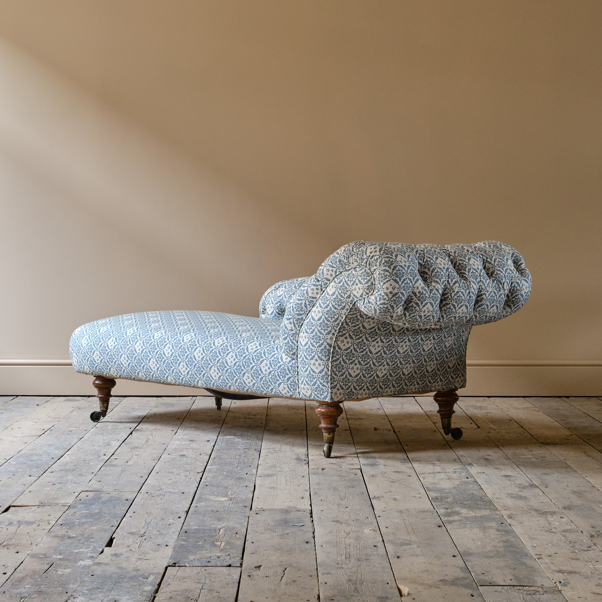 A 19th century chaise lounge by esteemed London maker Howard & Sons. This Chaise lounge dates back to the mid 19th century c1860. Its raised on turned walnut legs with the original Cope & Collinson brass casters. Structurally in good solid condition and retaining its original stretcher rail to the underside. Upholstered by us in H&S blue and white monogram ticking to a good standard and with its original Howard and Sons factory buttoned horse hair to the arm and back rest.