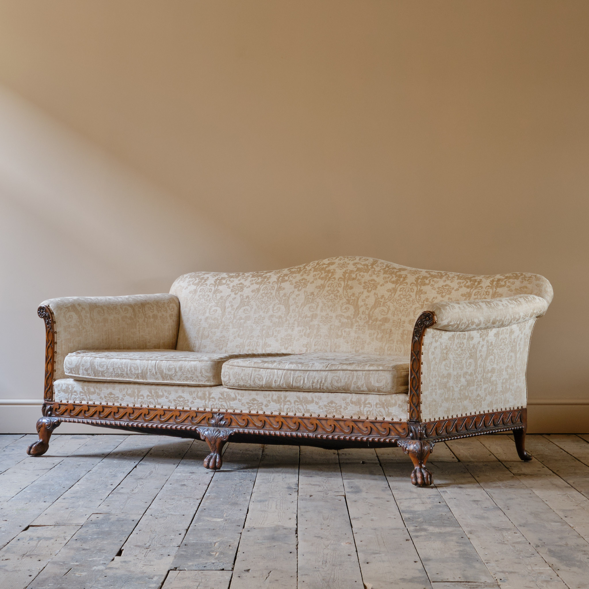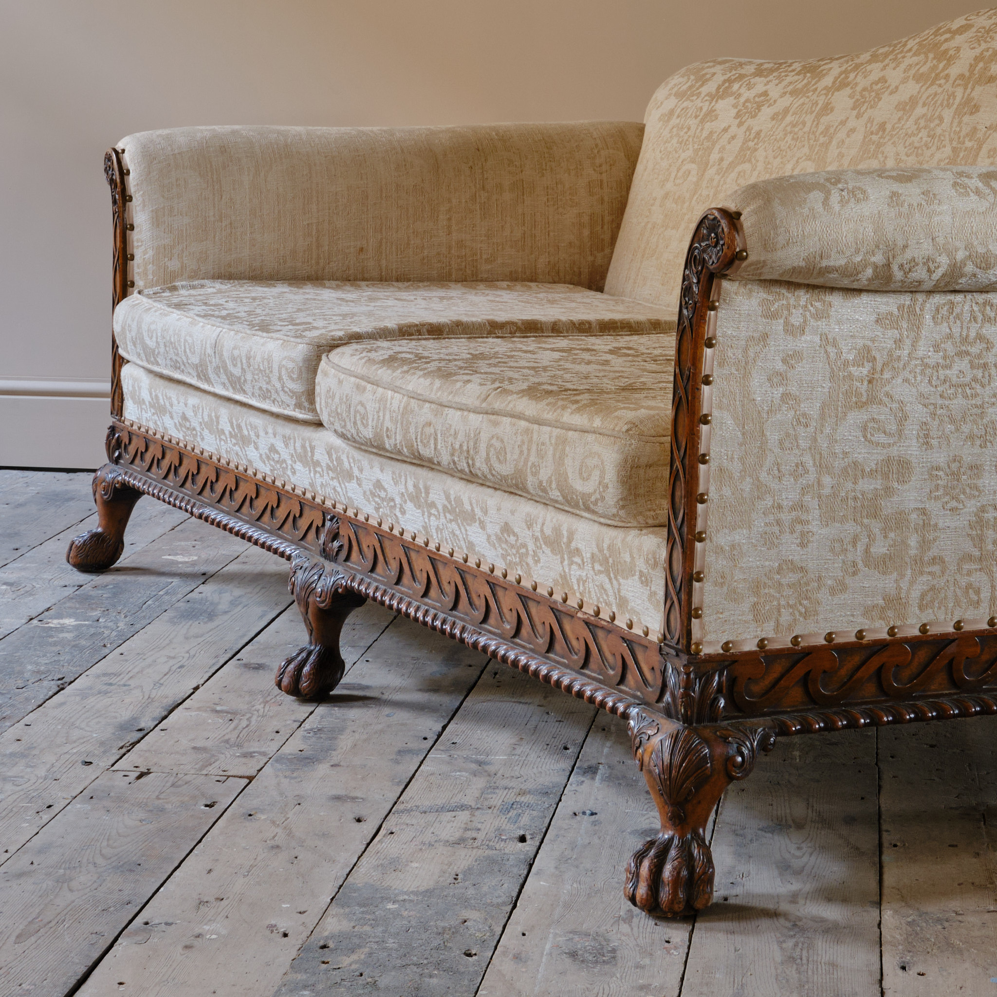 A well drawn antique deep seated country house sofa. Raised on 3 crisply carved paw front feet and splayed rear legs The innards are traditional and are firm and intact. . English c1900