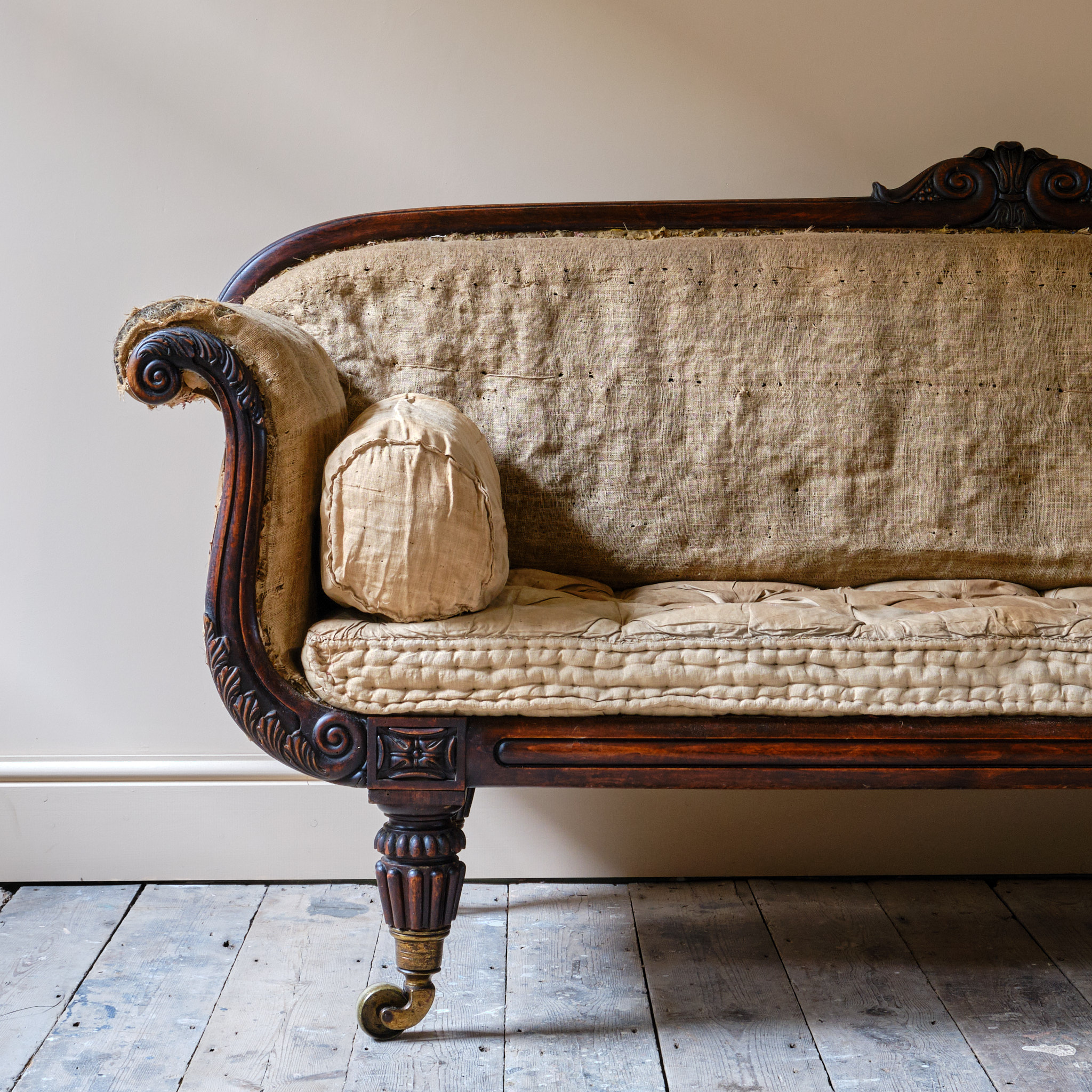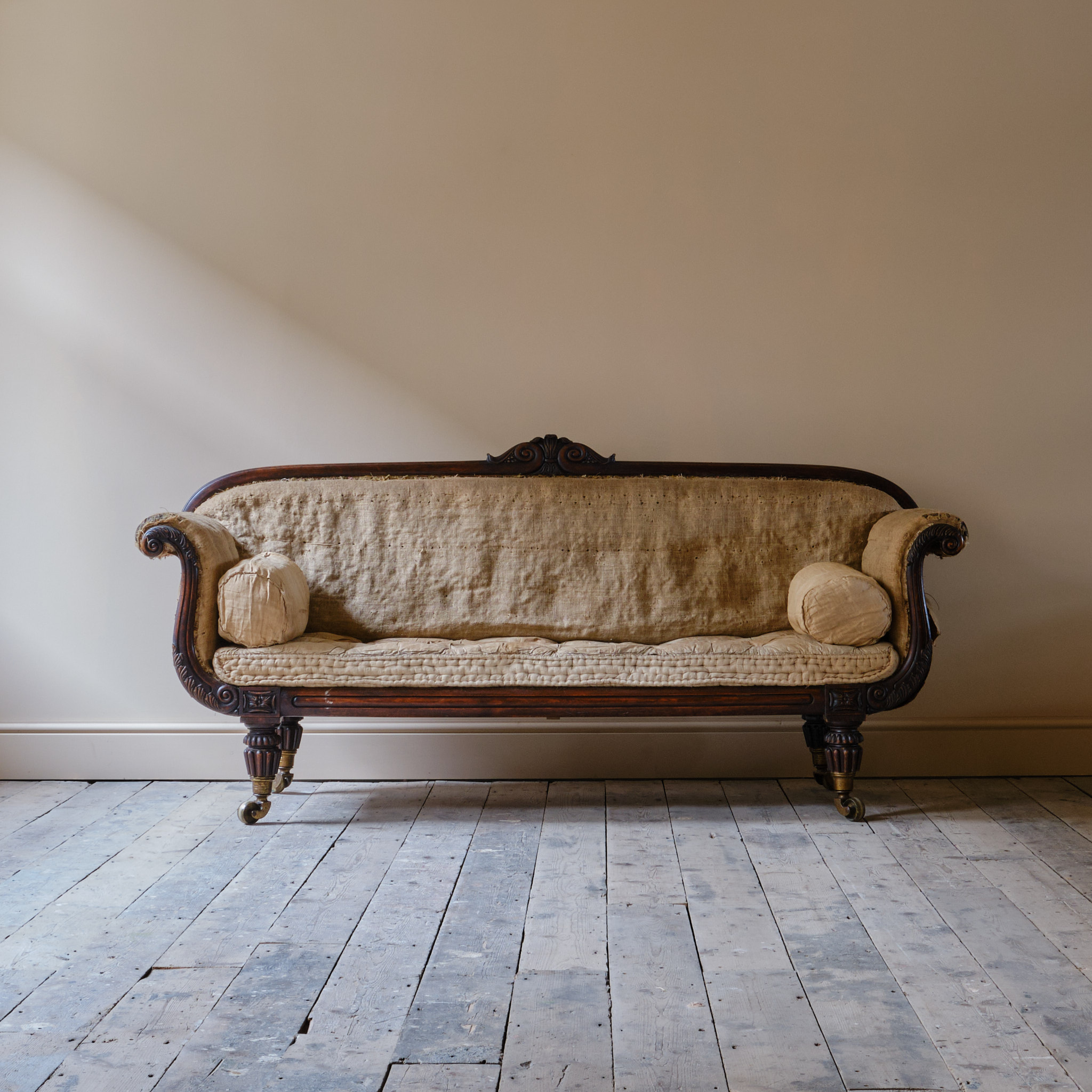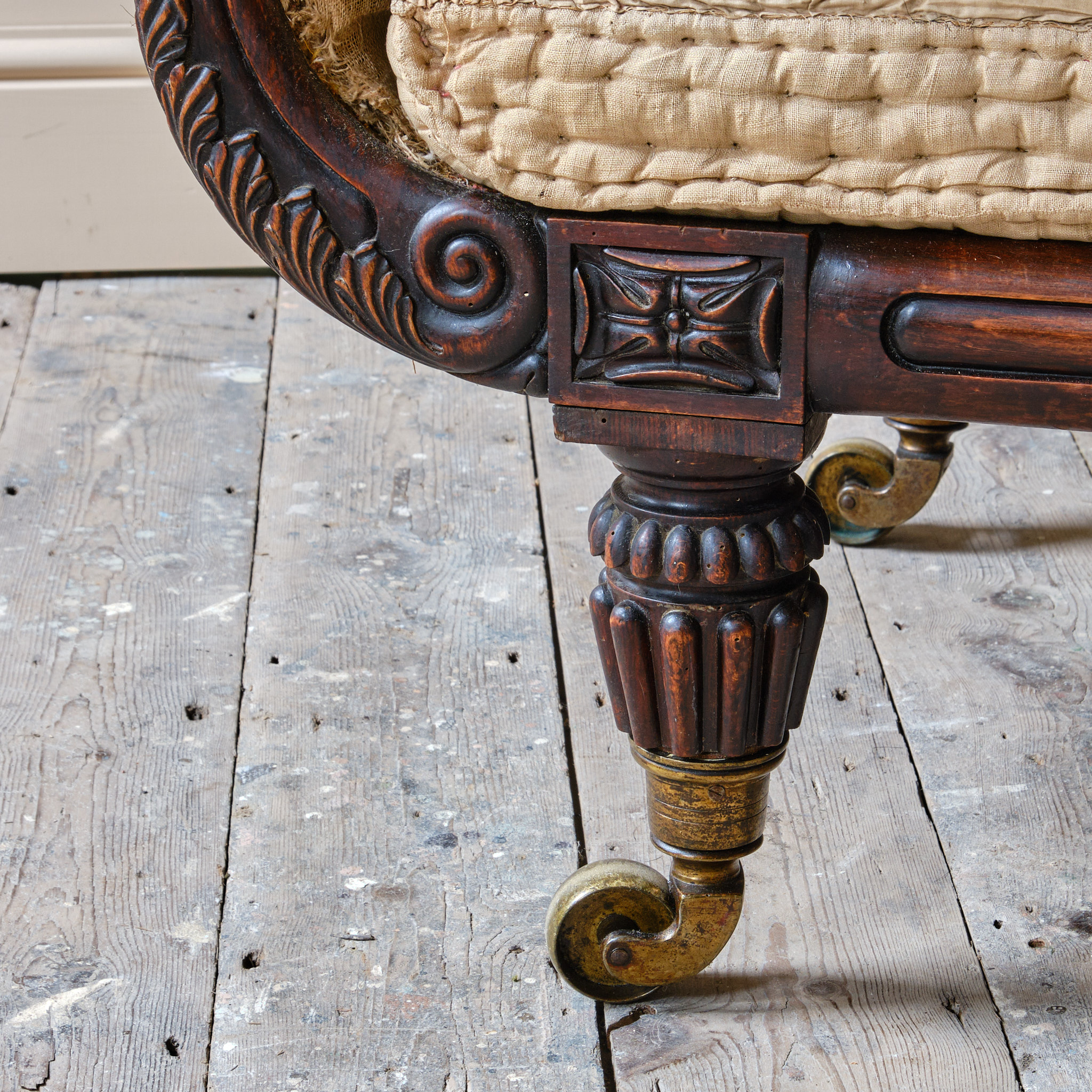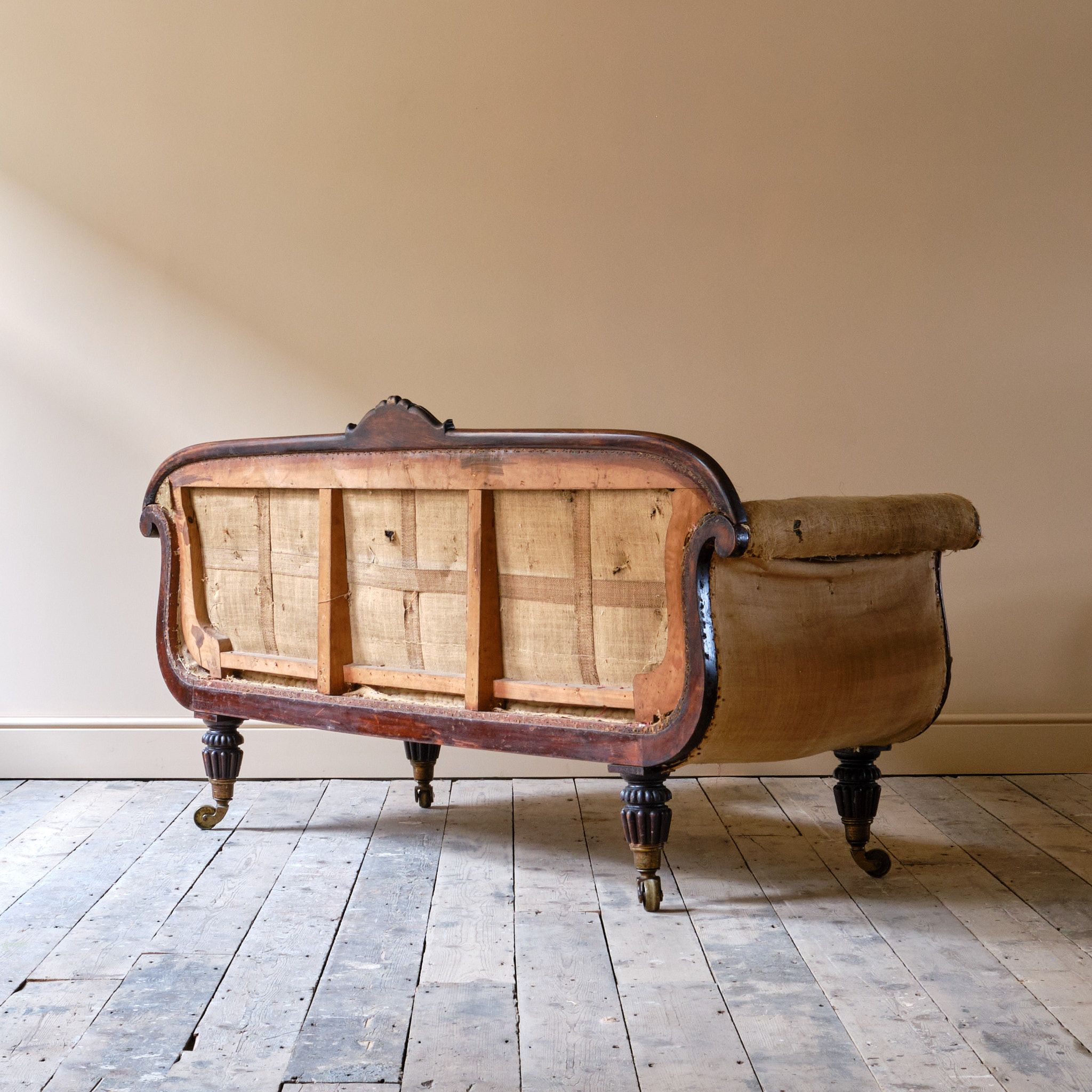A superb early 19th century simulated Rosewood country house sofa. Raised on thick reeded and gadrooned legs with over sized Lewty brass casters.