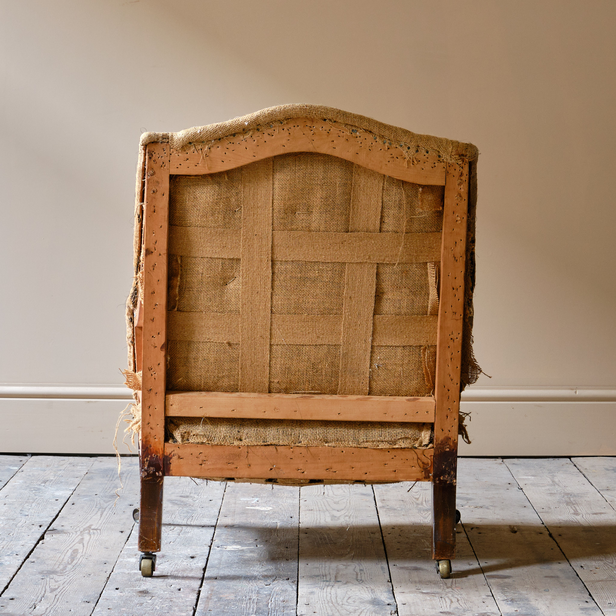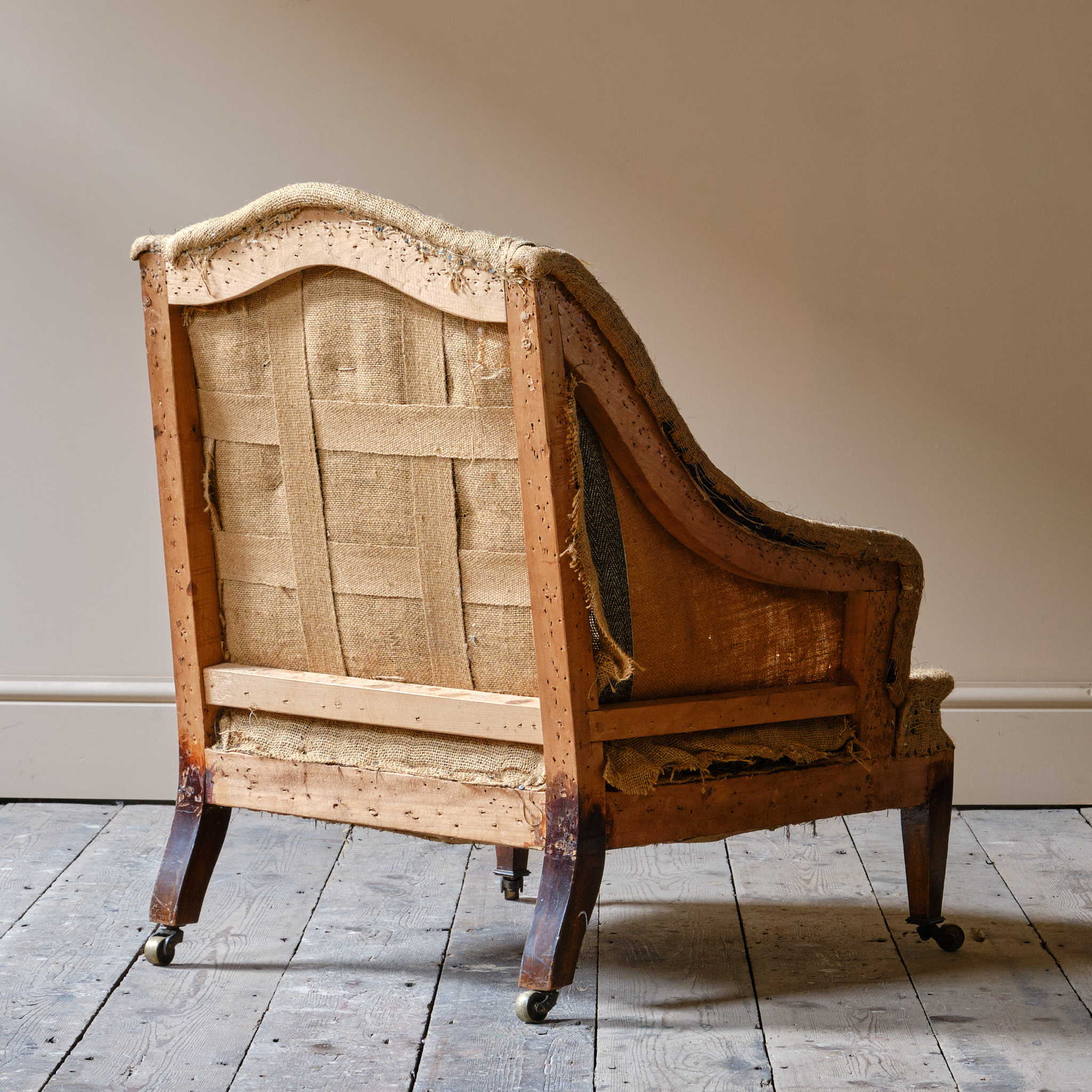 A good little c1900 armchair raised on square tapered legs and the original brass casters.