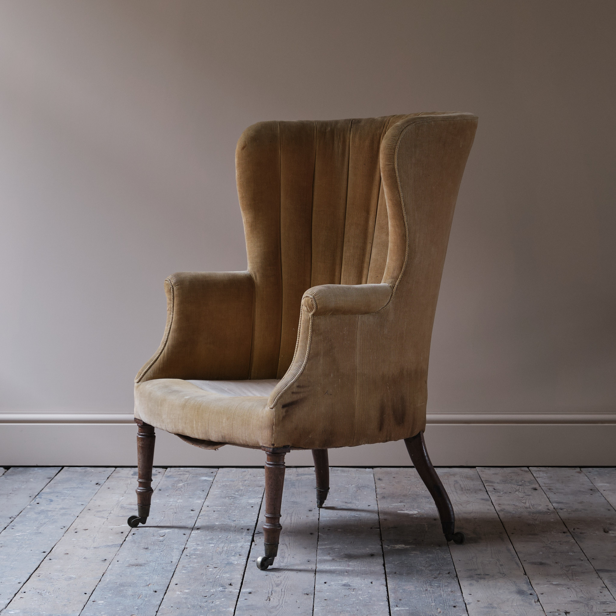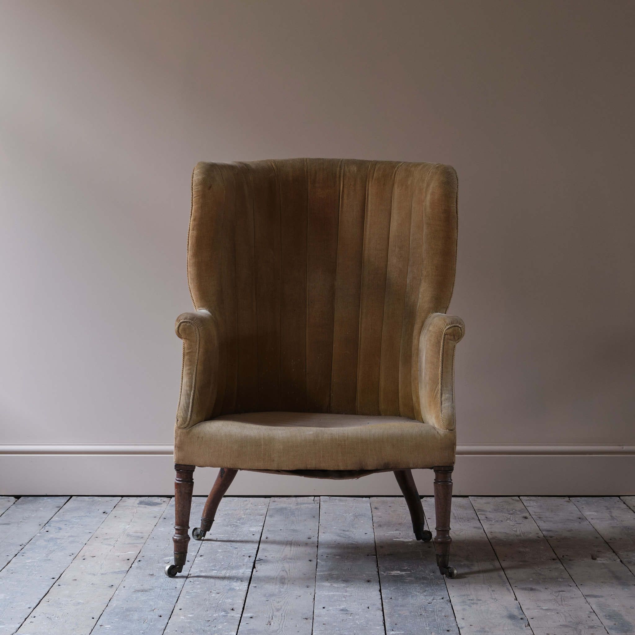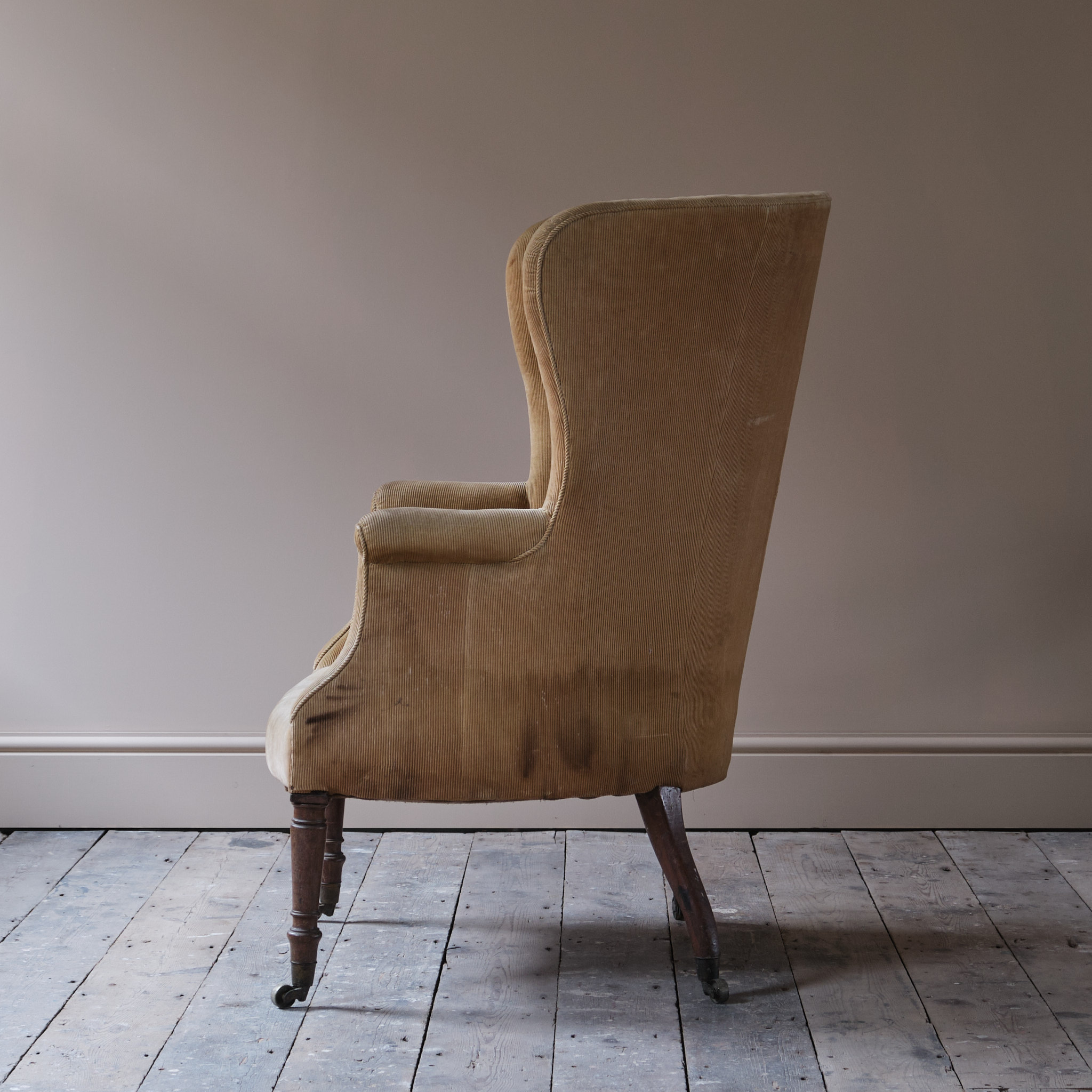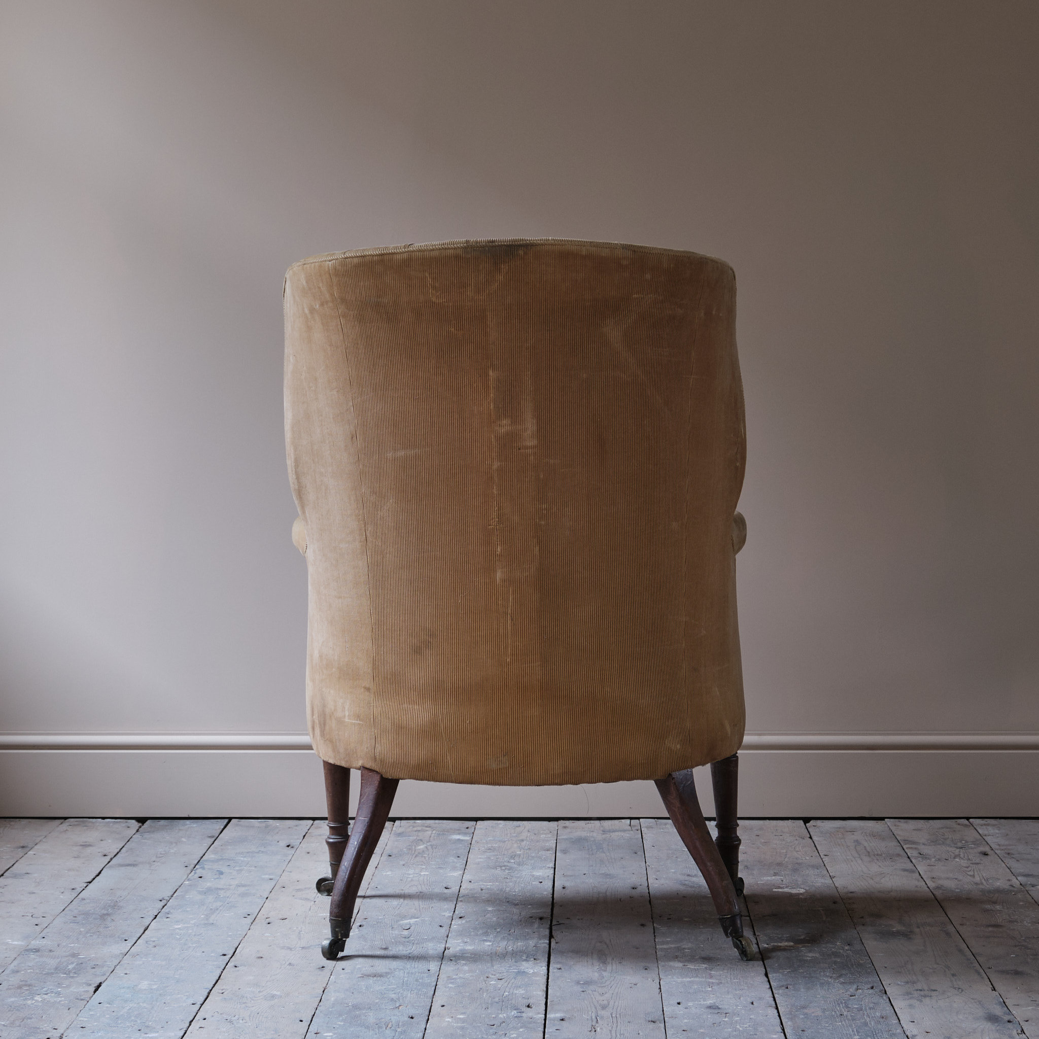 An early 19th century country house barrel back armchair. Raised on turned front legs and dramatic splayed rear legs.