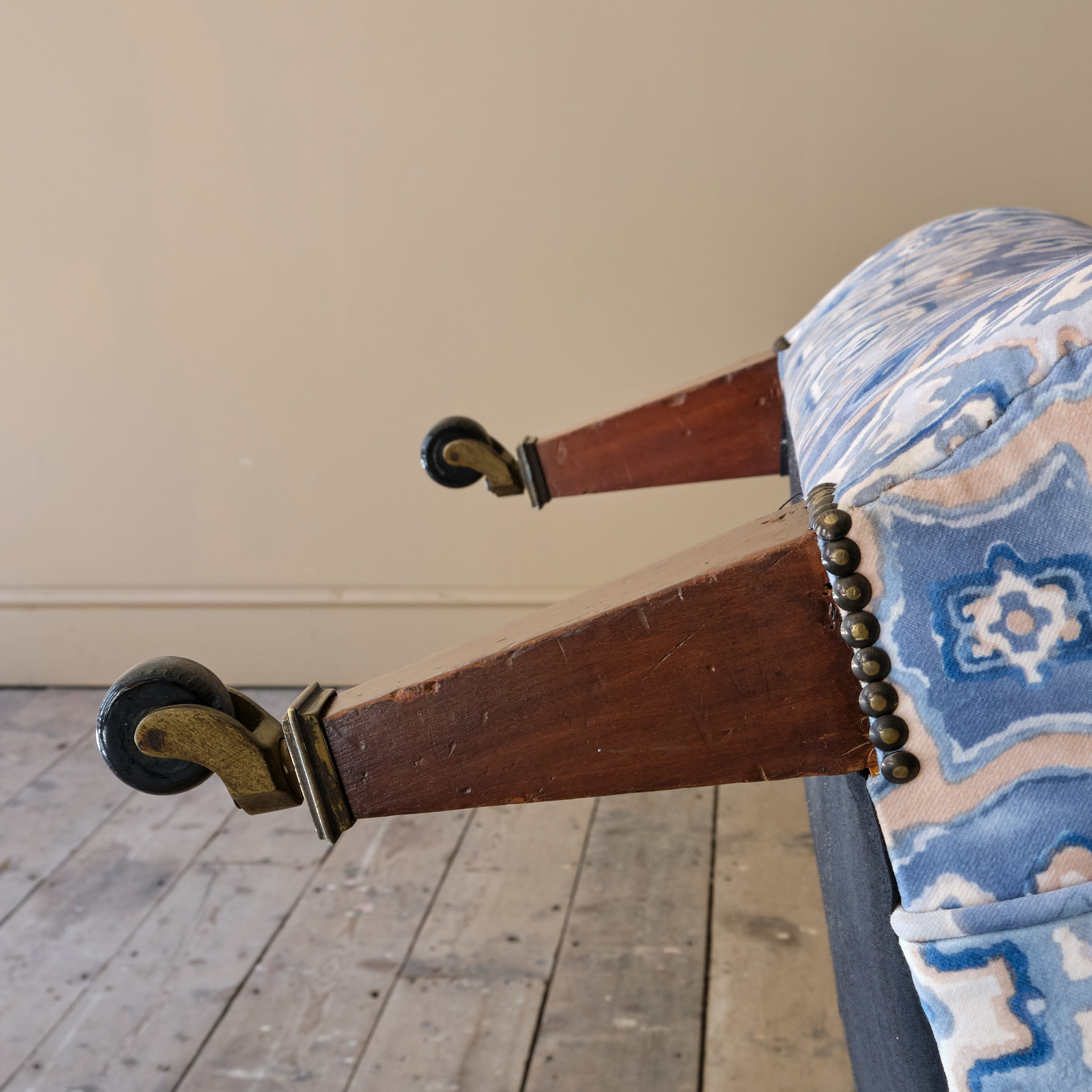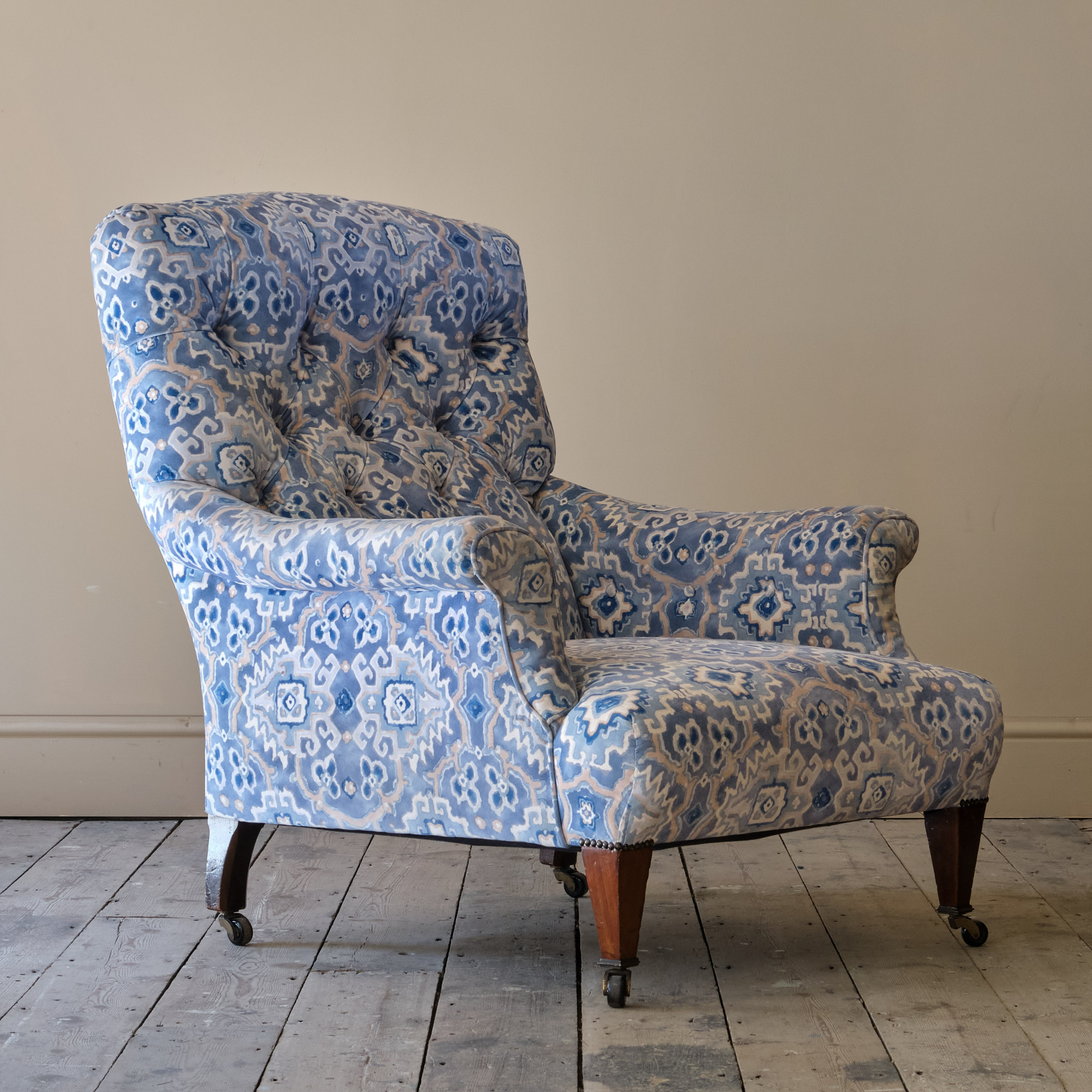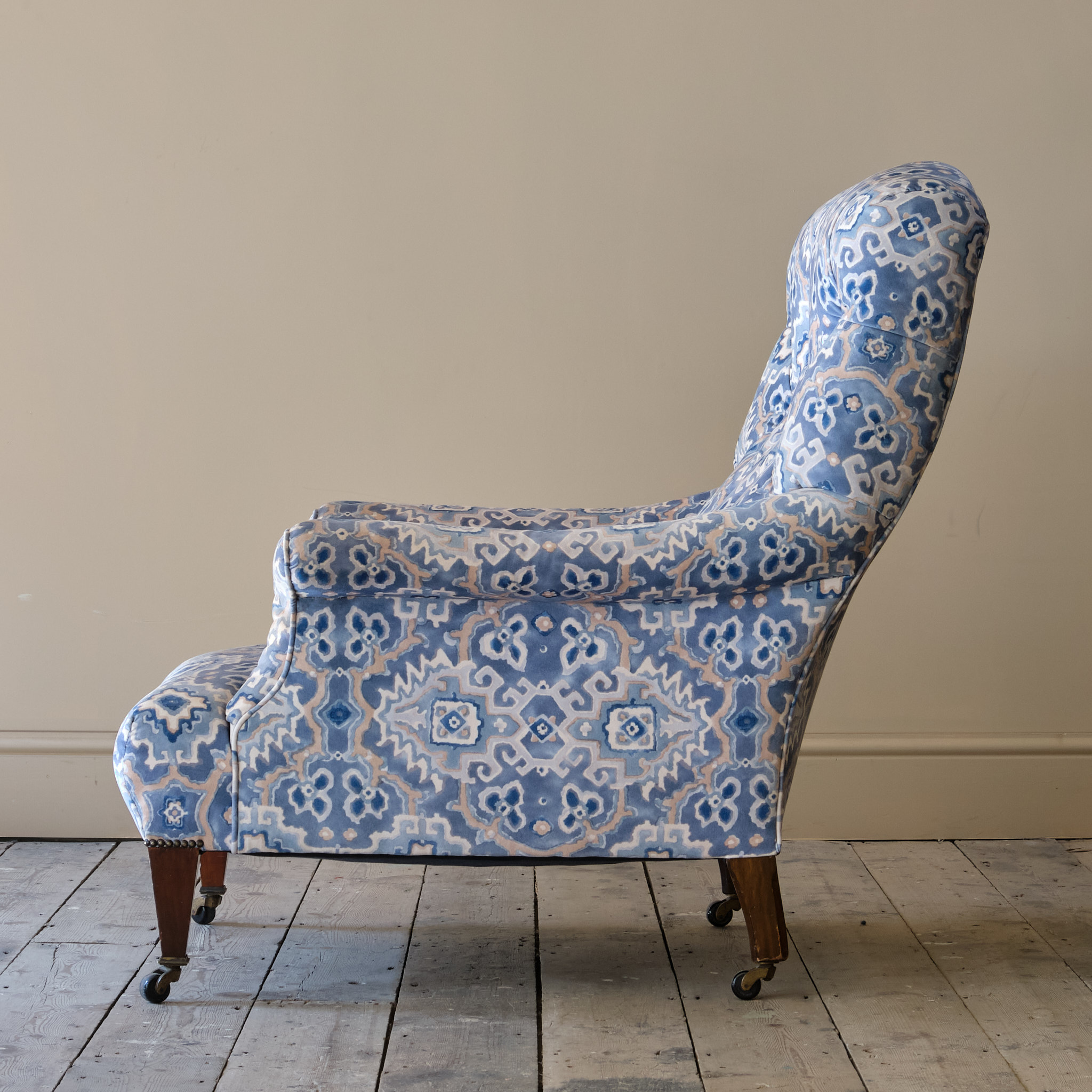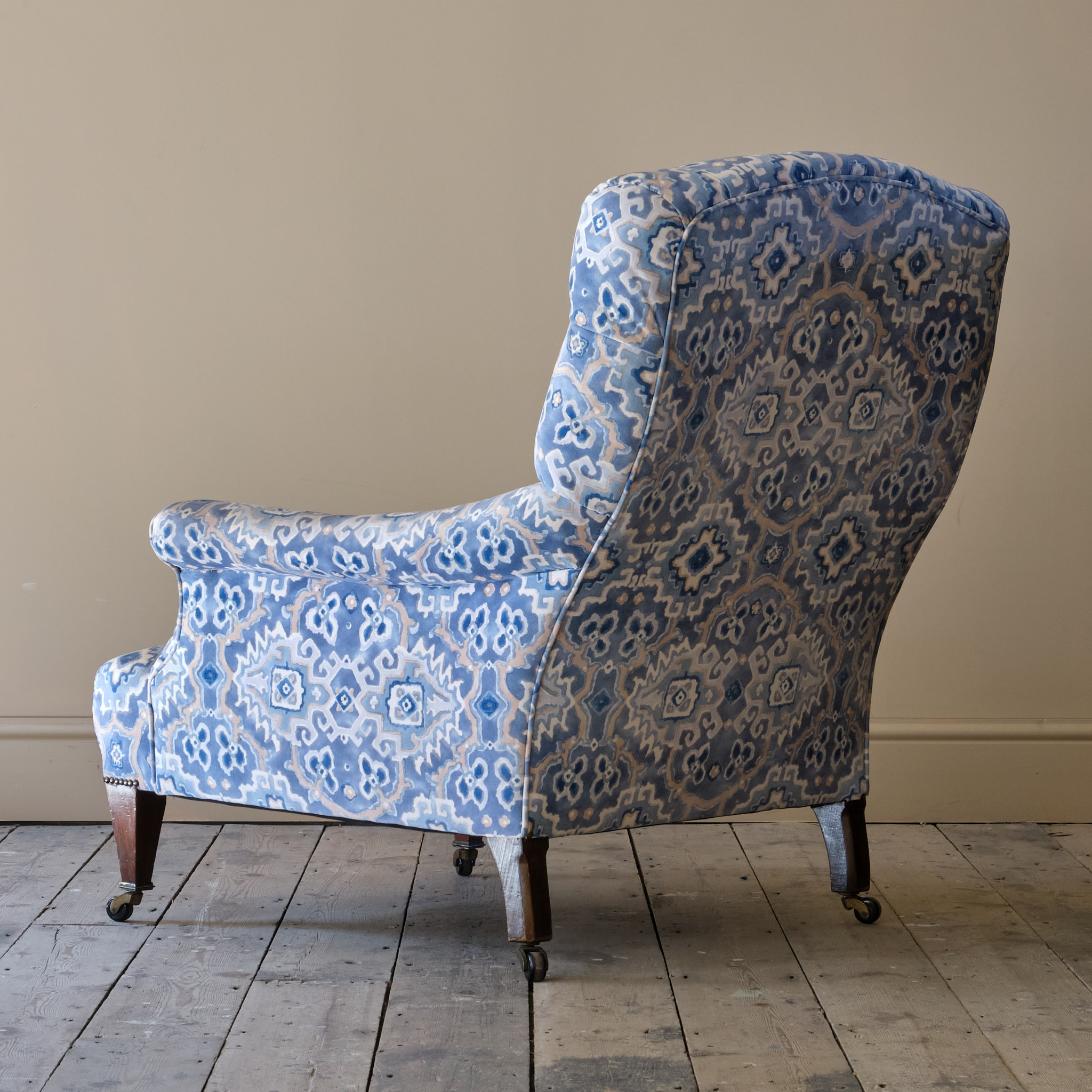 The chair has been recently recovered into the printed velvet as shown. It is in presentable condition with some light marks to the fronts of the arms.
