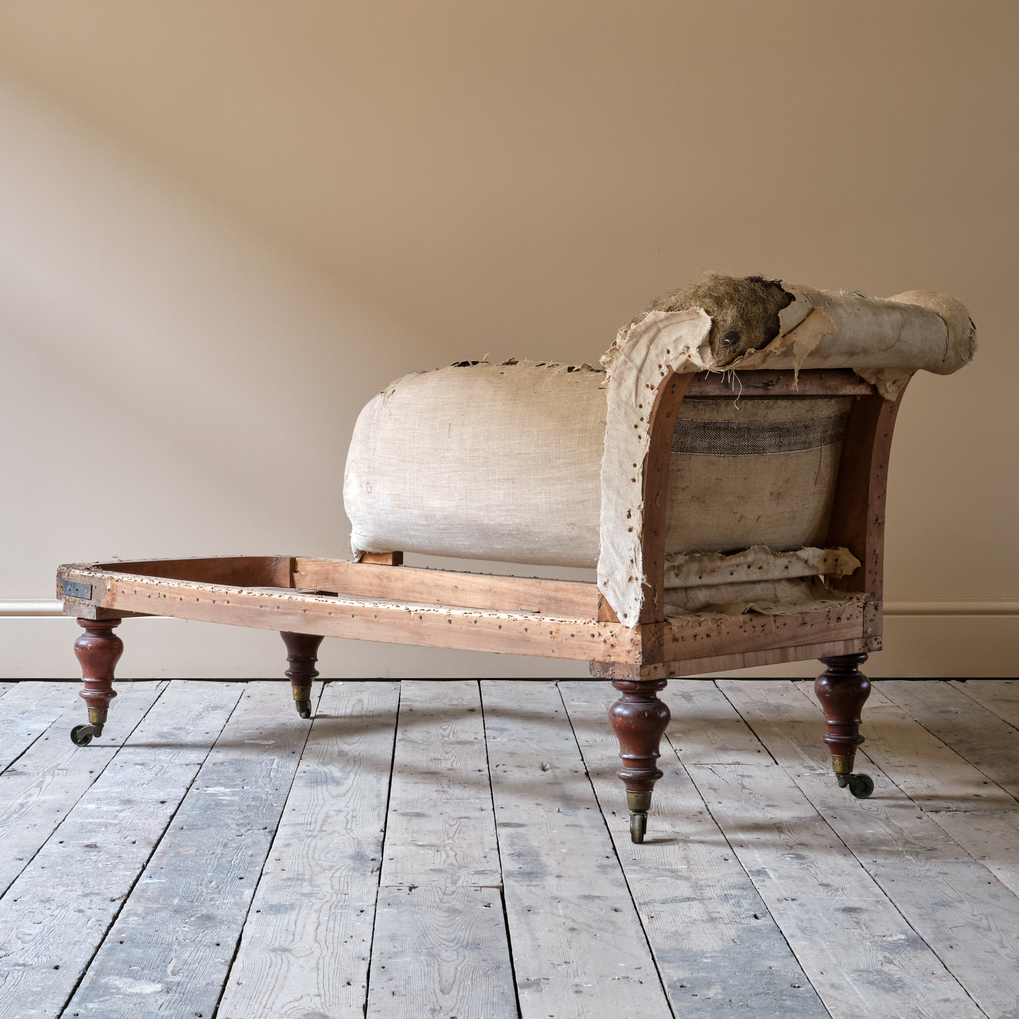 A well drawn mid 19th Century Chaise Longue attributed to Holland & Sons - London. Raised on 4 turned legs and the original Cope & Collinson brass casters. English c1840