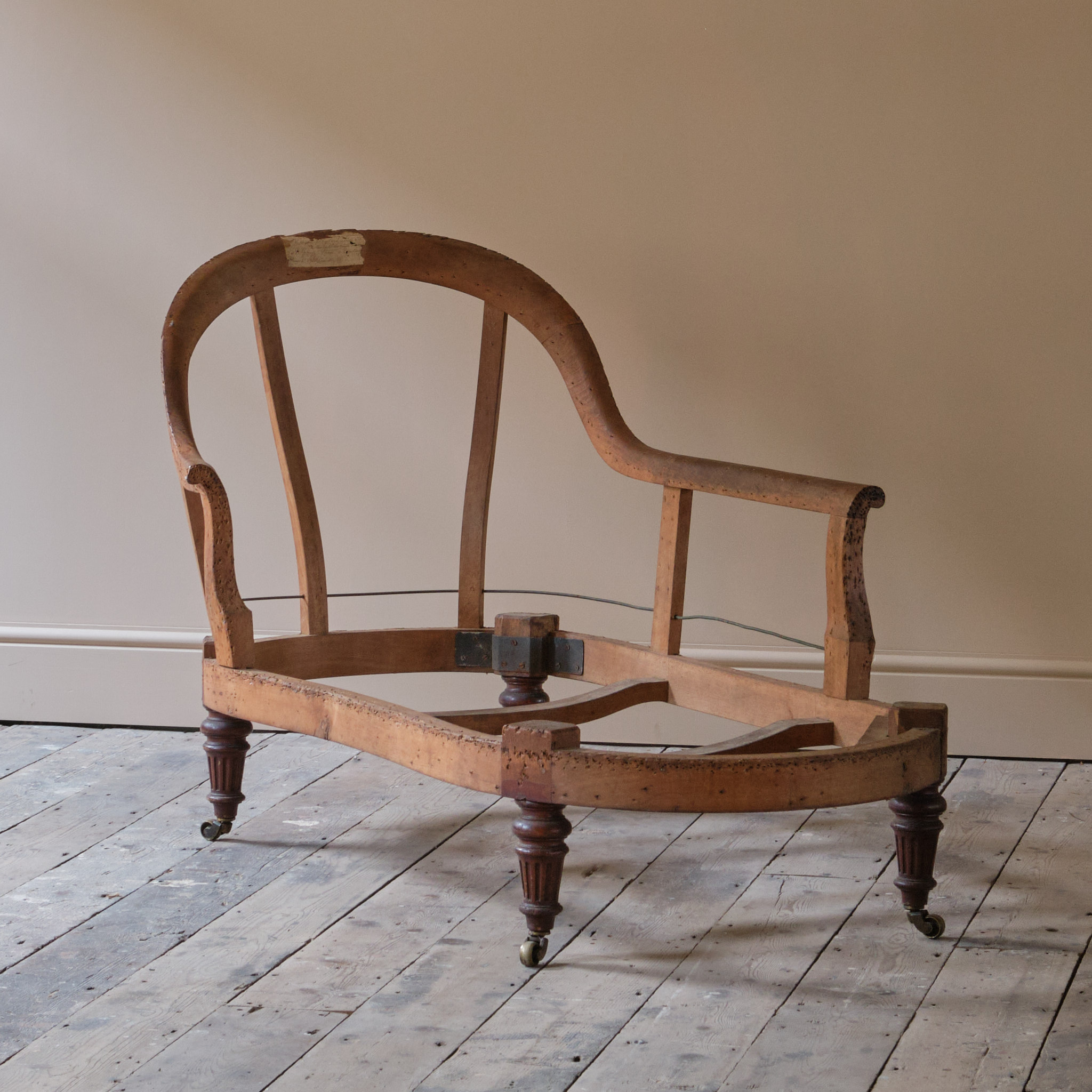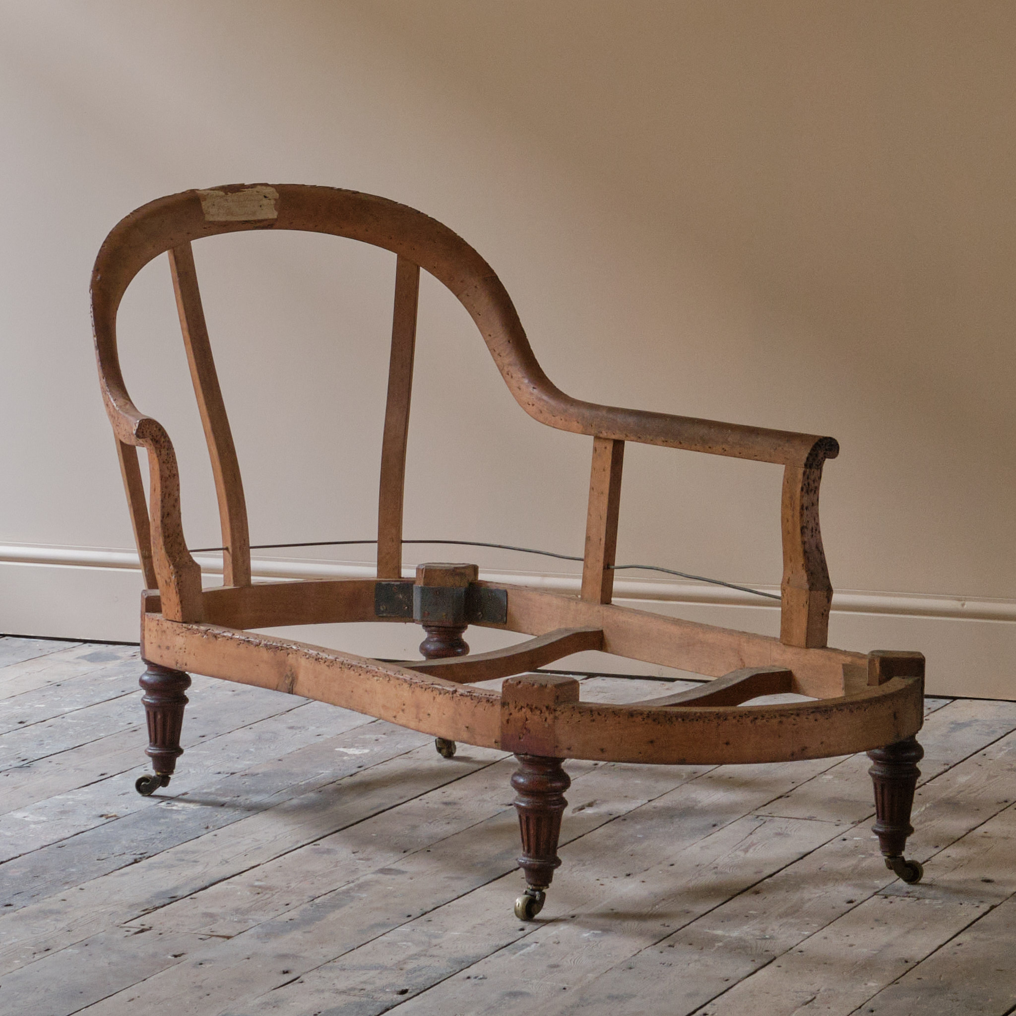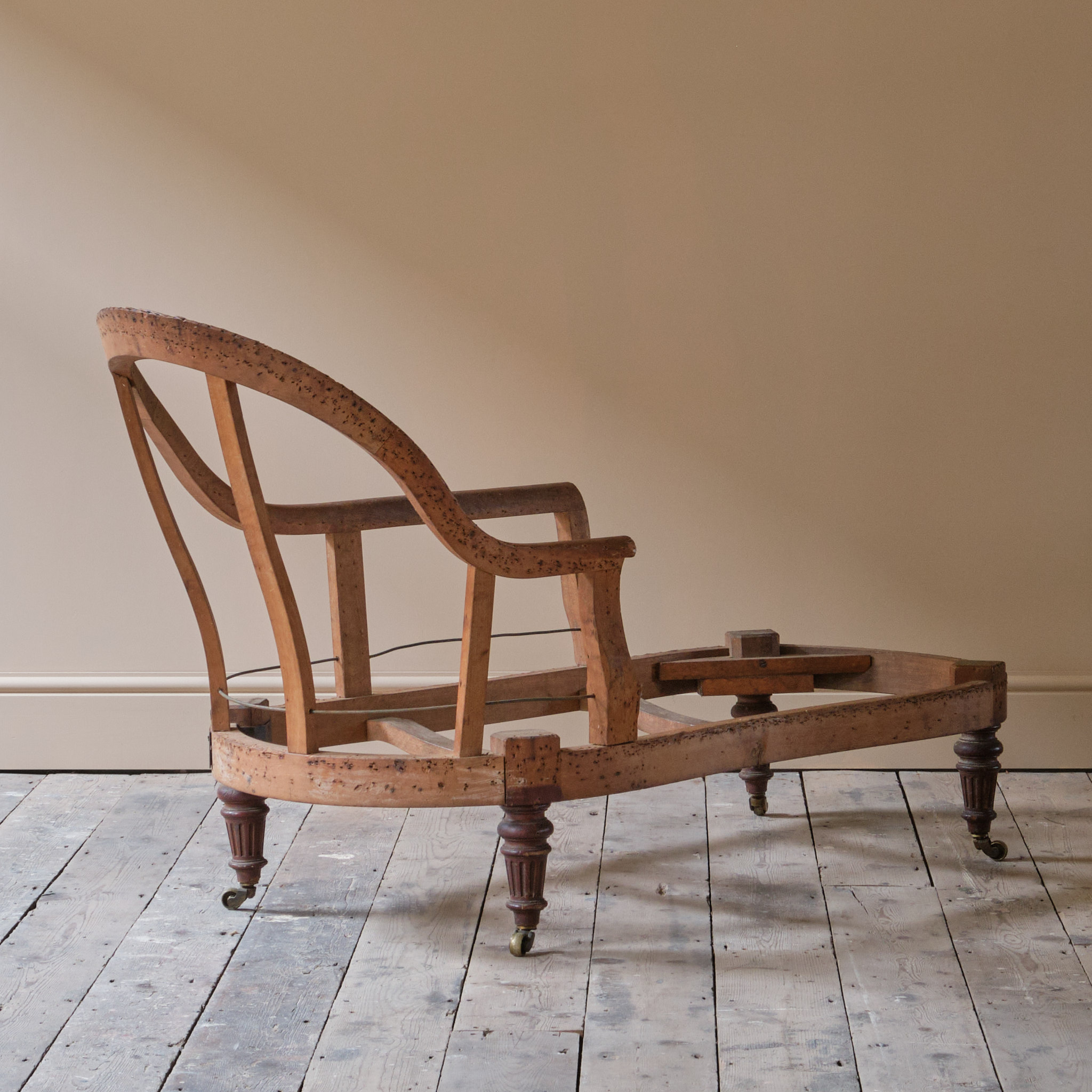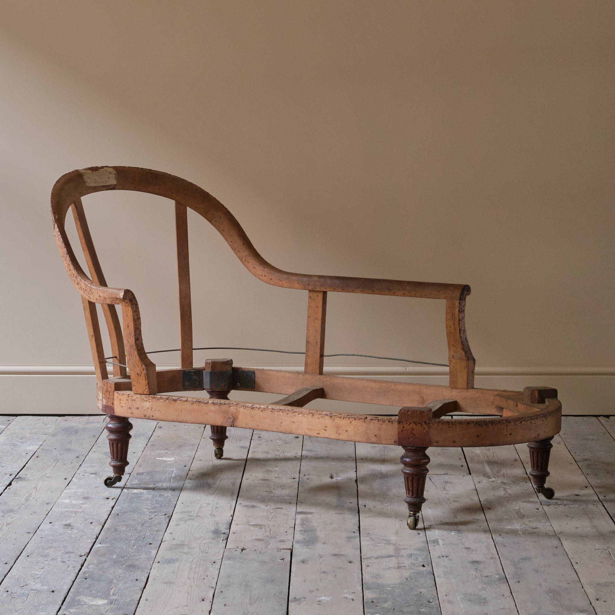 A shapely mid 19th century country house walnut chaise longue frame. Raised on 4 turned legs.