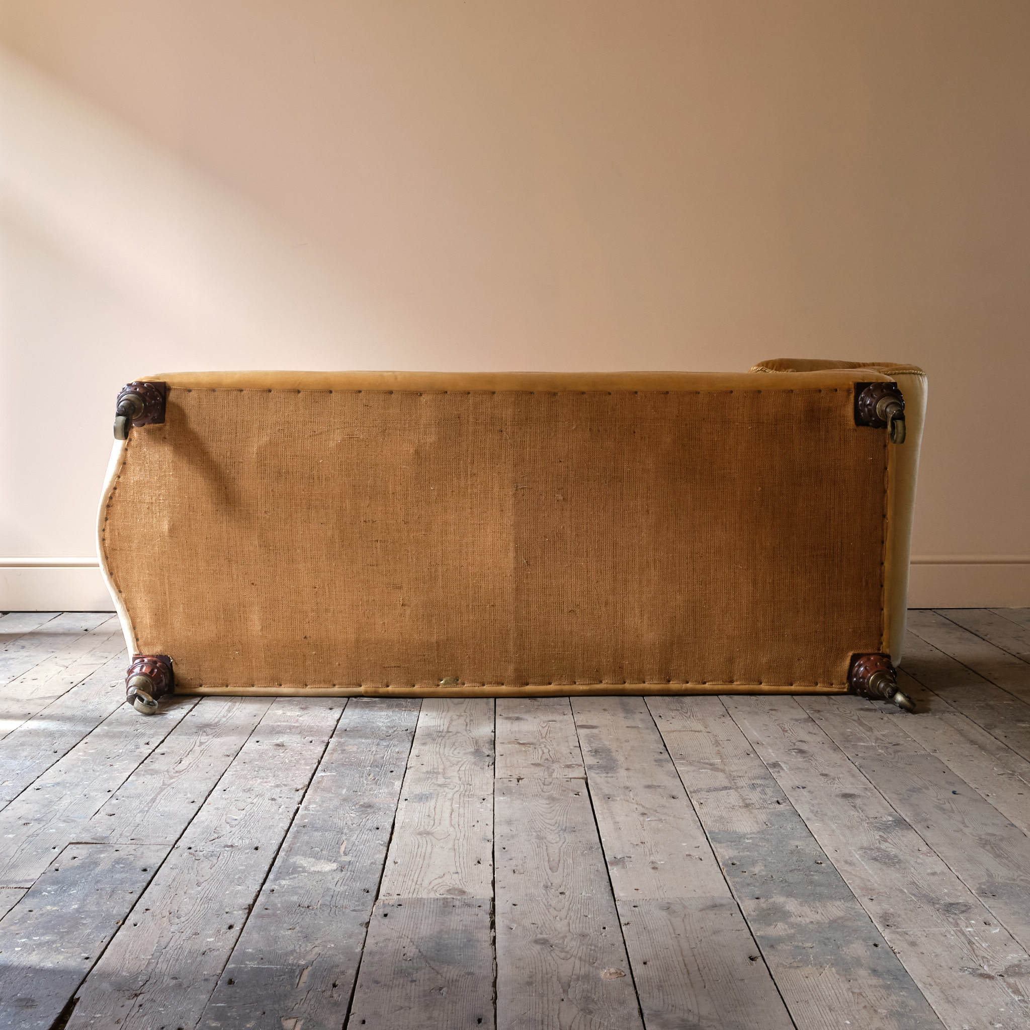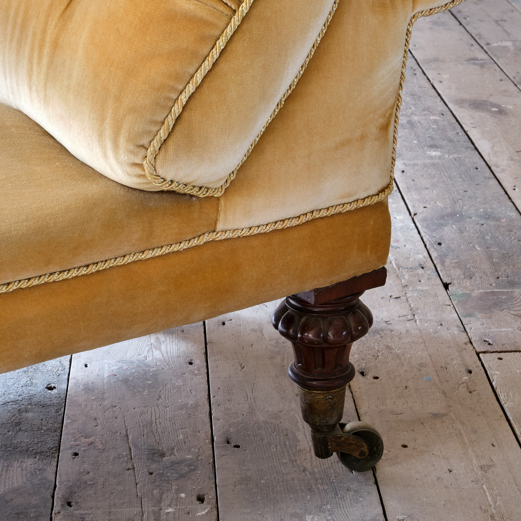 A mid 19th century country house daybed in the manner of Gillows. English c1860. Raised on 4 Gadrooned turned legs and brass casters. A pleasing shape and a long seat with a serpentine front rail. The back rest with with a comfortable sprung interior and a buttoned arm rest.