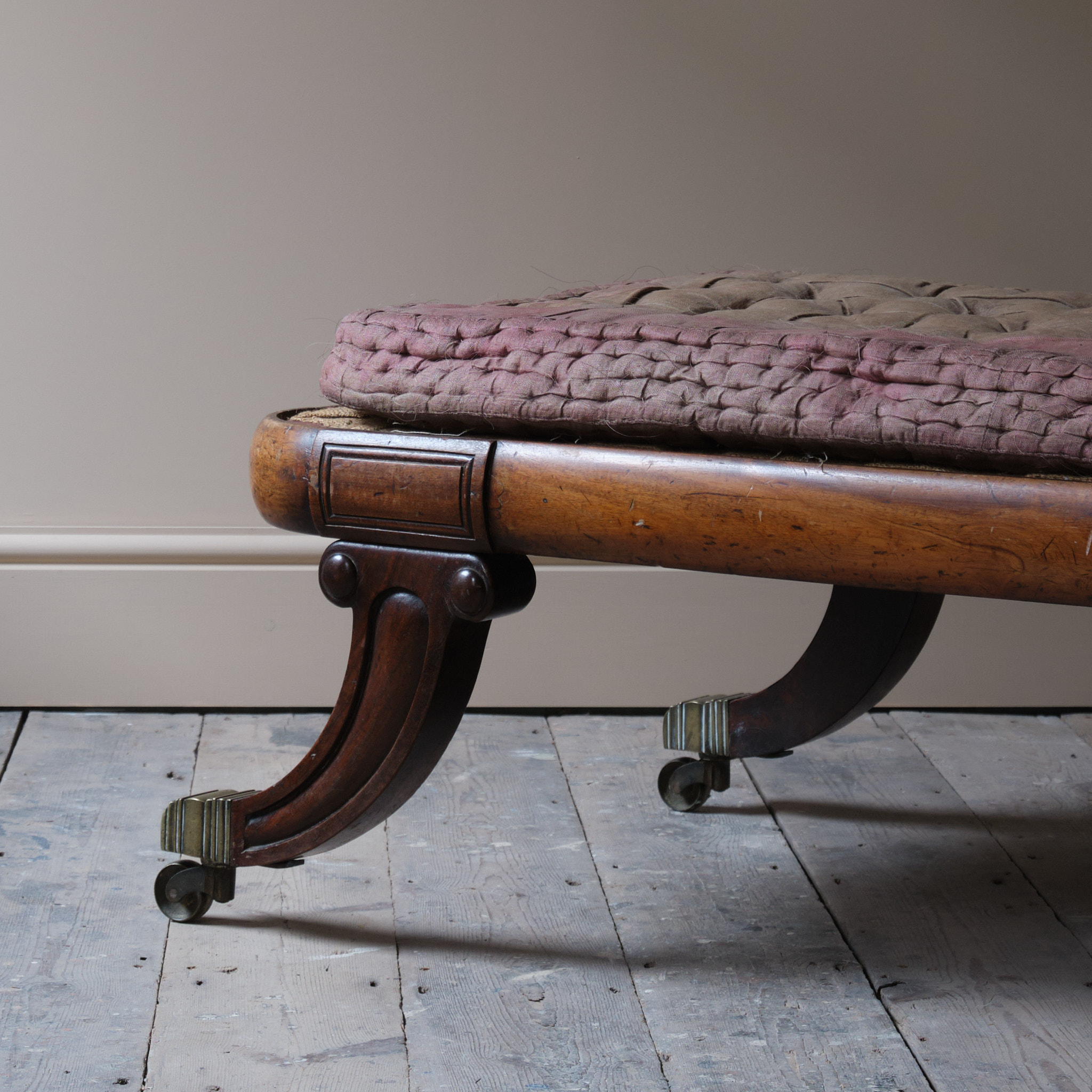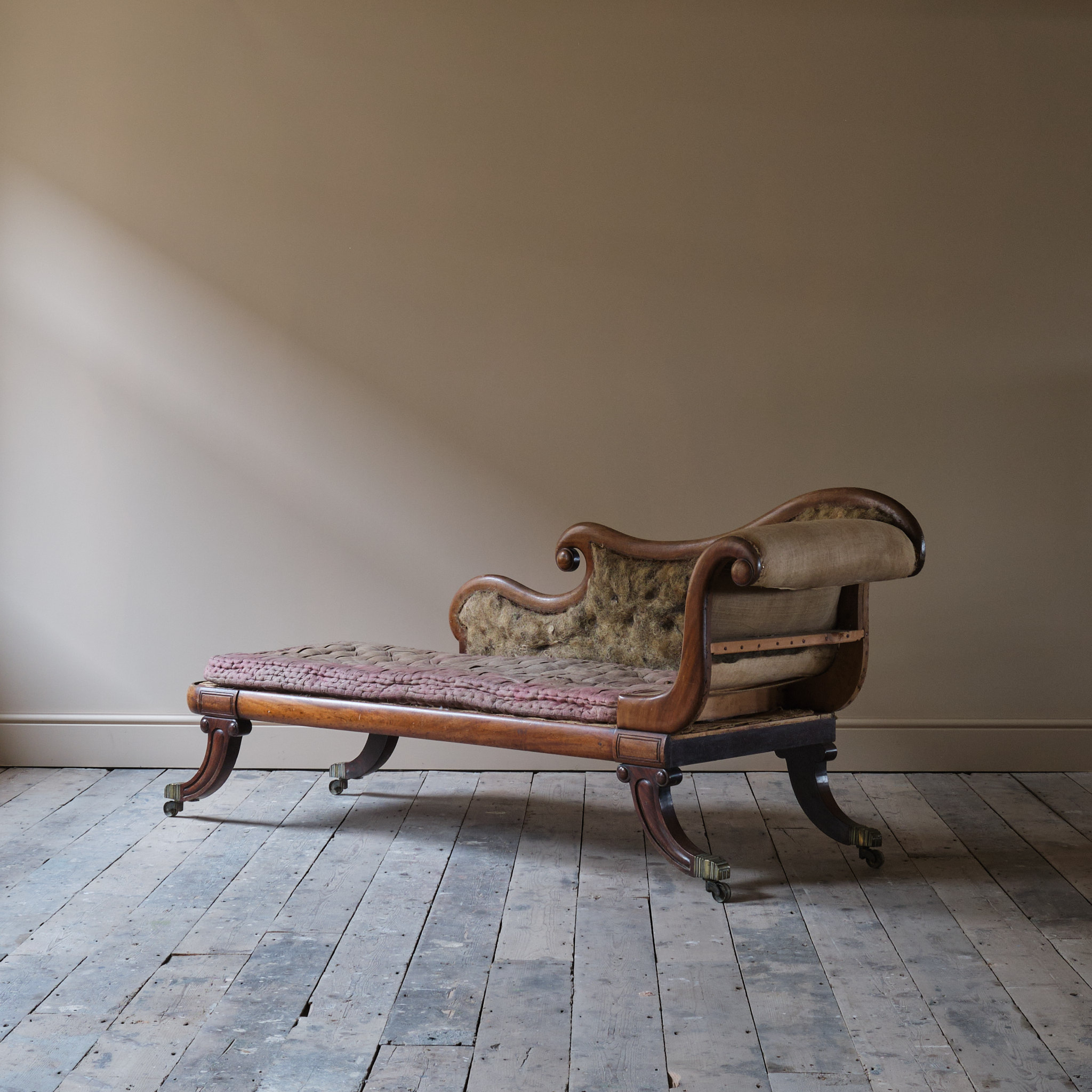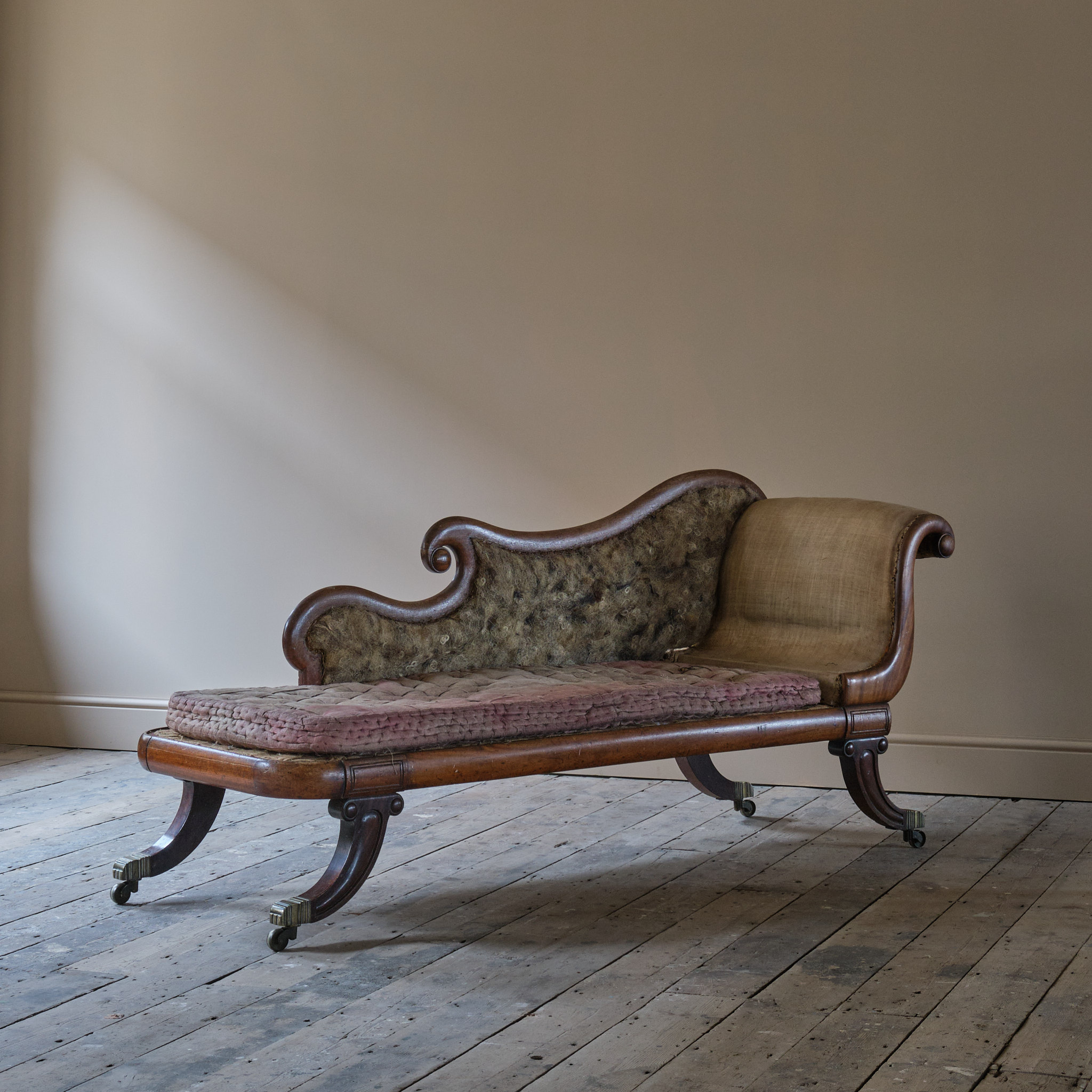 A good quality mid 19th century chaise longue. The shapely mahogany frame raised on 4 dramatic Sabre shaped legs all capped with the original brass casters. It retains the original horse hair filling and squab seat cushion. English c1840