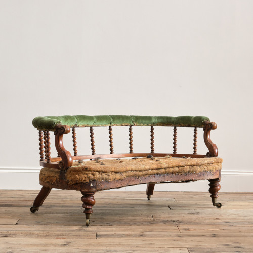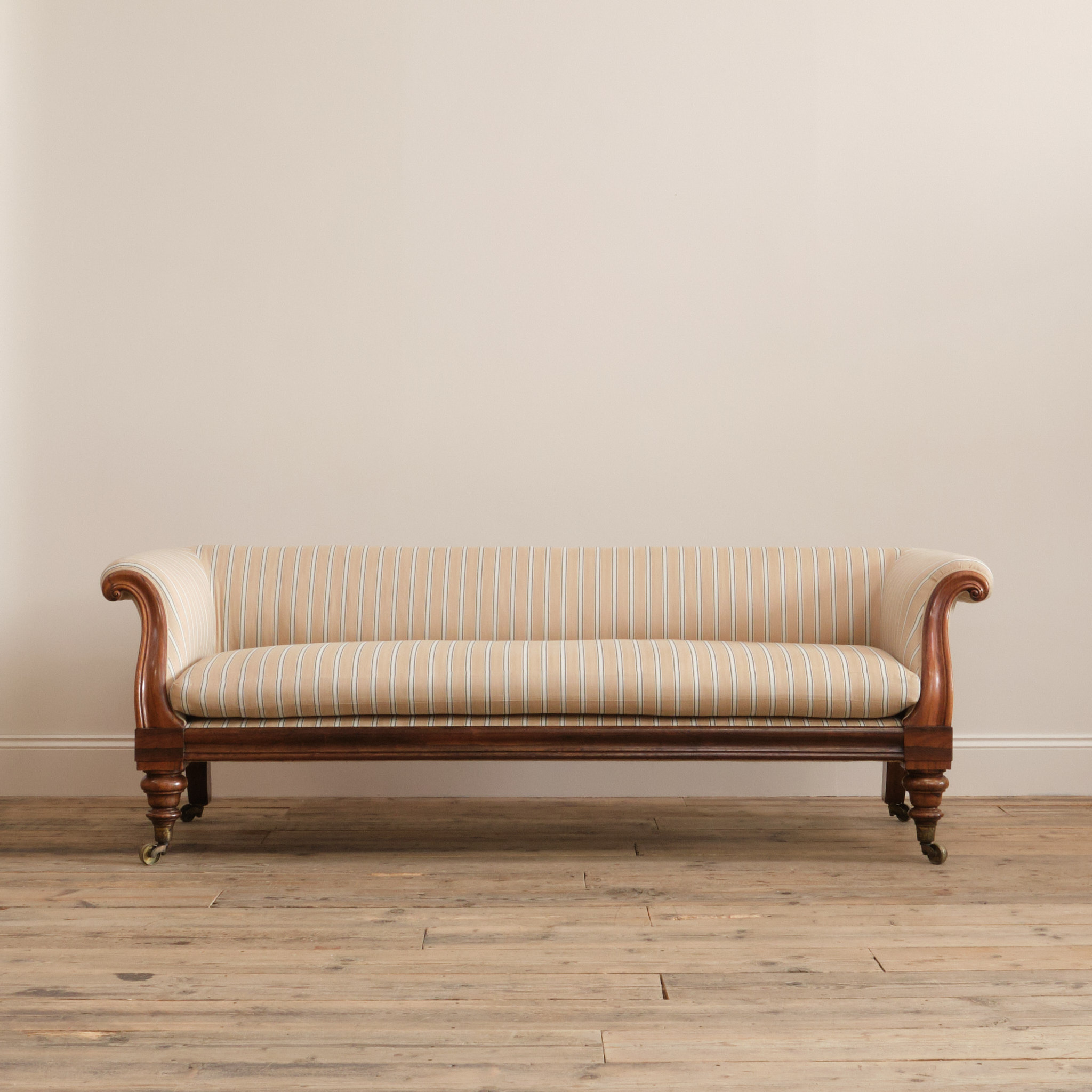 A superb quality low sleek, mid 19th century deep seated country house sofa. Raised on turned Rosewood legs with with the original copes casters. Retaining its original horsehair filled squab seat cushion C1840