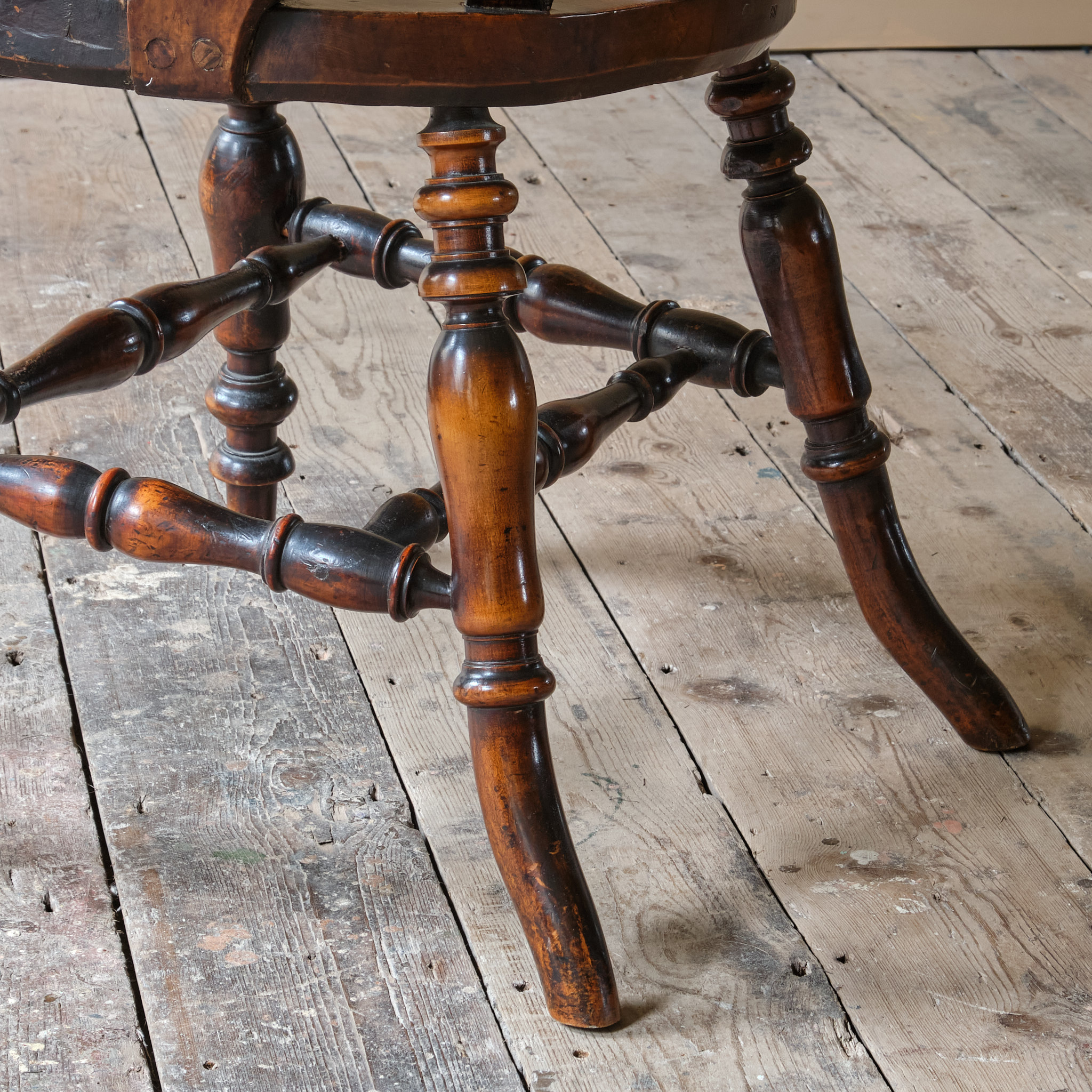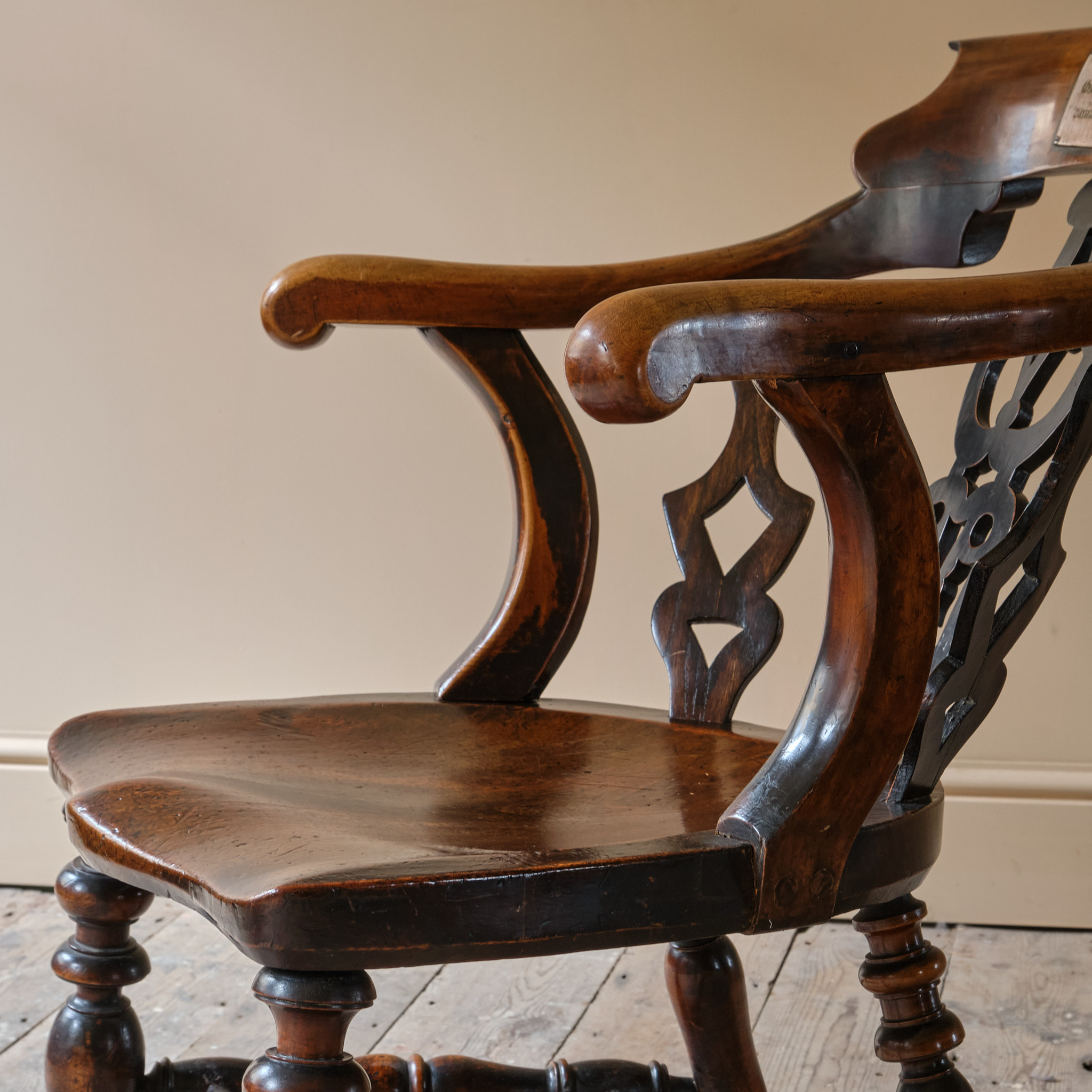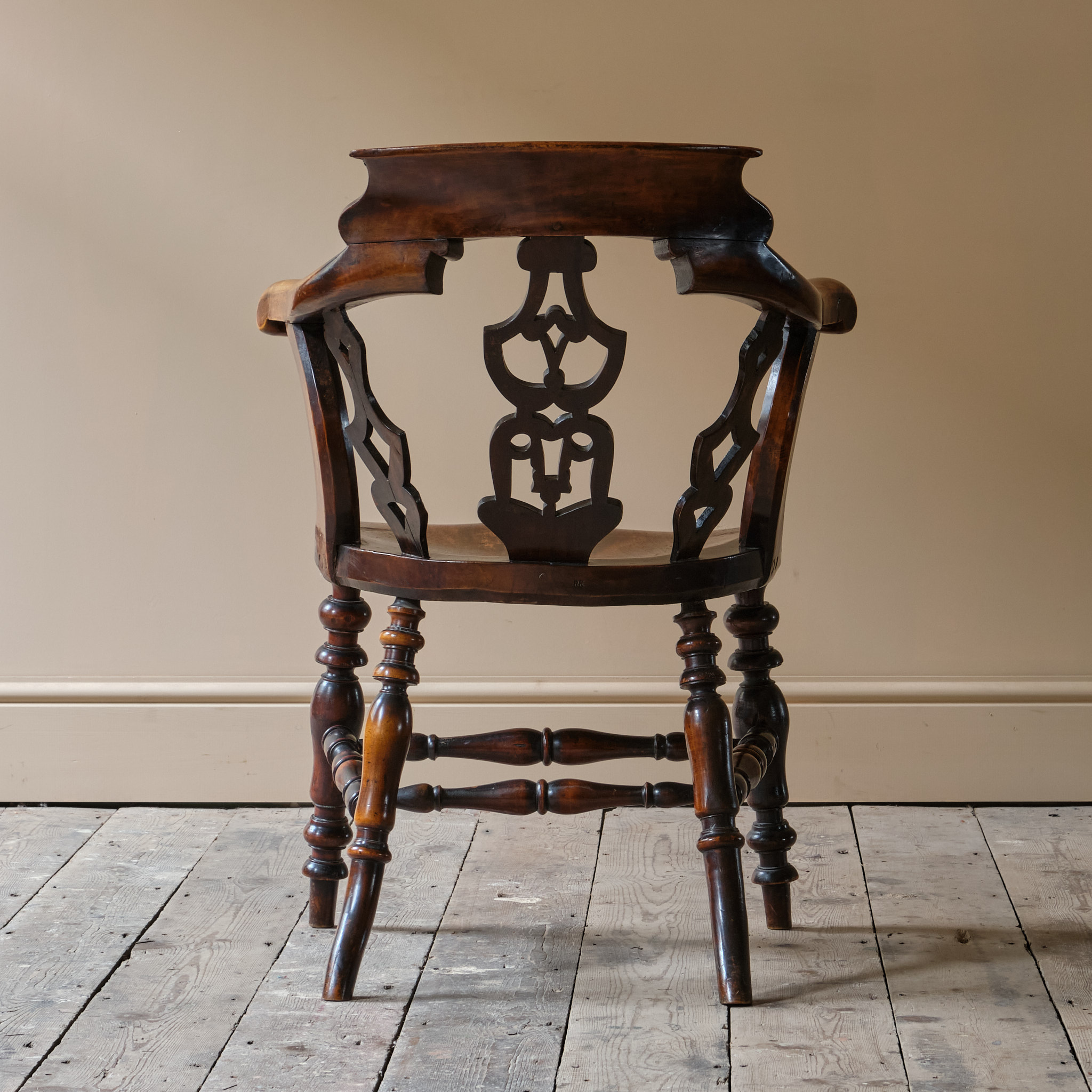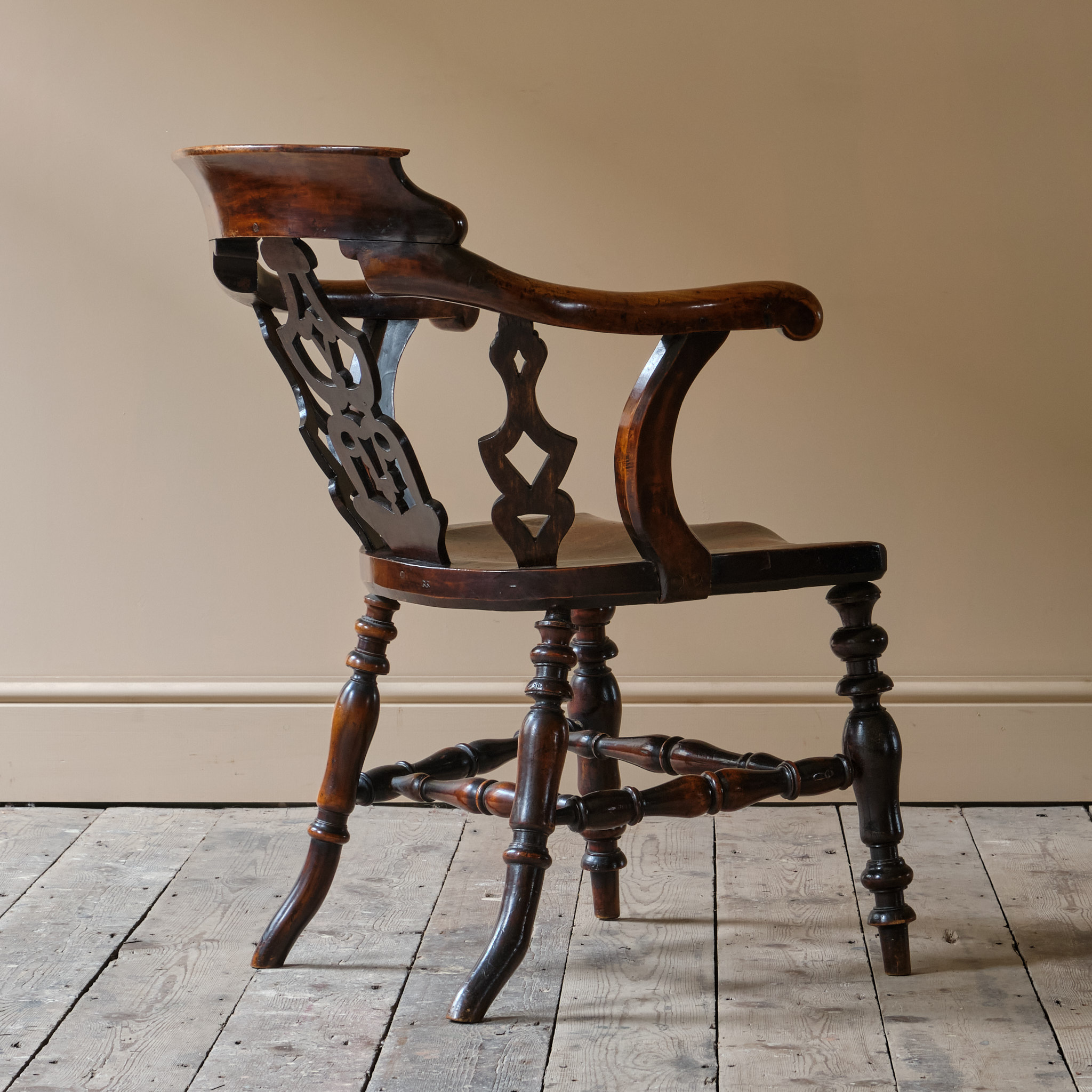 A rather unusual mid 19th century desk chair. Constructed in ash and elm with fruitwood arms. The chair came from a cutlers in Sheffield and appears to be have been given in remembrance of Richard Woolhouse 1778-1852. A table knife Cutler in Sheffield England.