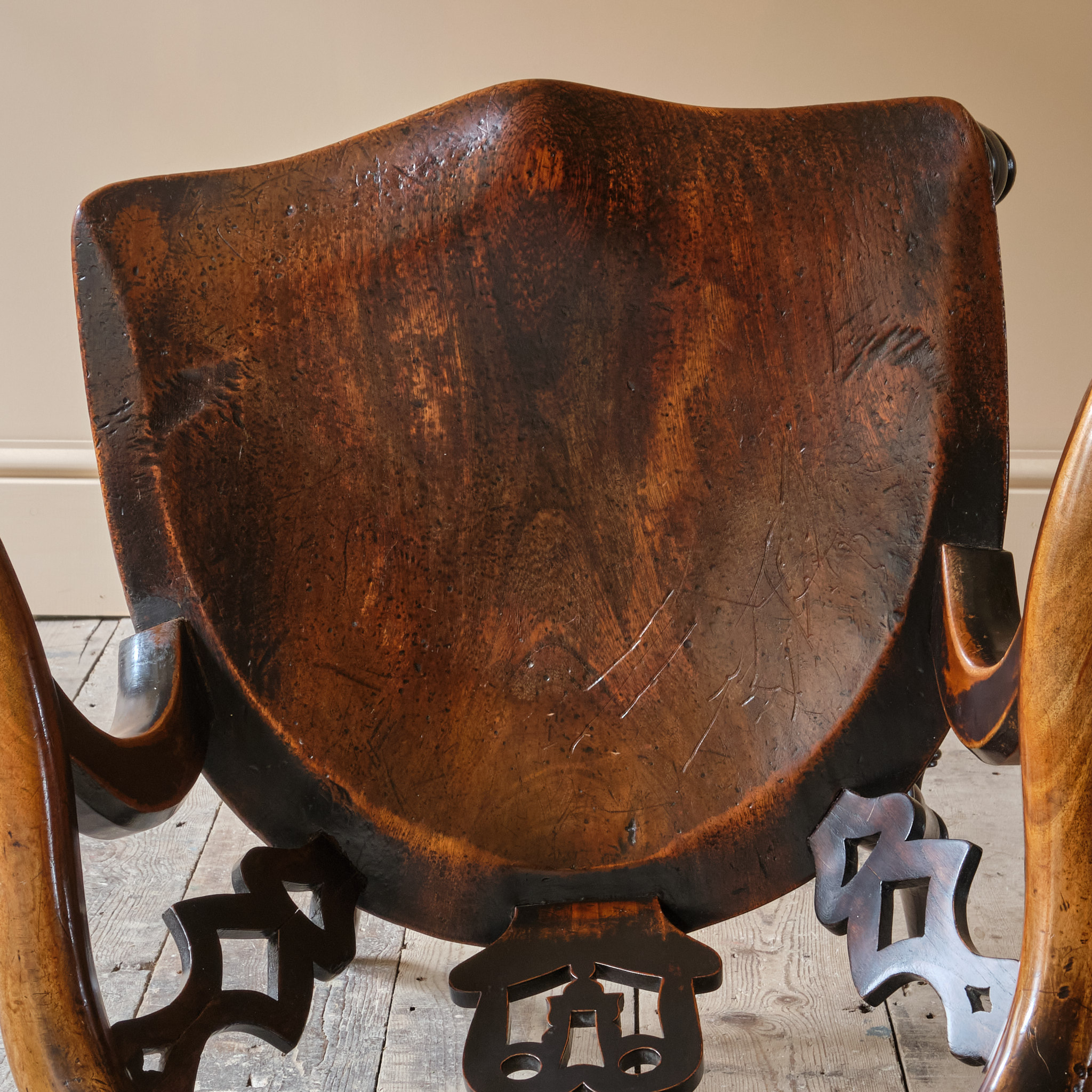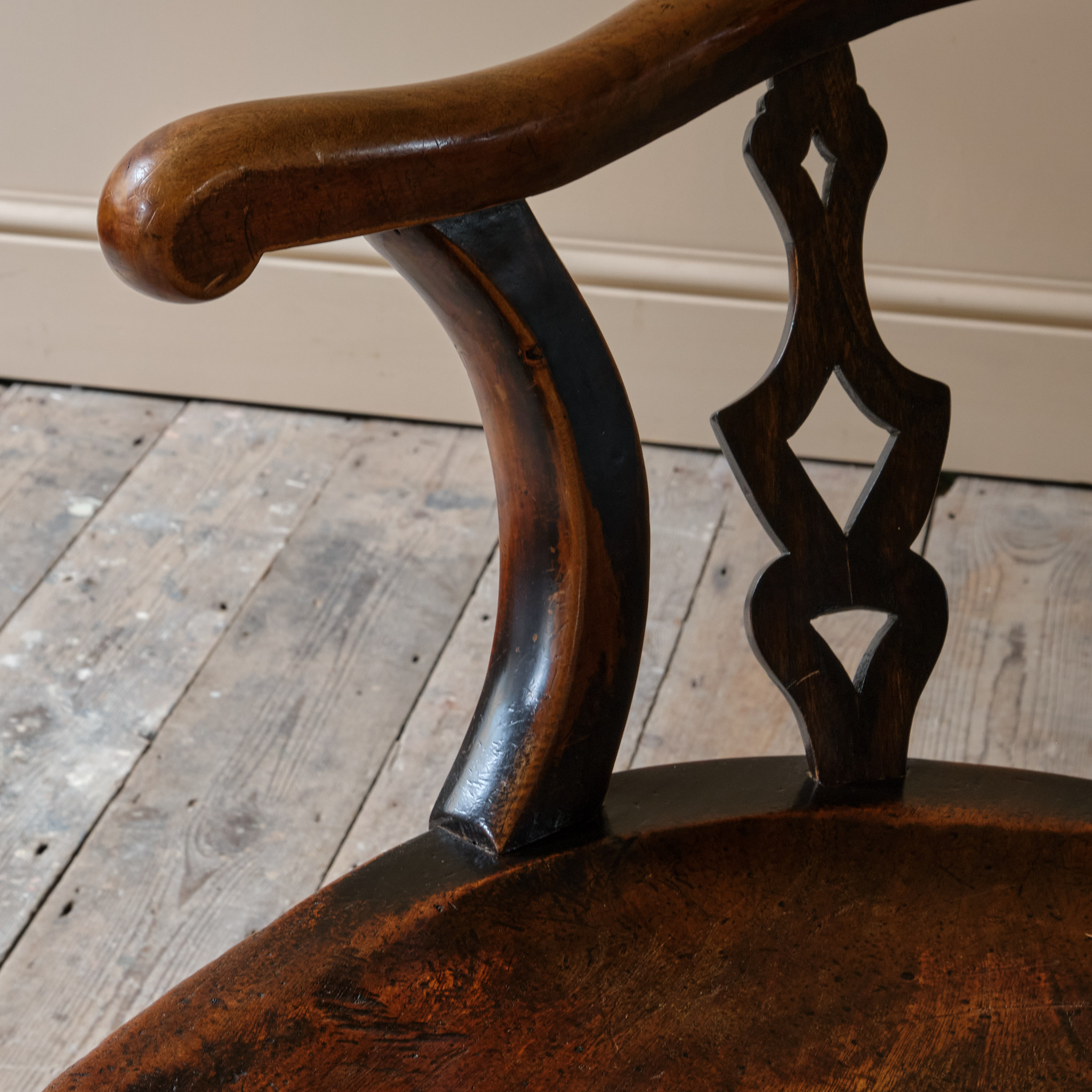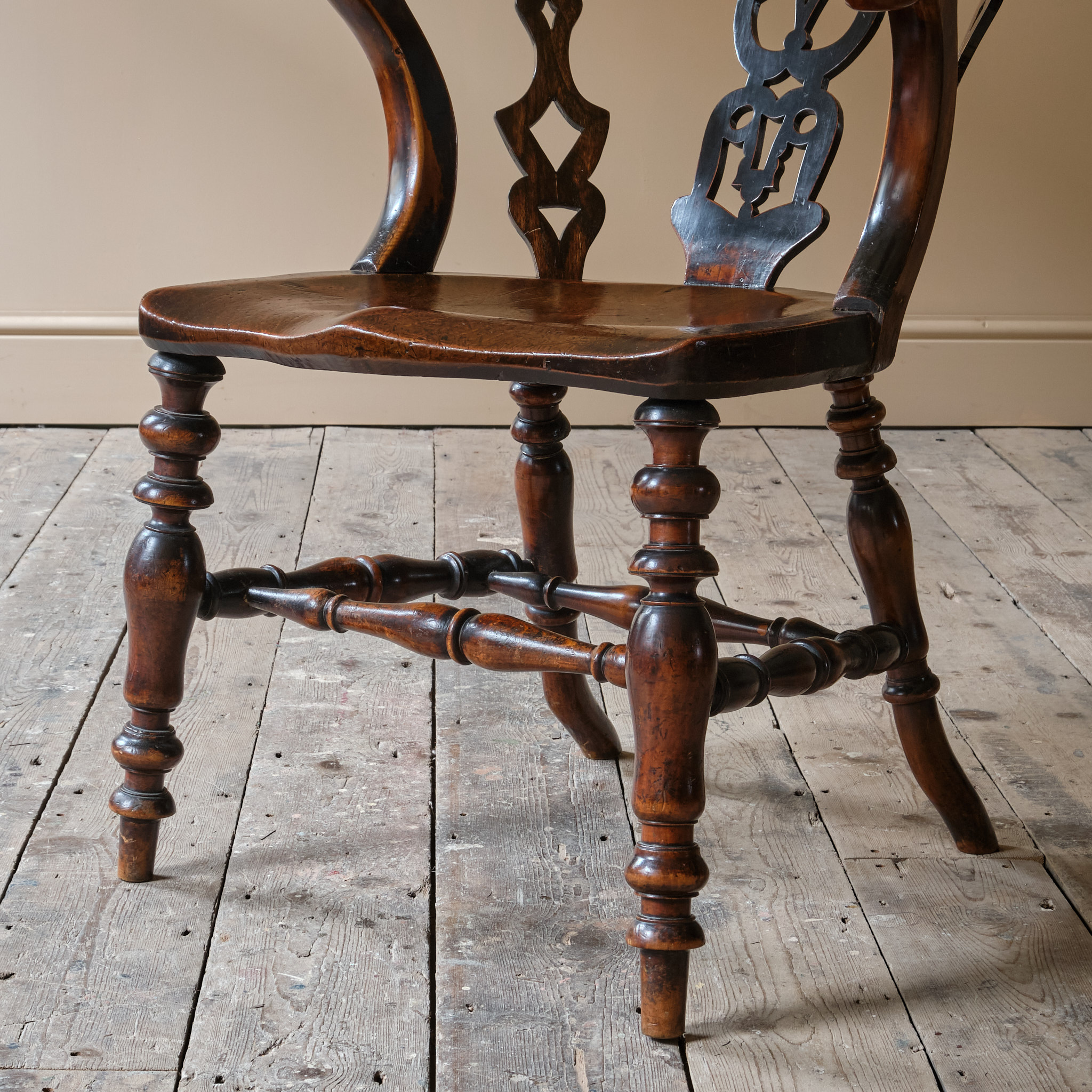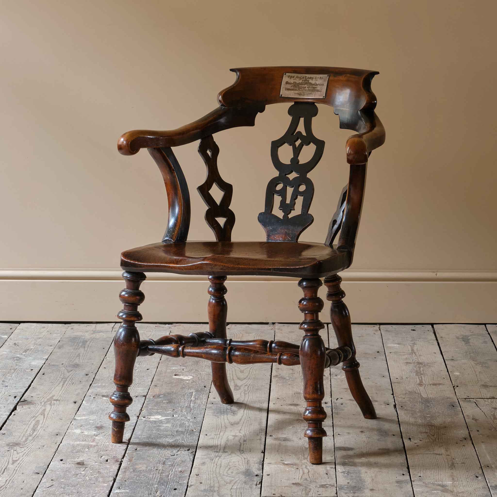 The chair is raised on turned legs joined by stretchers and with a nicely formed elm slab seat. The back with pierced splats joined by a shaped back rest and arms. The backrest with the steel remembrance Plaque.
