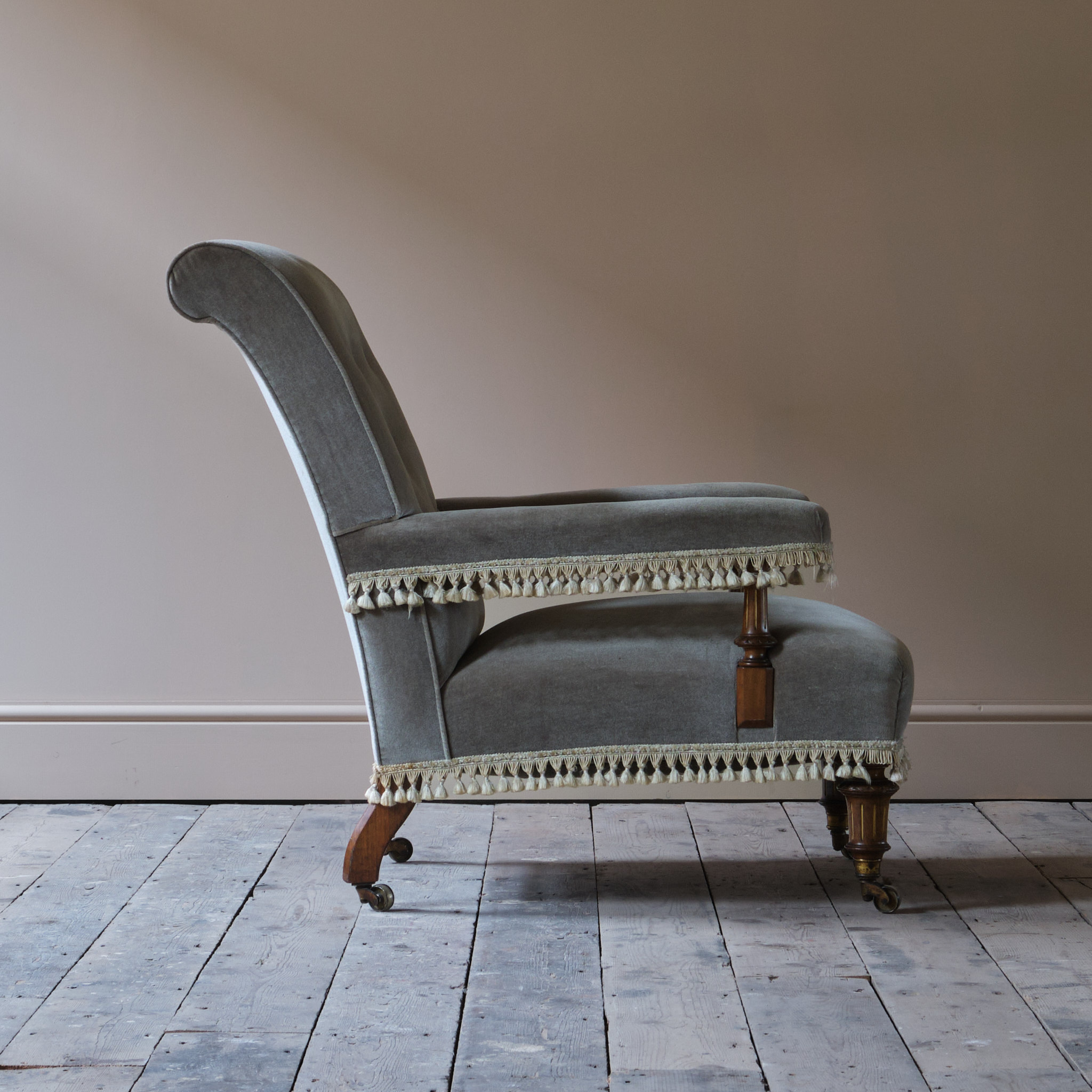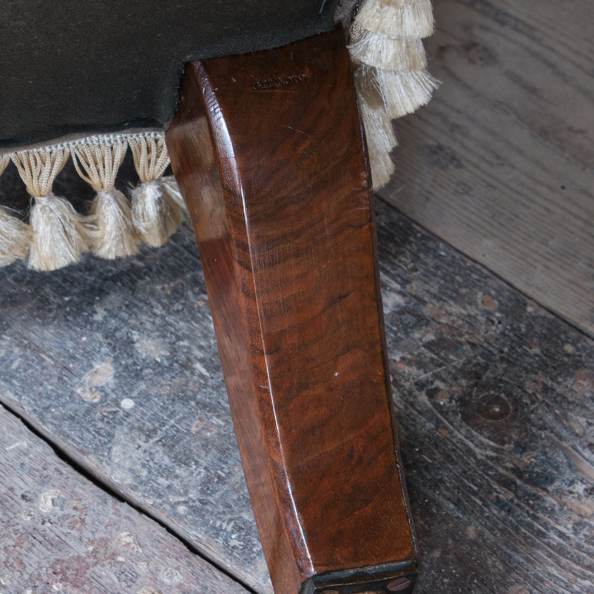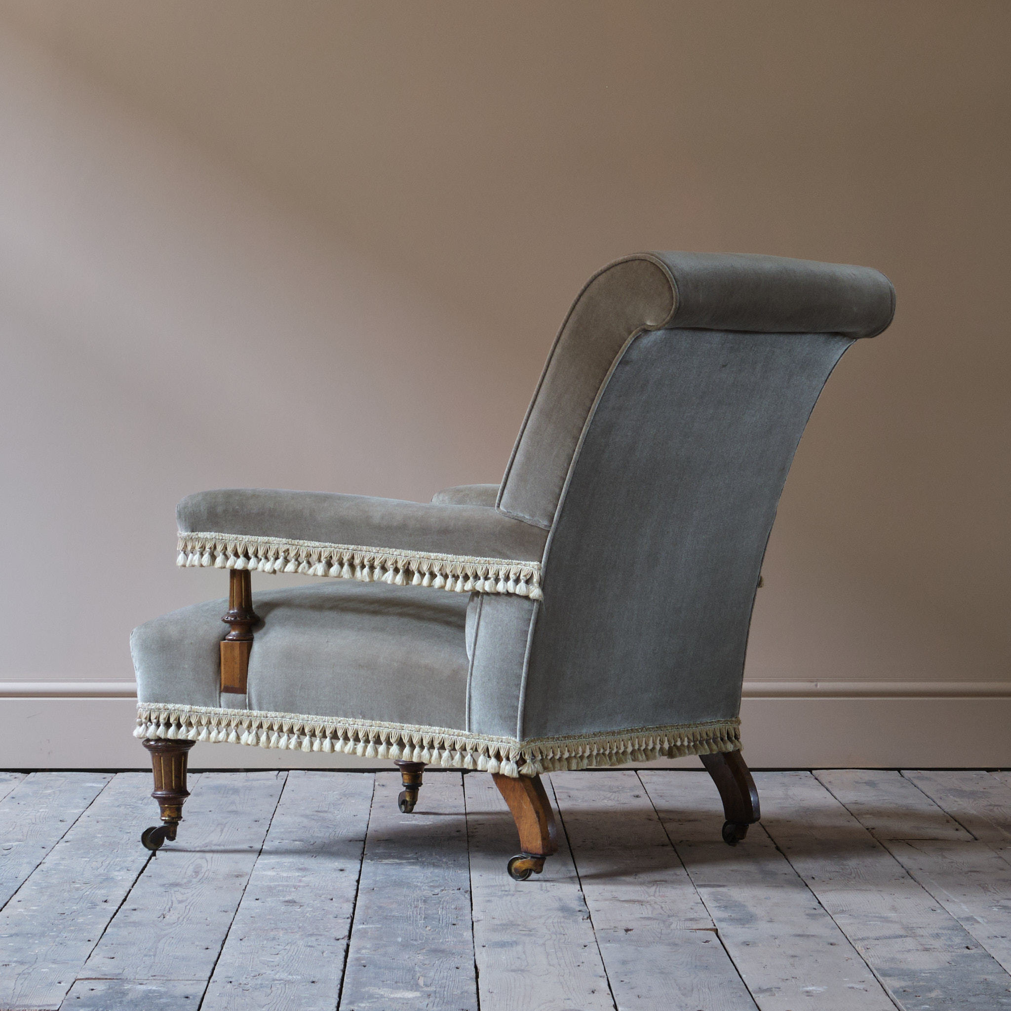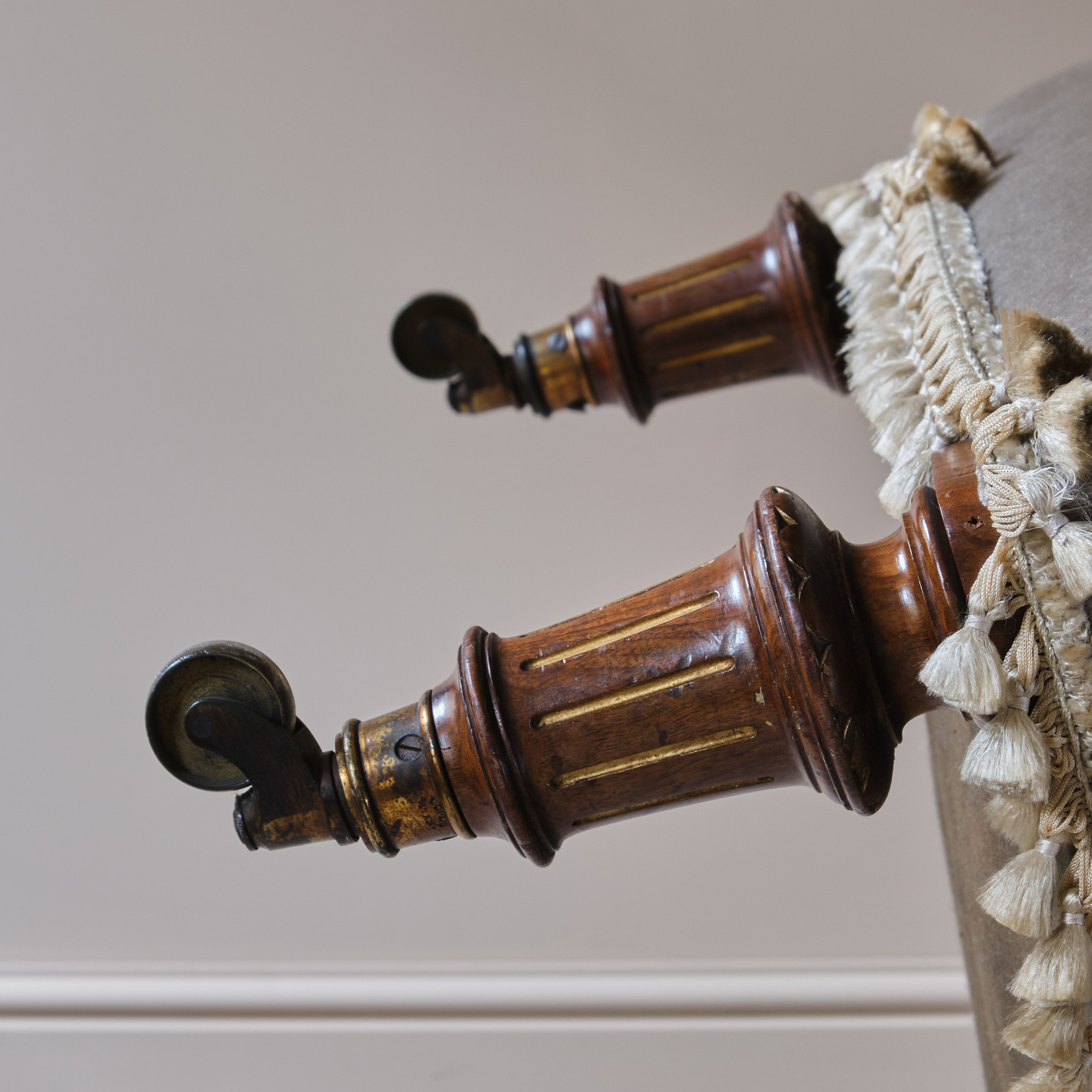 A well drawn mid 19th century armchair by Gillows of Lancaster of large country house proportions. Raised on finely worked walnut legs and arm supports with parcel gilt detailing. All legs retaining the original casters and both back legs bearing the Gillows maker mark. English c1860