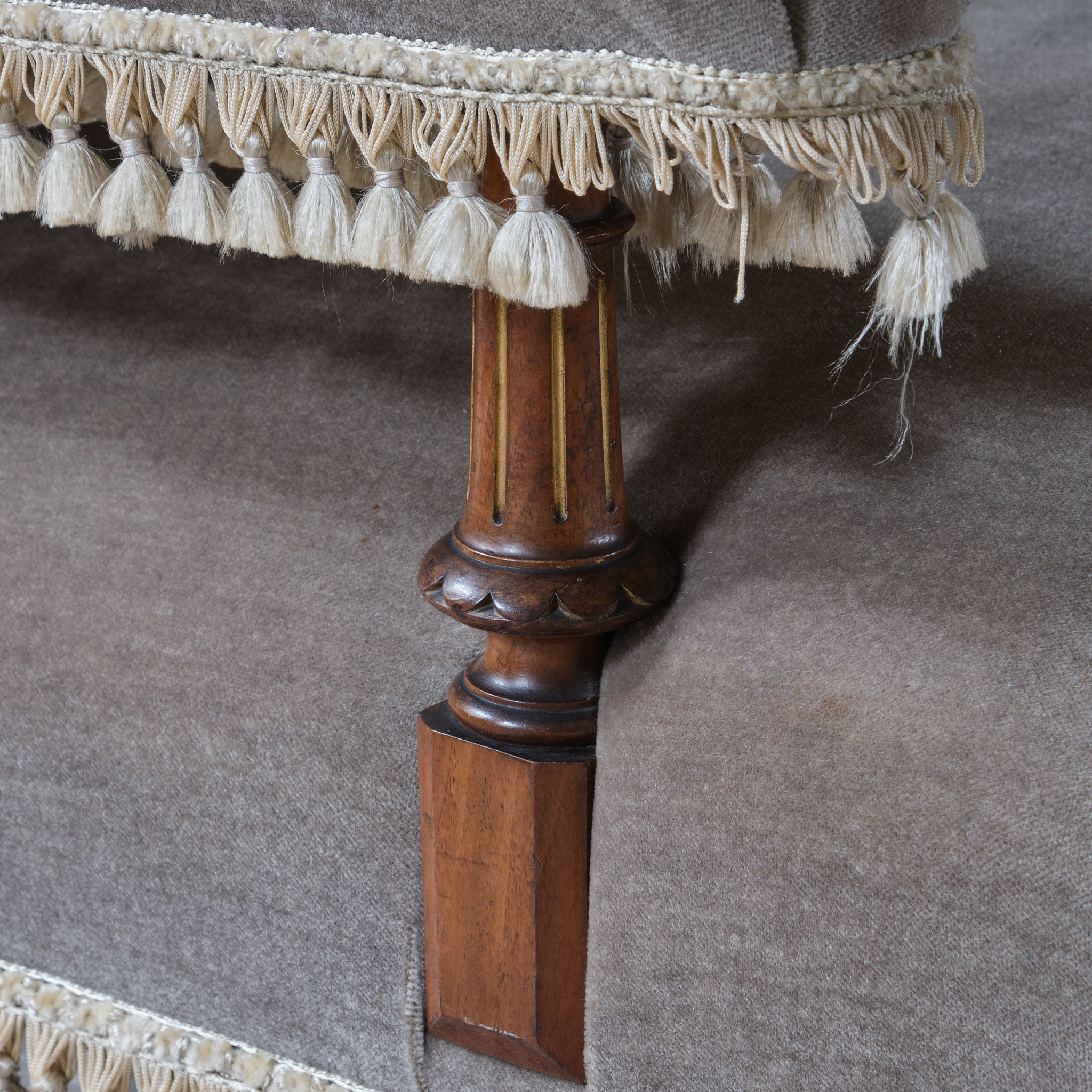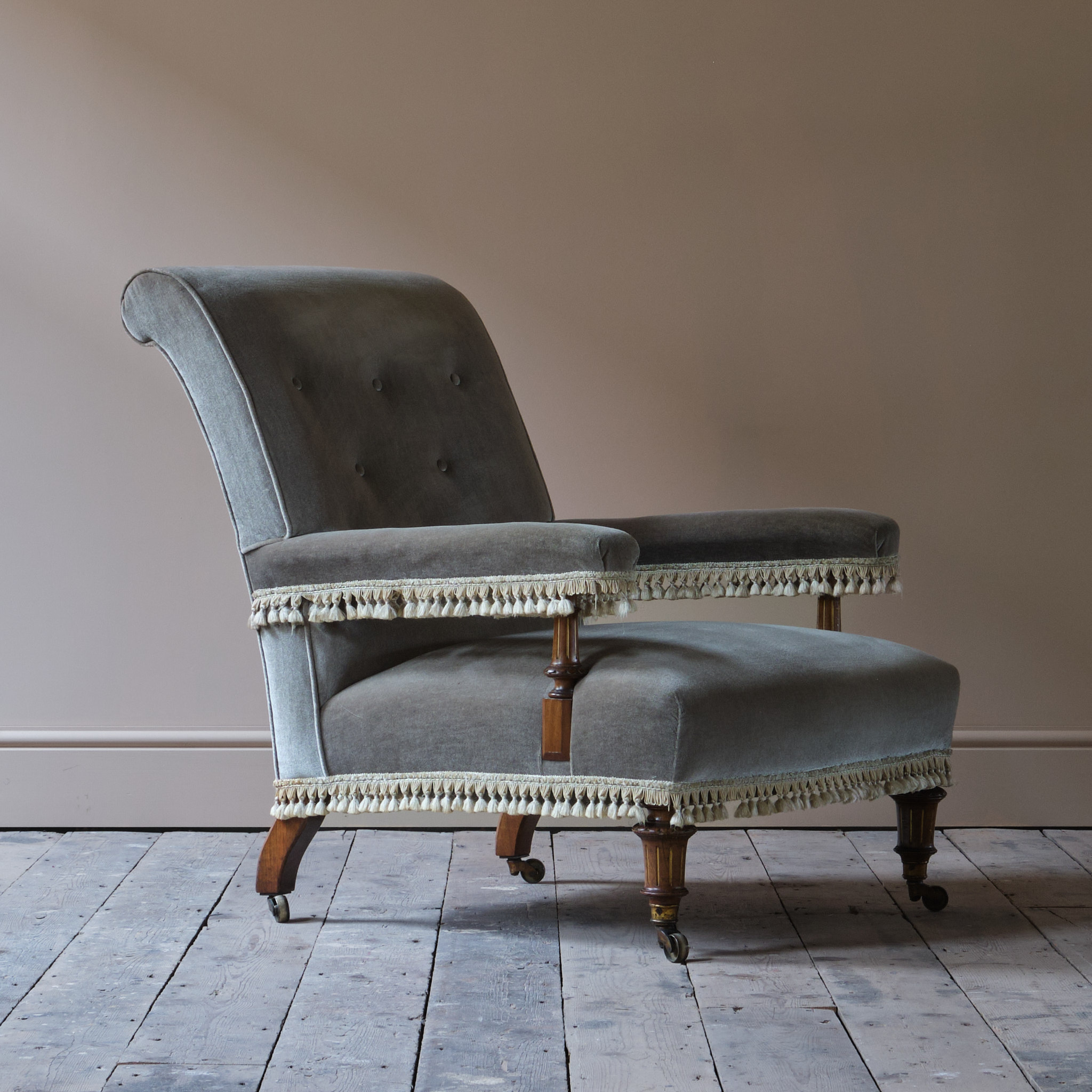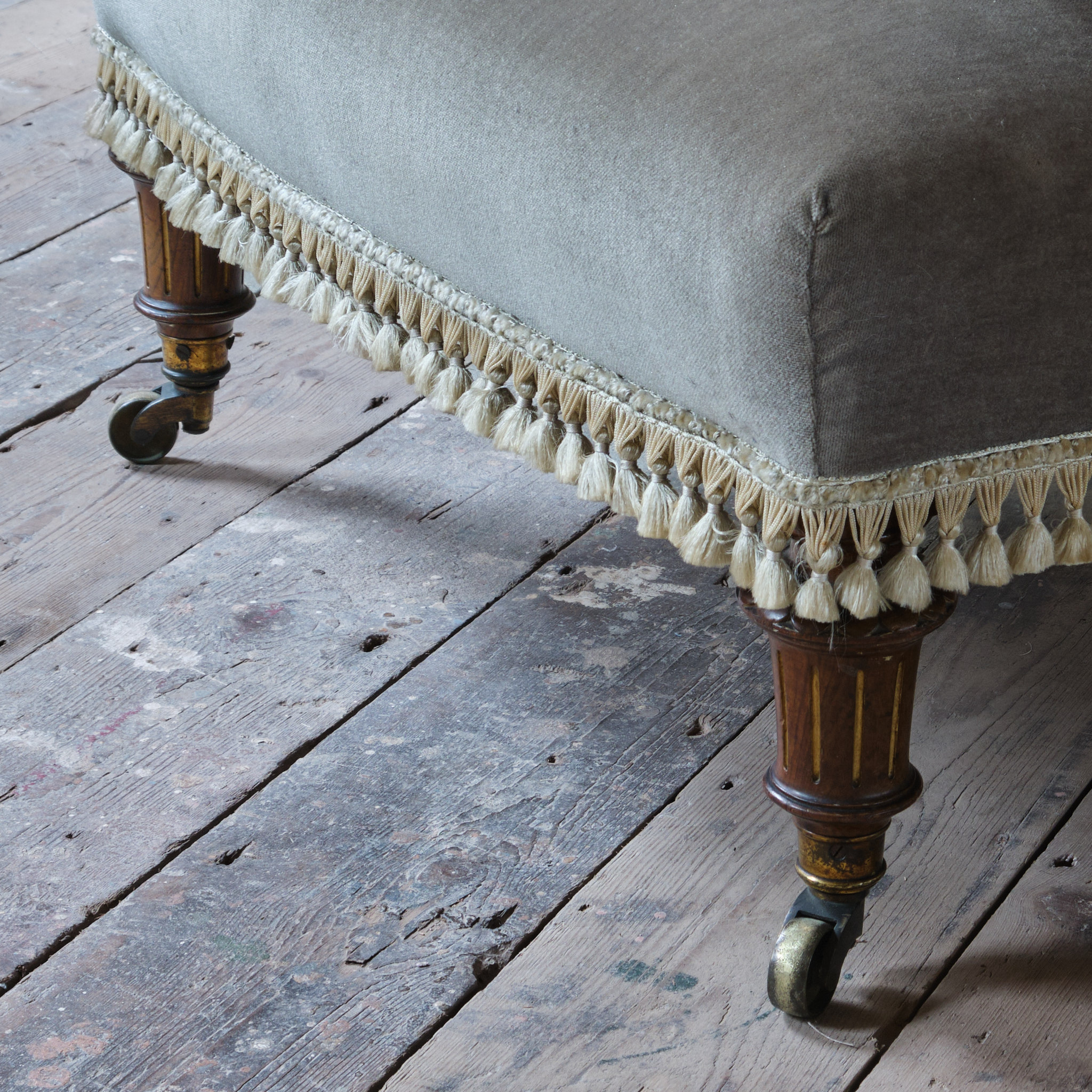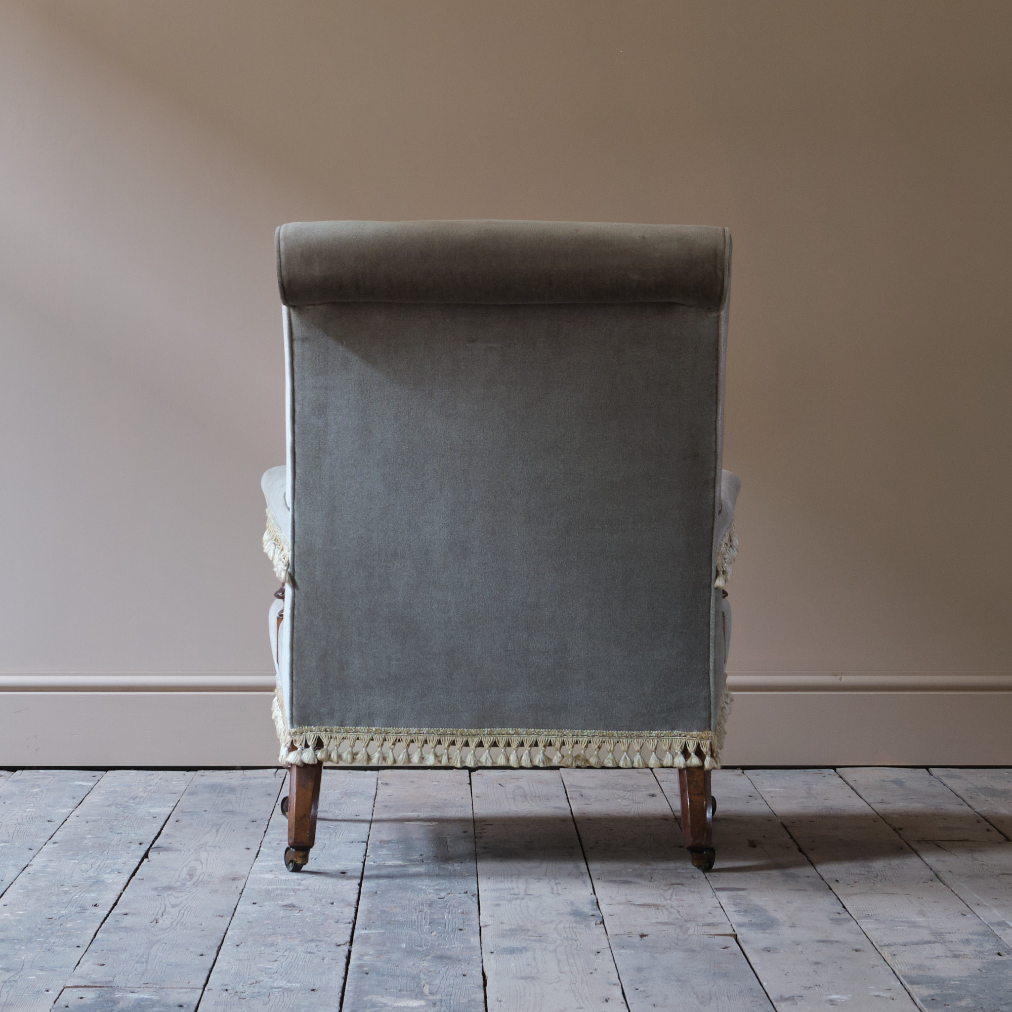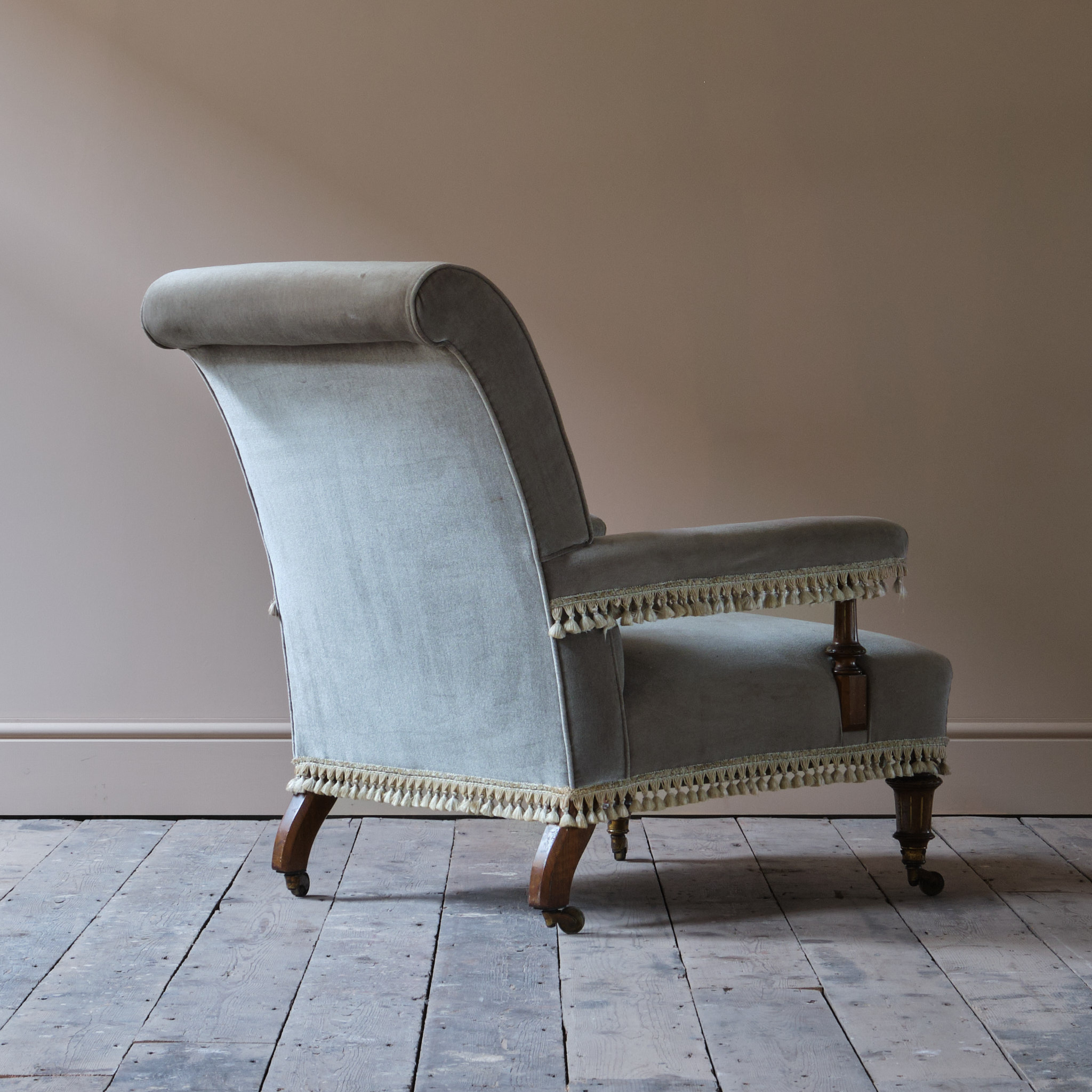 A well drawn mid 19th century armchair by Gillows of Lancaster of large country house proportions. Raised on finely worked walnut legs and arm supports with parcel gilt detailing. All legs retaining the original casters and both back legs bearing the Gillows maker mark. English c1860