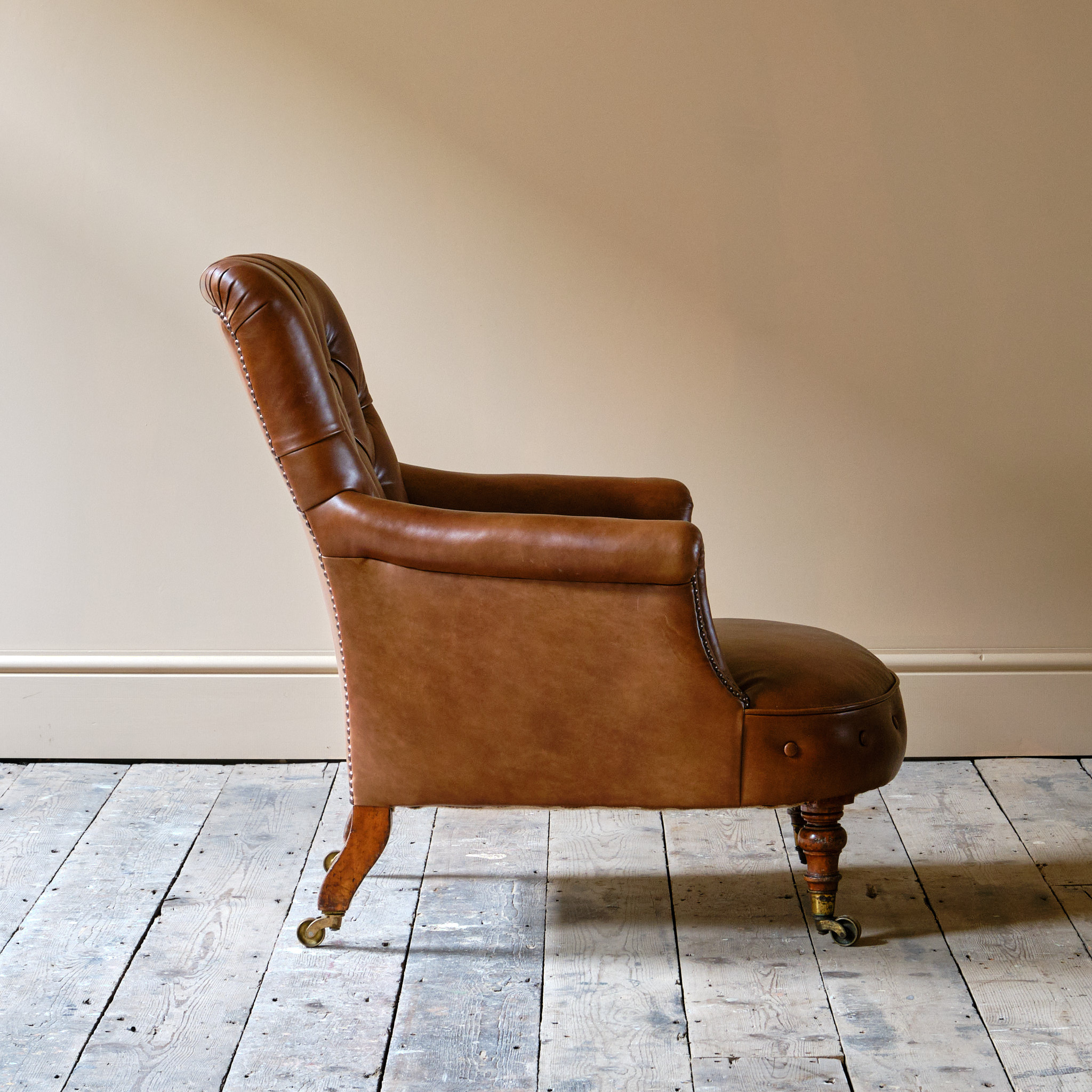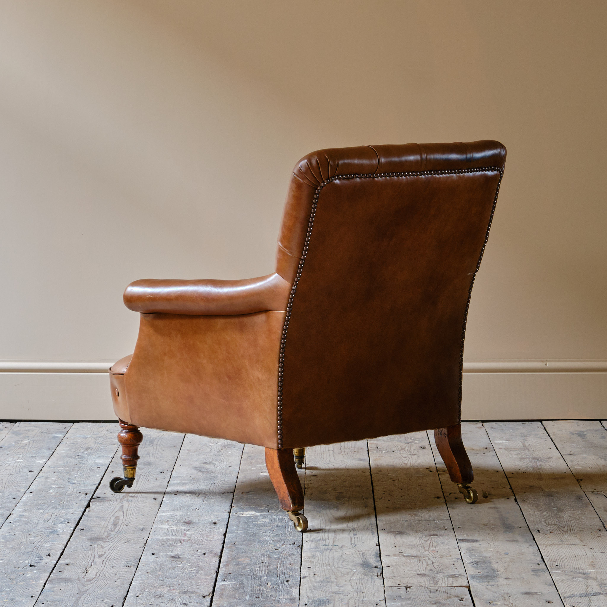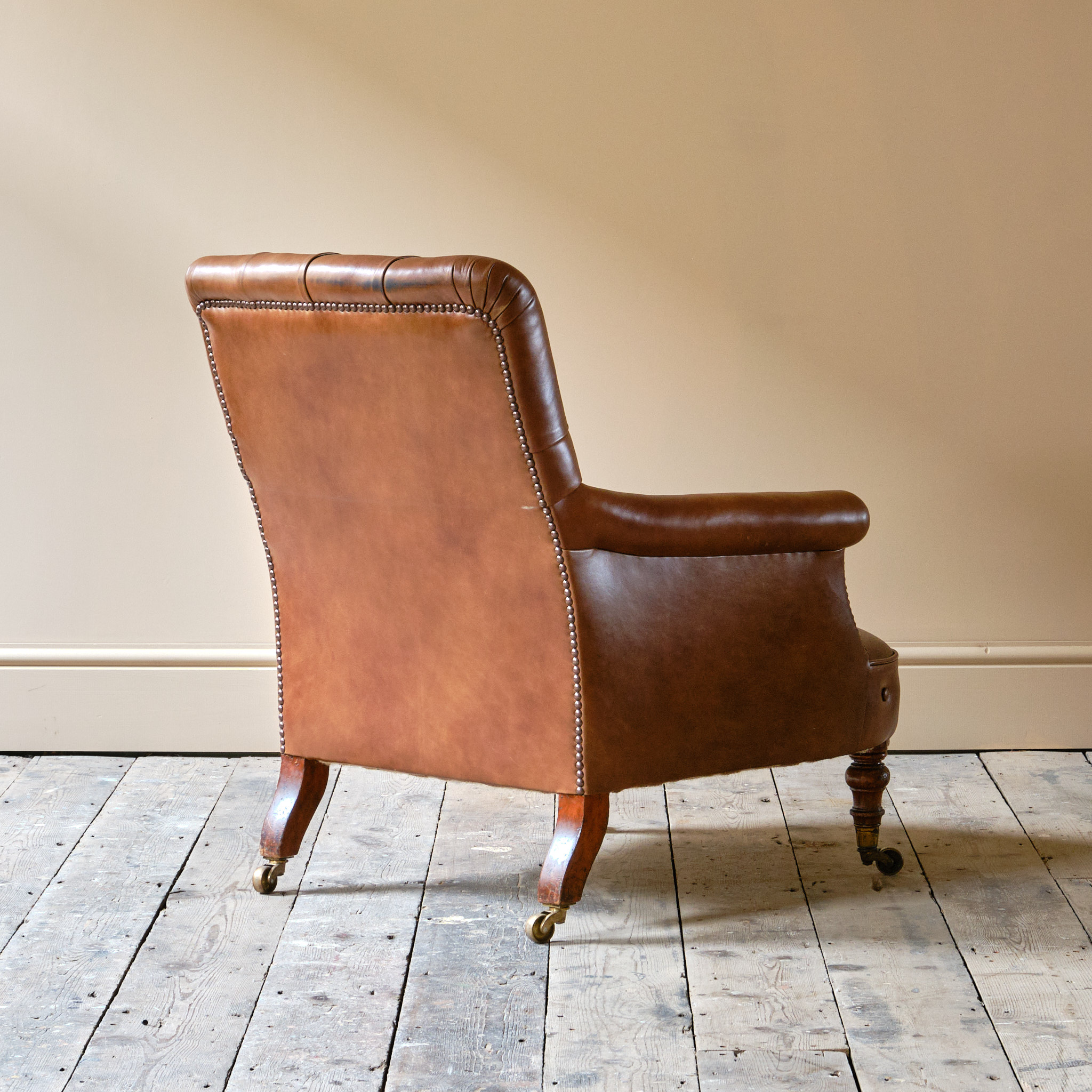 A mid 19th century country house armchair by Howard & Sons - London, England c1850. Raised on turned walnut front legs and splayed rear legs with the left back leg bearing the serial stock number.