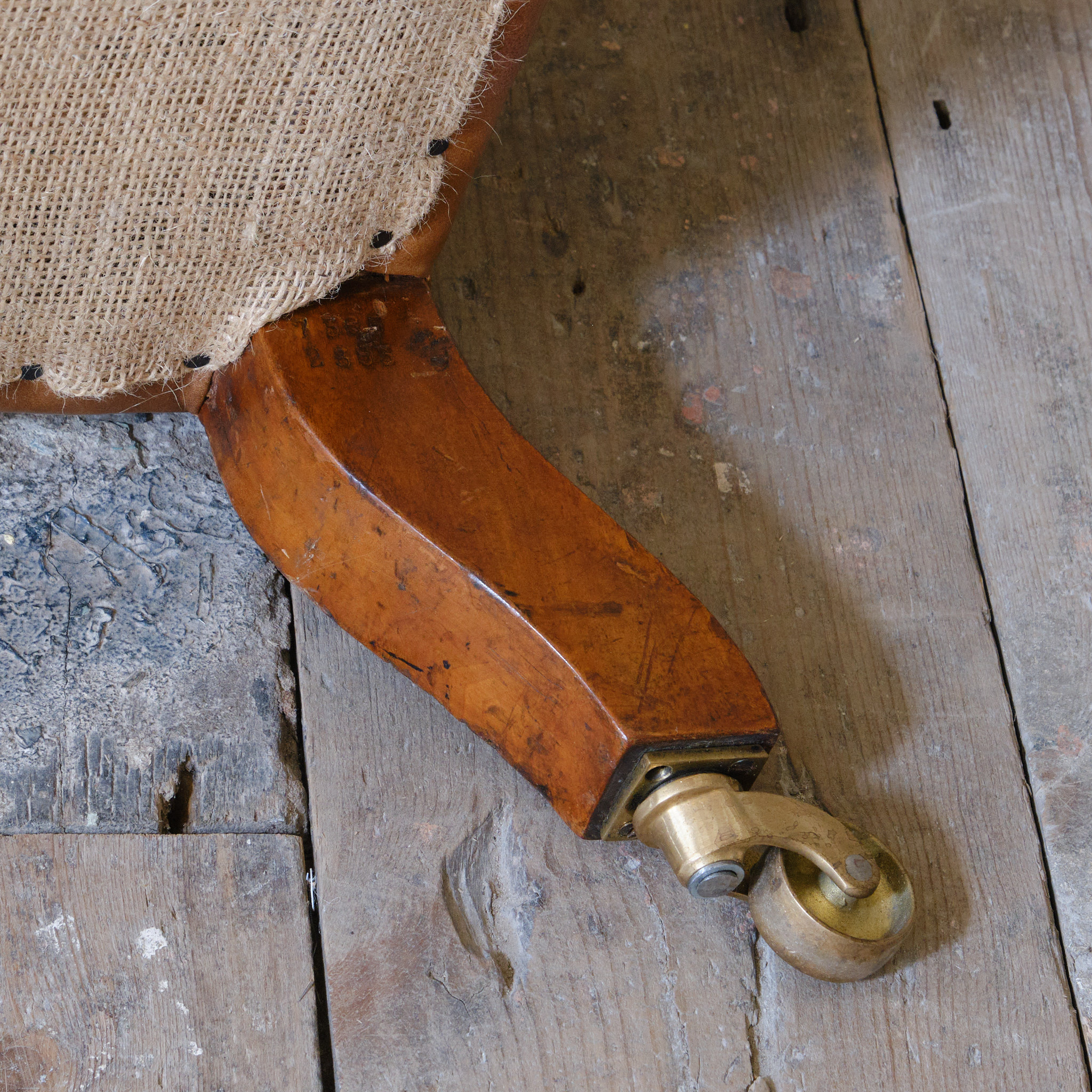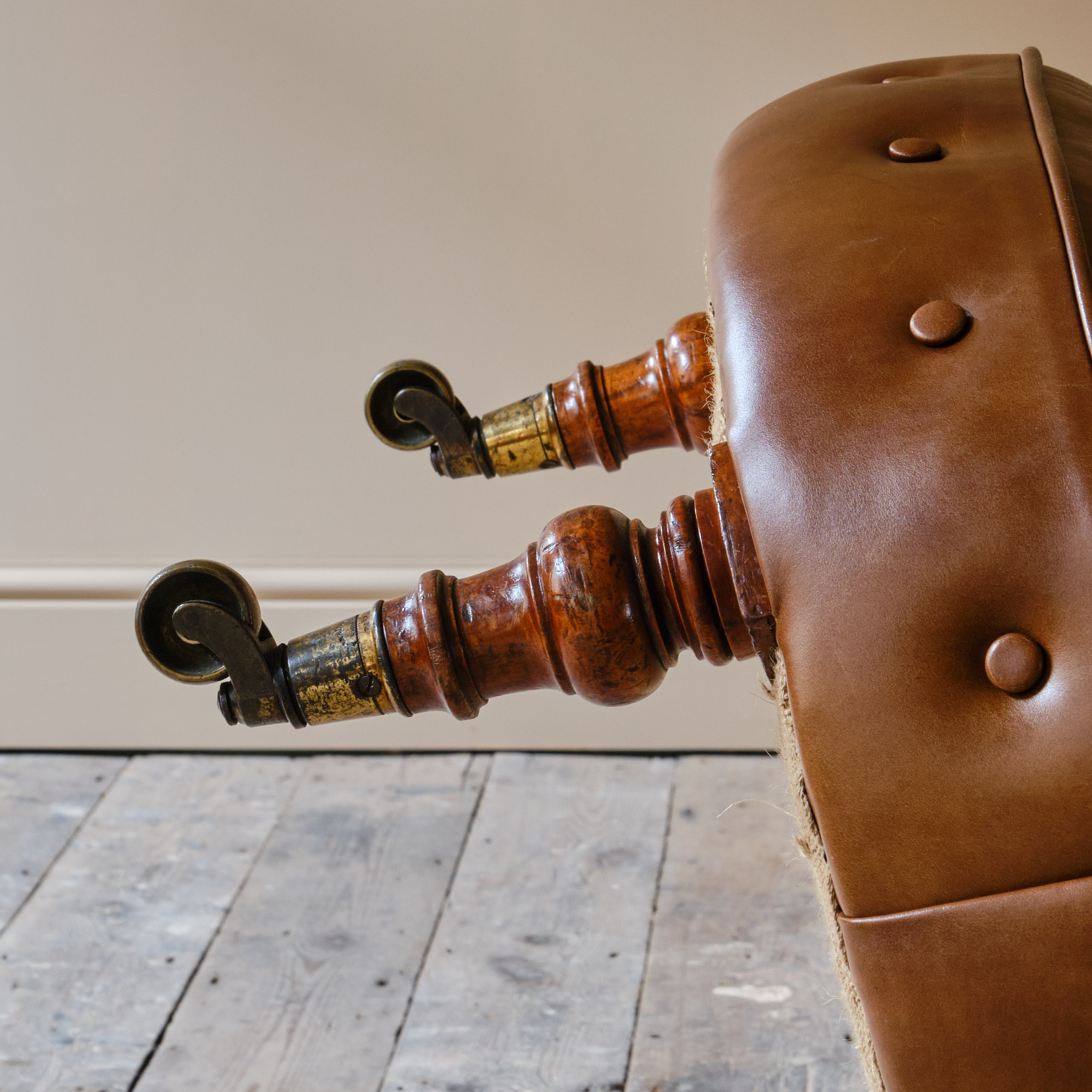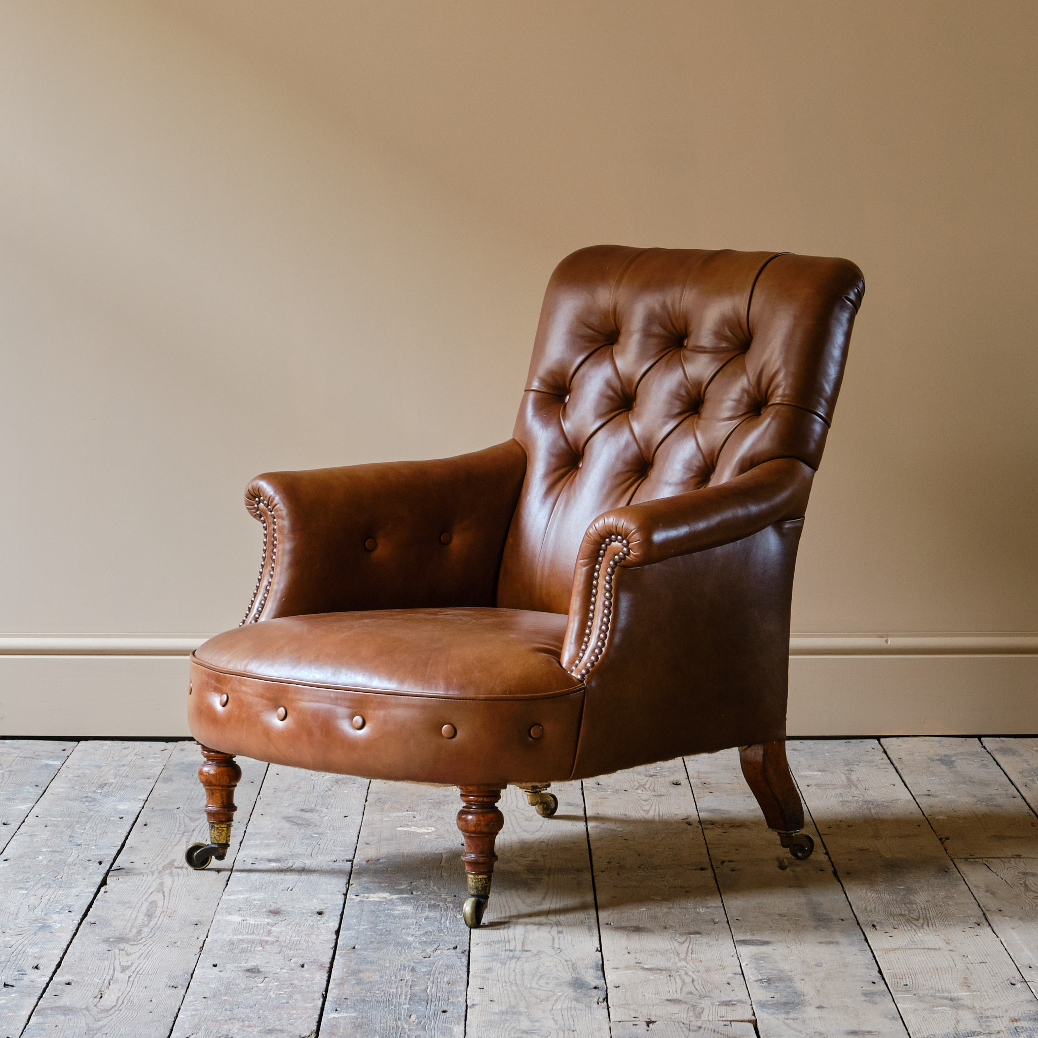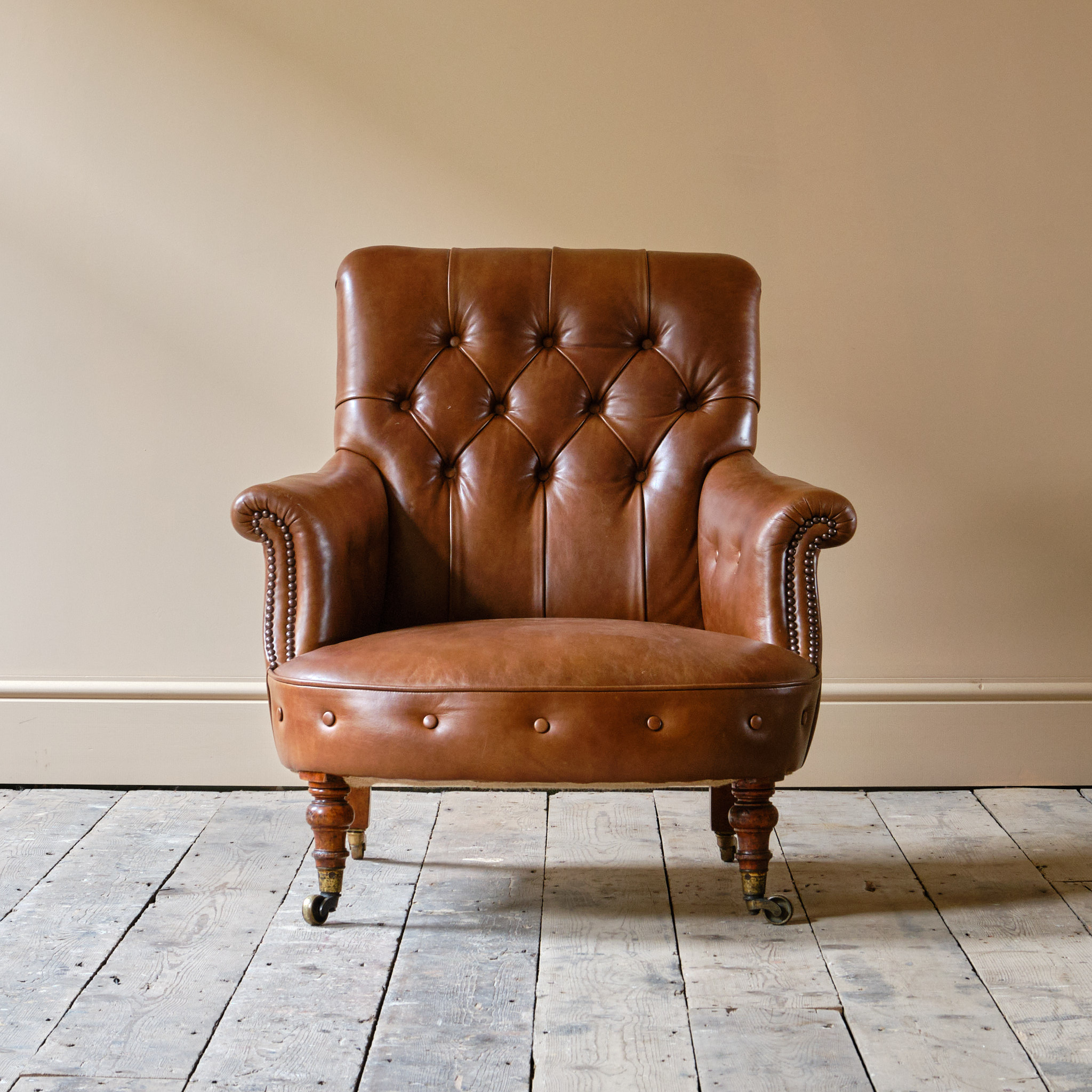 A mid 19th century country house armchair by Howard & Sons - London, England c1850. Raised on turned walnut front legs and splayed rear legs with the left back leg bearing the serial stock number.