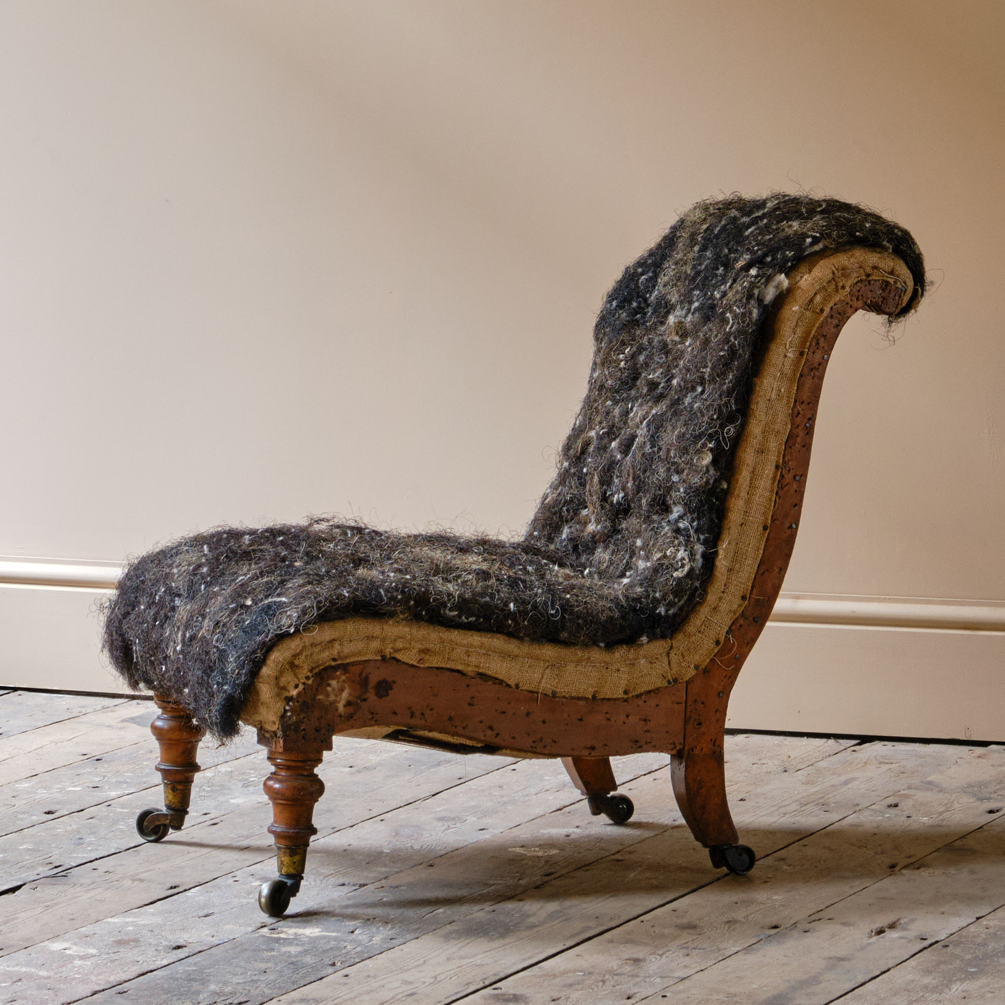 A mid 19th century shapely country house slipper chair by Howard and sons - London c1850. Raised on walnut legs and the original Cope & Collinson brass casters.