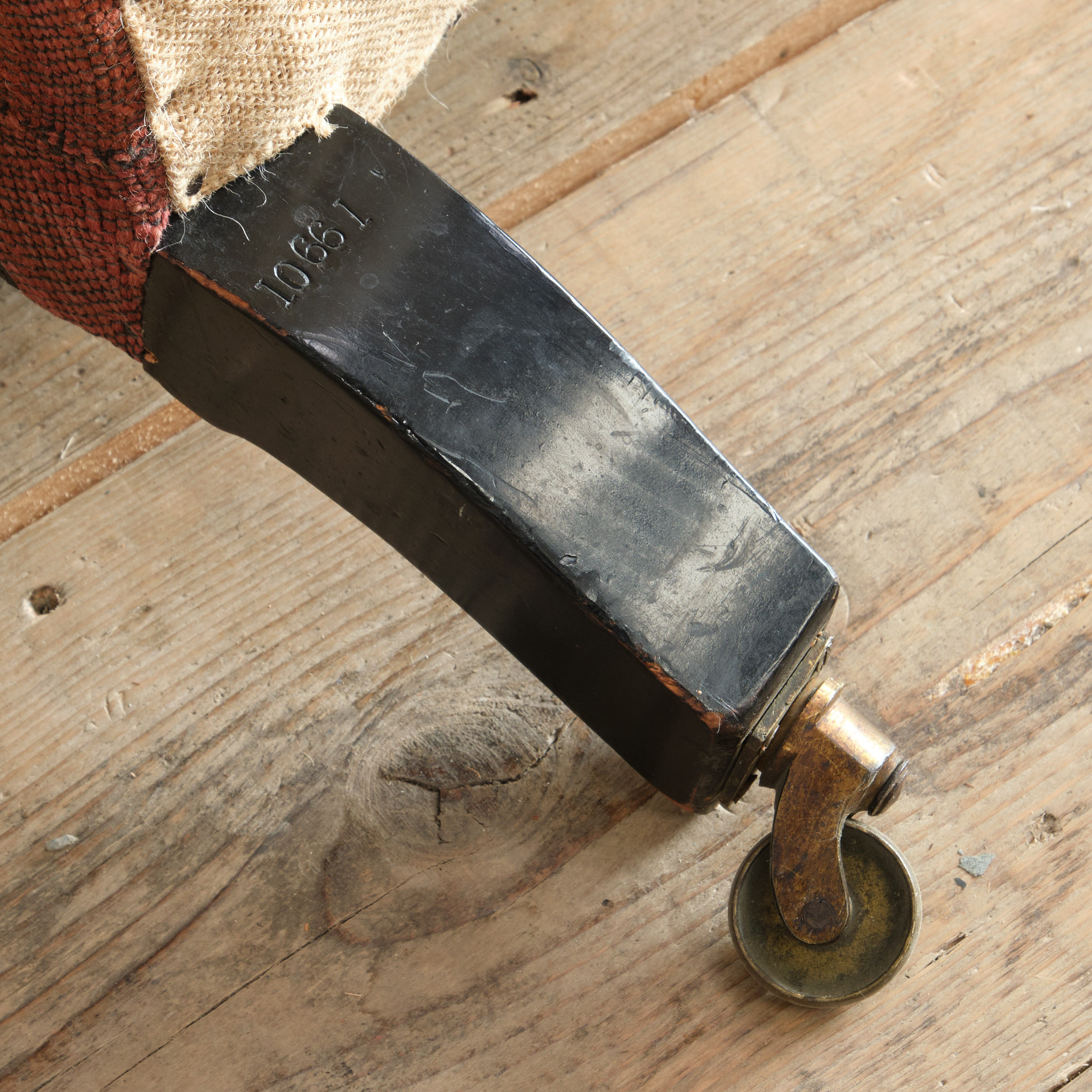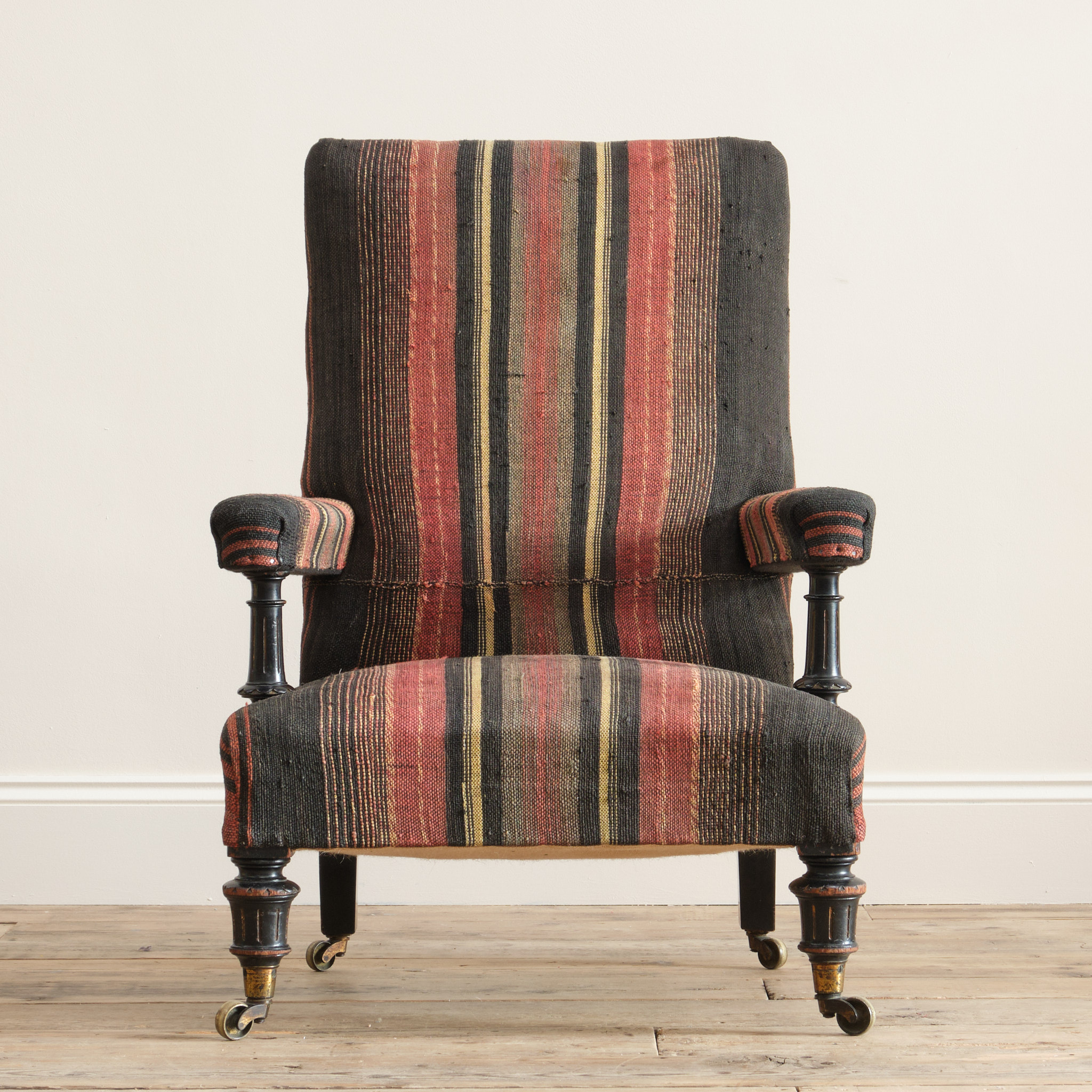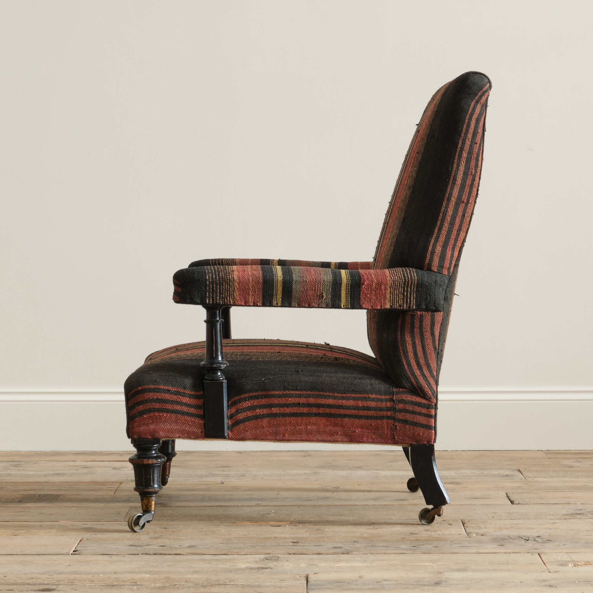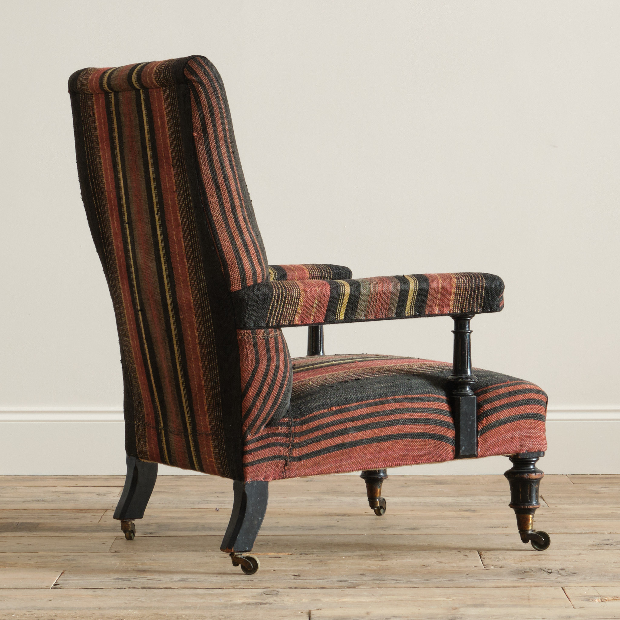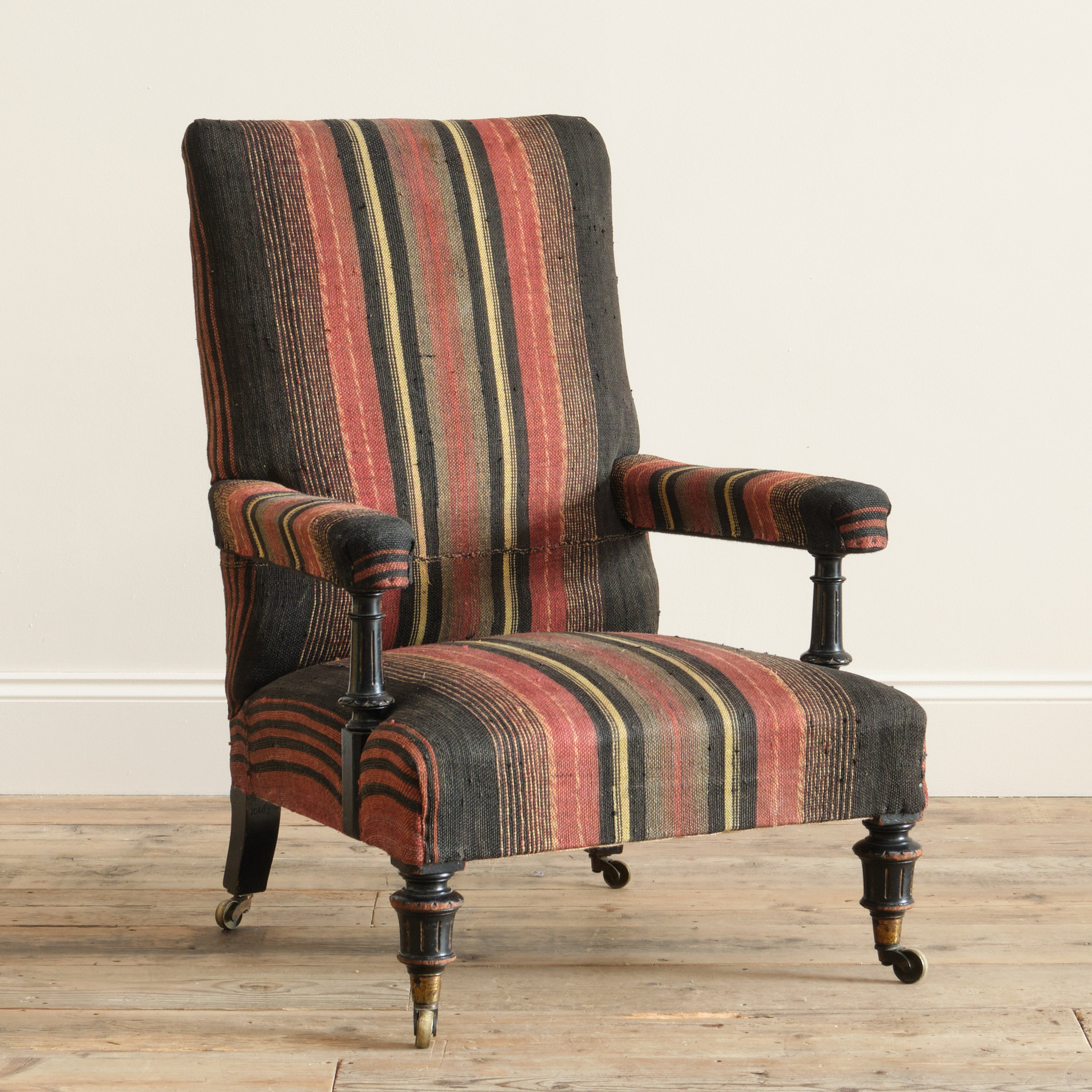 A mid 19th century country house open armchair. Raised on ebonized turned and carved walnut front legs and arm supports. The rear legs splayed and chamfered and all legs with the original casters. C1860 and almost certainly by Gillows of Lancaster.