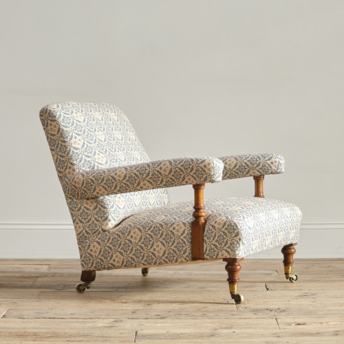 A superb little mid 19th century open armchair by Holland & Sons - London. C 1860. Raised on walnut turned and fluted legs and arm supports with splayed rear legs. One back leg bearing the makers stamp.