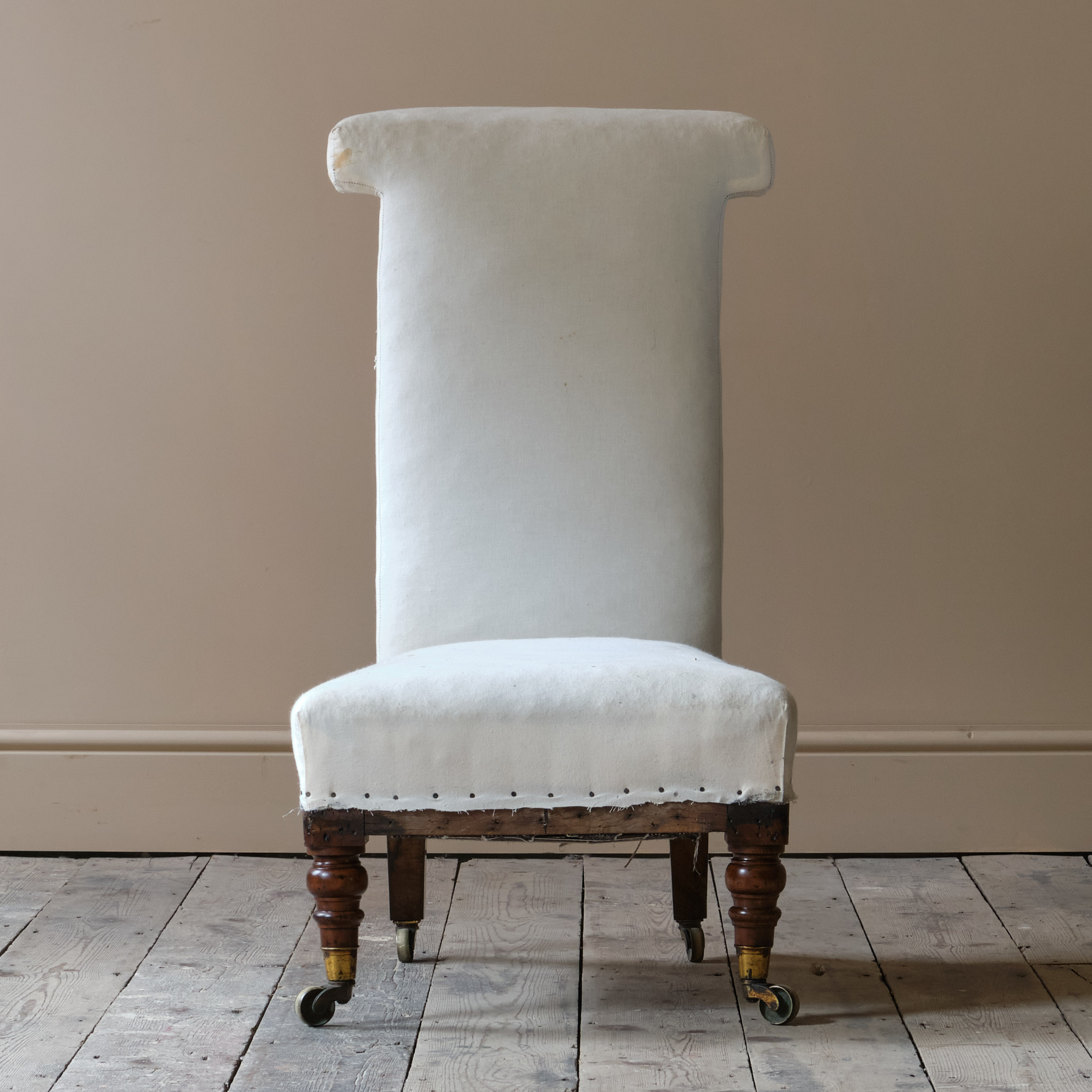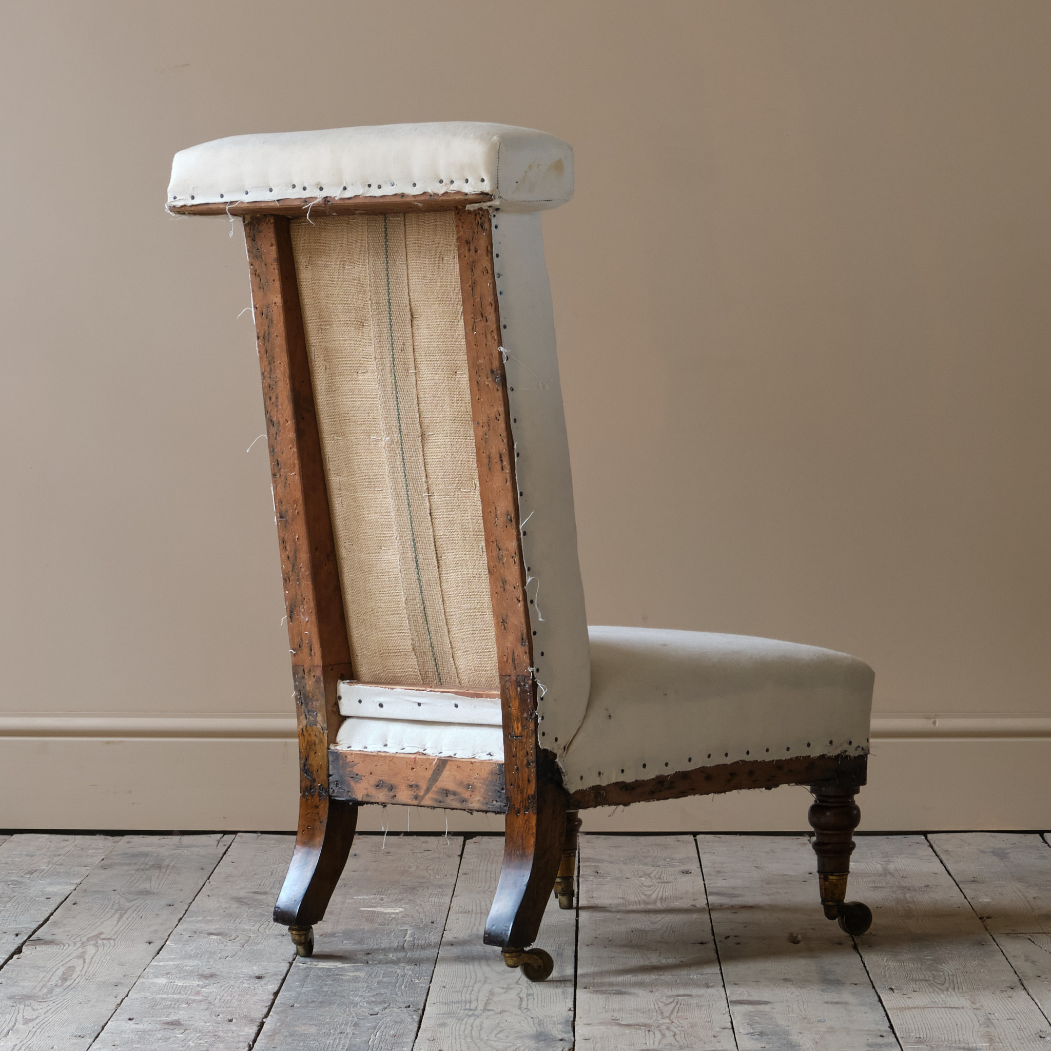 A mid 19th century prayer or side chair firmly attributed to Howard & Sons London, England c1840. Raised on walnut legs and brass casters.