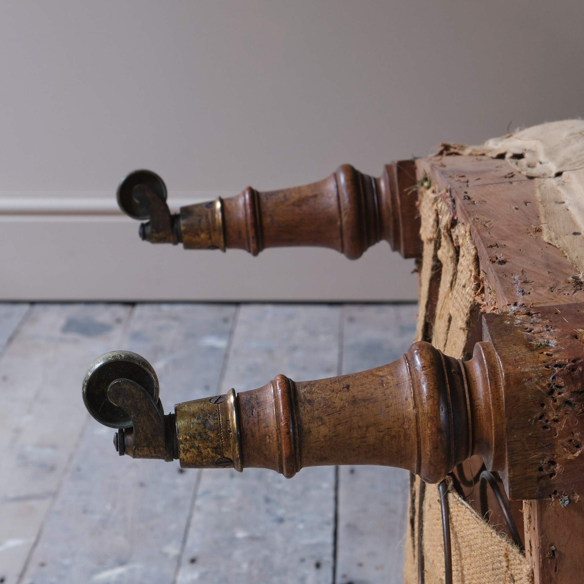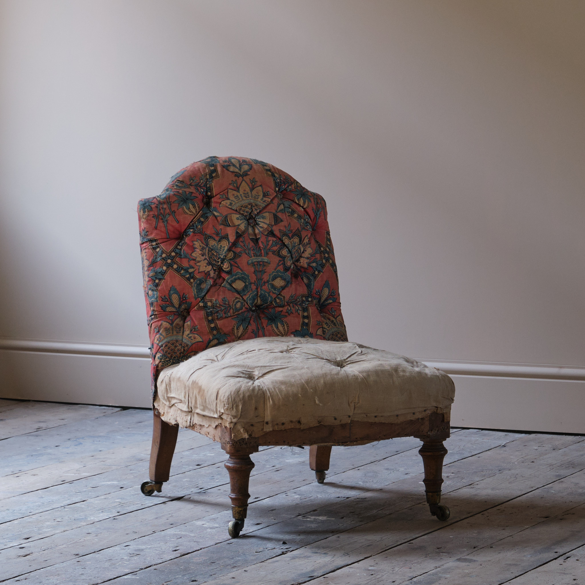 A good quality little mid 19th century slipper chair. Raised on walnut legs and the original Cope & Collinson brass casters. Retaining its original buttoned upholstery to the seat and back.